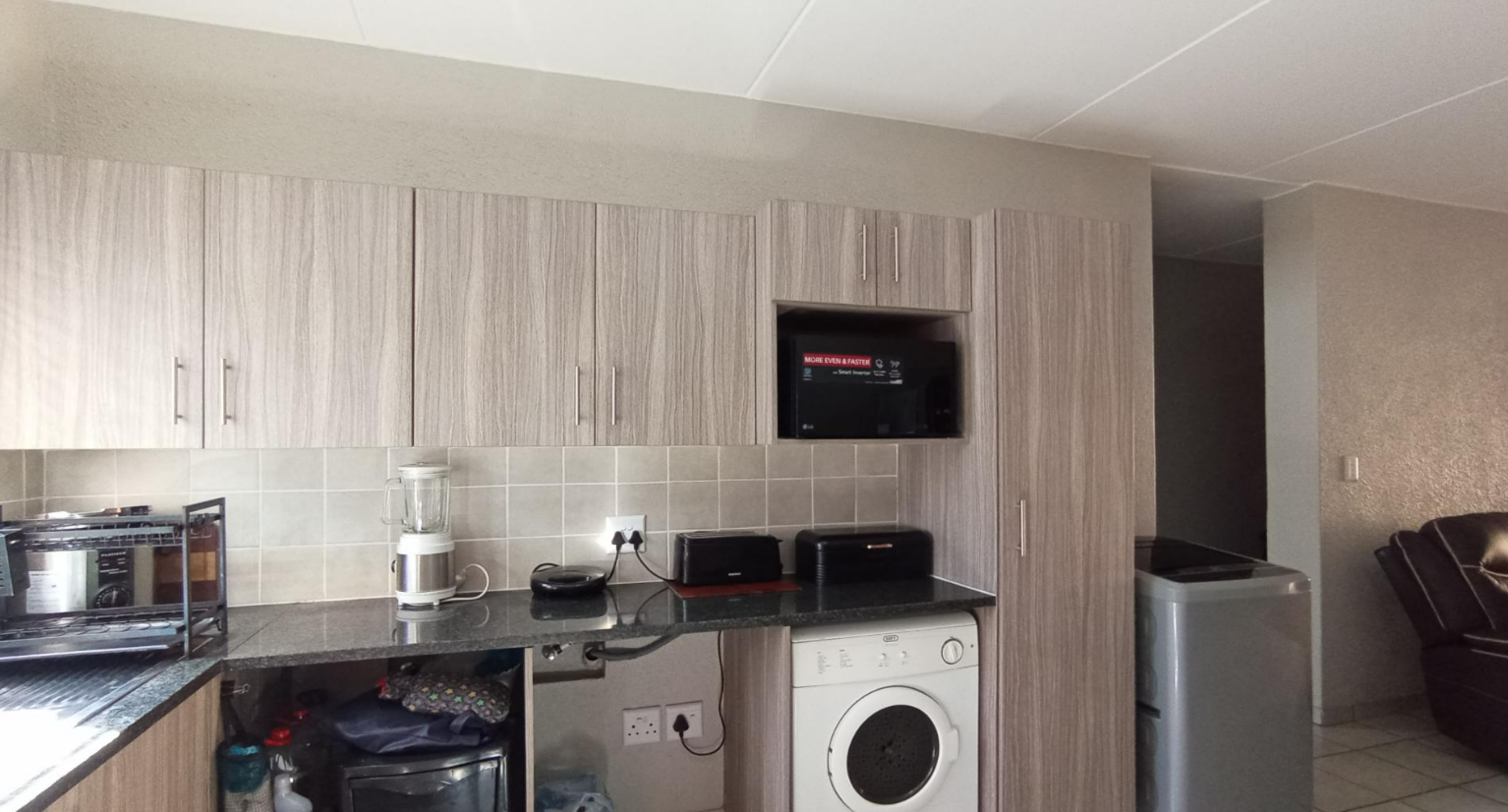 Discover this inviting 3-bedroom, 2-bathroom residence situated within the secure Cobble Stone complex in Klippoortje, Germiston. The property offers a comfortable 106 sqm of living space, designed for modern convenience and peace of mind. The complex entrance features secure gated access with a guardhouse and electric fencing, ensuring a safe environment for residents. The interior boasts an open-plan layout, seamlessly connecting the lounge and dining areas, both featuring durable tiled flooring and ample natural light. The modern kitchen is well-appointed with light wood-grain cabinetry, dark granite-style countertops, an integrated oven and hob, and a stylish tiled backsplash, providing both functionality and aesthetic appeal. Accommodation includes three well-proportioned bedrooms, offering comfortable living spaces. The property features two bathrooms, with one being an en-suite, providing privacy and convenience. Built-in wardrobes are present, offering practical storage solutions within the bedrooms. Outside, residents can enjoy a private garden area, perfect for relaxation or outdoor activities. The property also includes one dedicated parking space. This home is ideal for those seeking a low-maintenance lifestyle within a well-managed and secure community. Security is paramount, with features such as an access gate, alarm system, and 24-hour security ensuring resident safety. Klippoortje, located in Germiston, South Africa, offers a suburban setting with convenient access to local amenities and transport routes. Key Features: * 3 Bedrooms, 2 Bathrooms (1 En-suite) * Open-plan Lounge and Dining Area * Modern Kitchen with Integrated Appliances * Tiled Flooring Throughout * Secure Gated Complex with 24-hour Security * Private Garden * 1 Parking Space * 106 sqm Floor Size