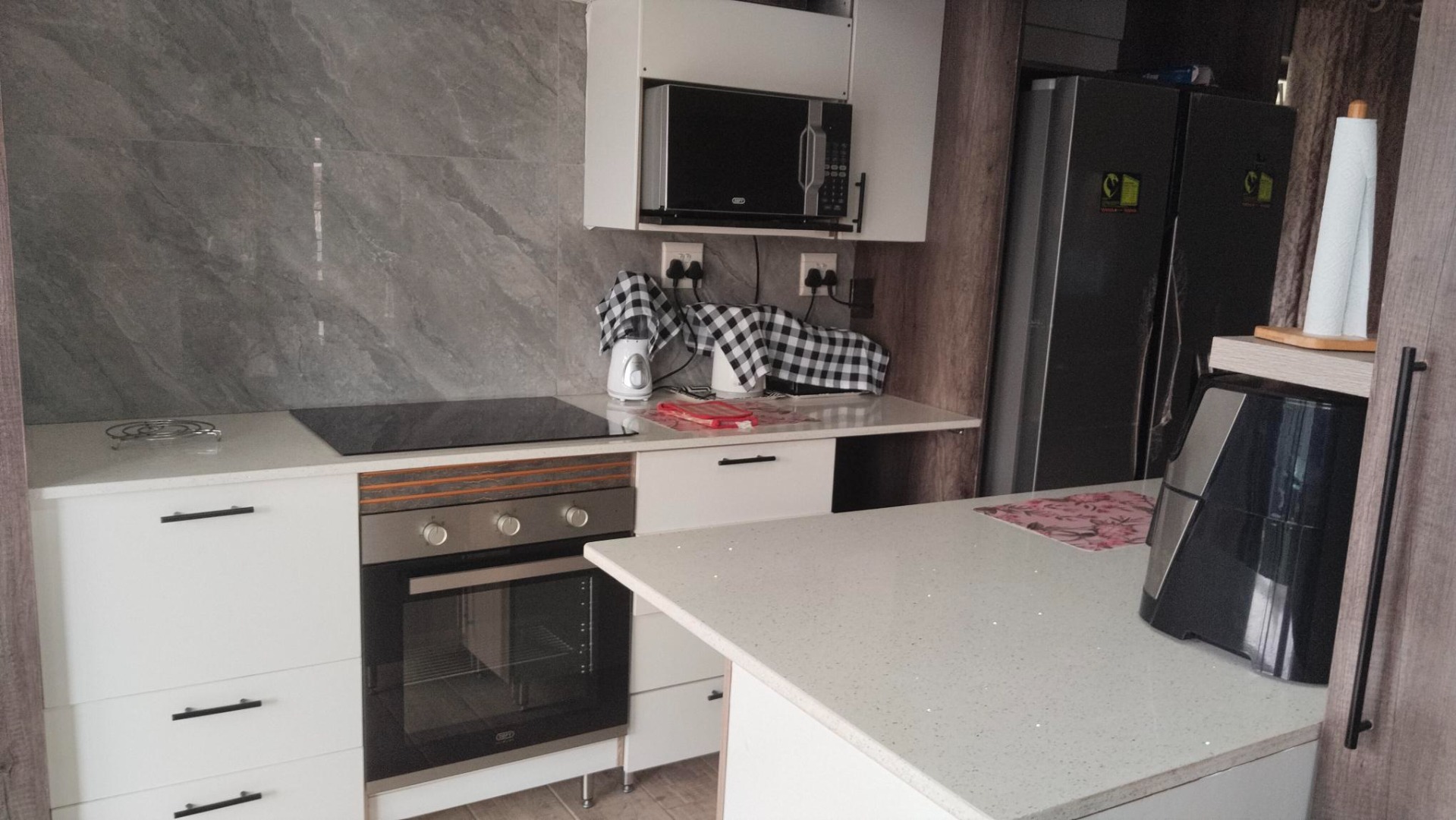 Step inside and you’ll find an open plan lounge area that’s ready for anything, . The heart of this home is definitely the modern kitchen, boasting sleek white cabinetry, light speckled countertops, and a stylish grey marble-look backsplash. It comes fully equipped with built-in appliances like an oven, induction hob, and microwave, plus a handy breakfast bar/island for quick meals. There's even a separate utility area with an integrated washing machine and direct access to the garden, making chores a breeze.