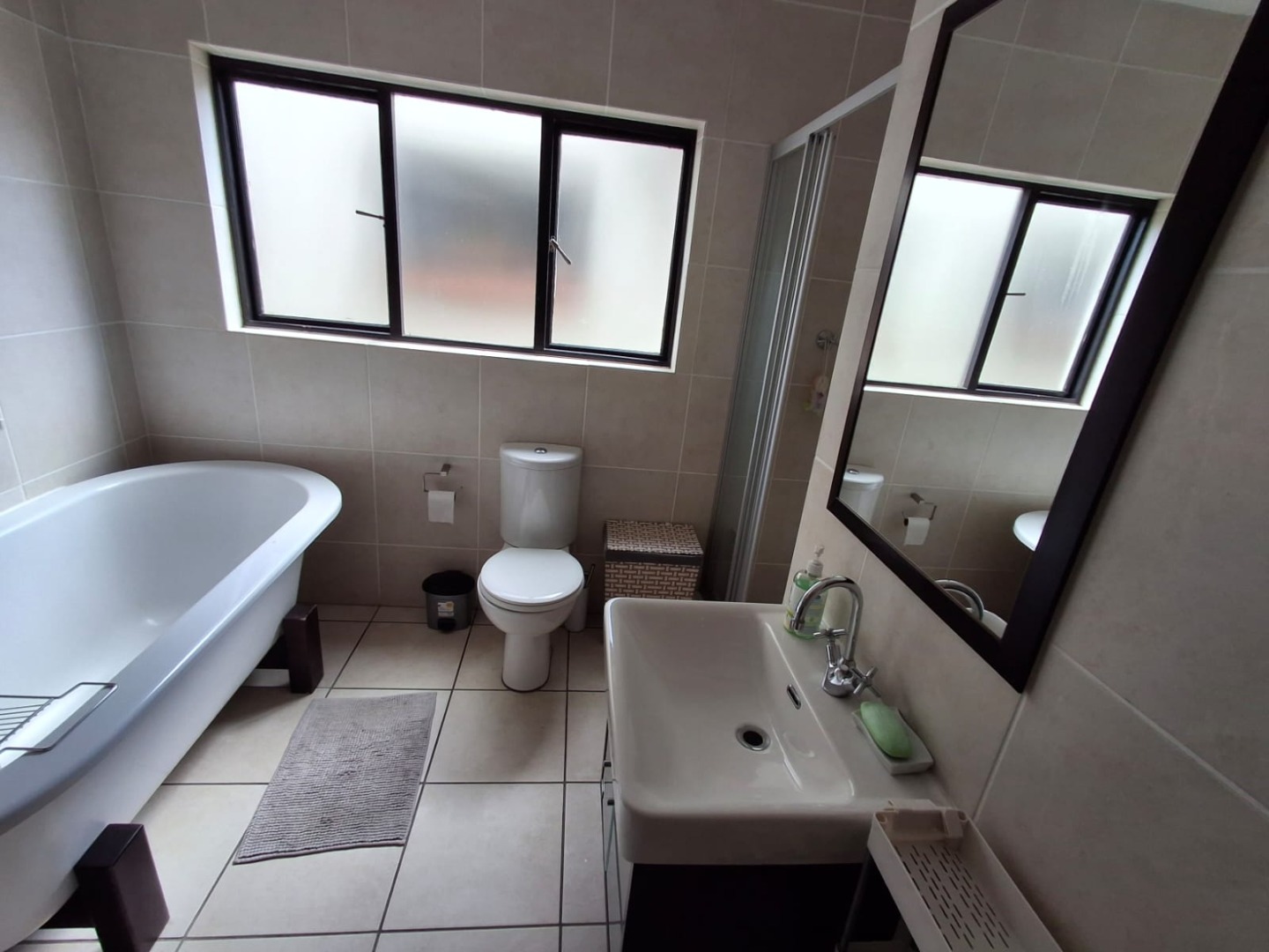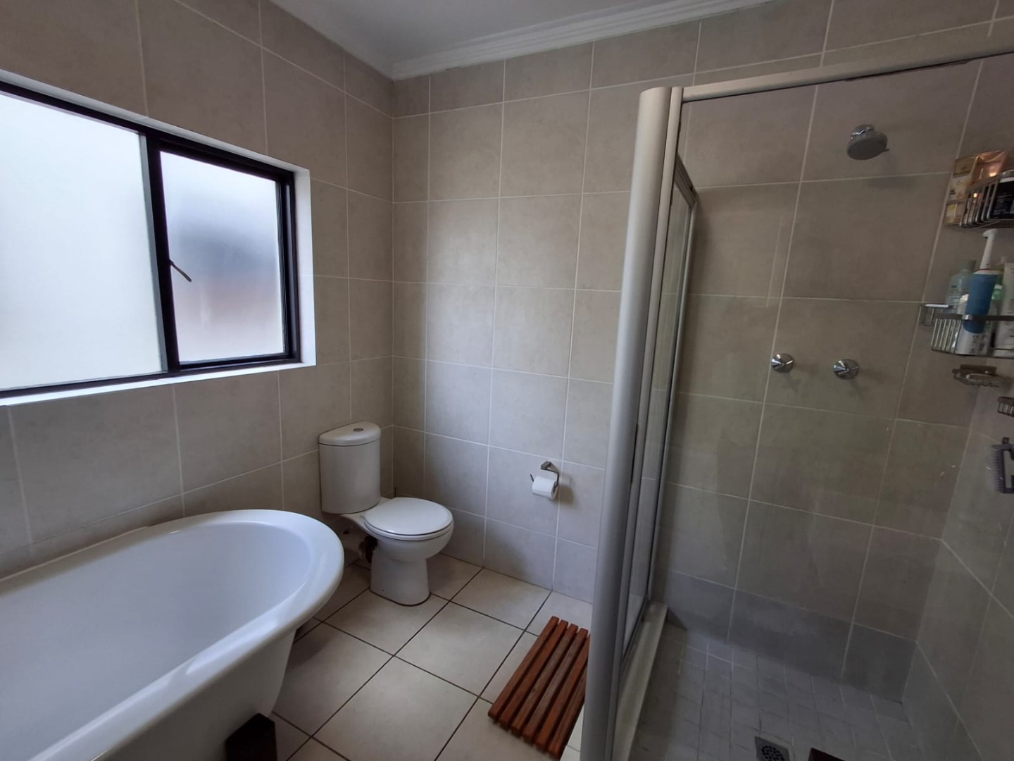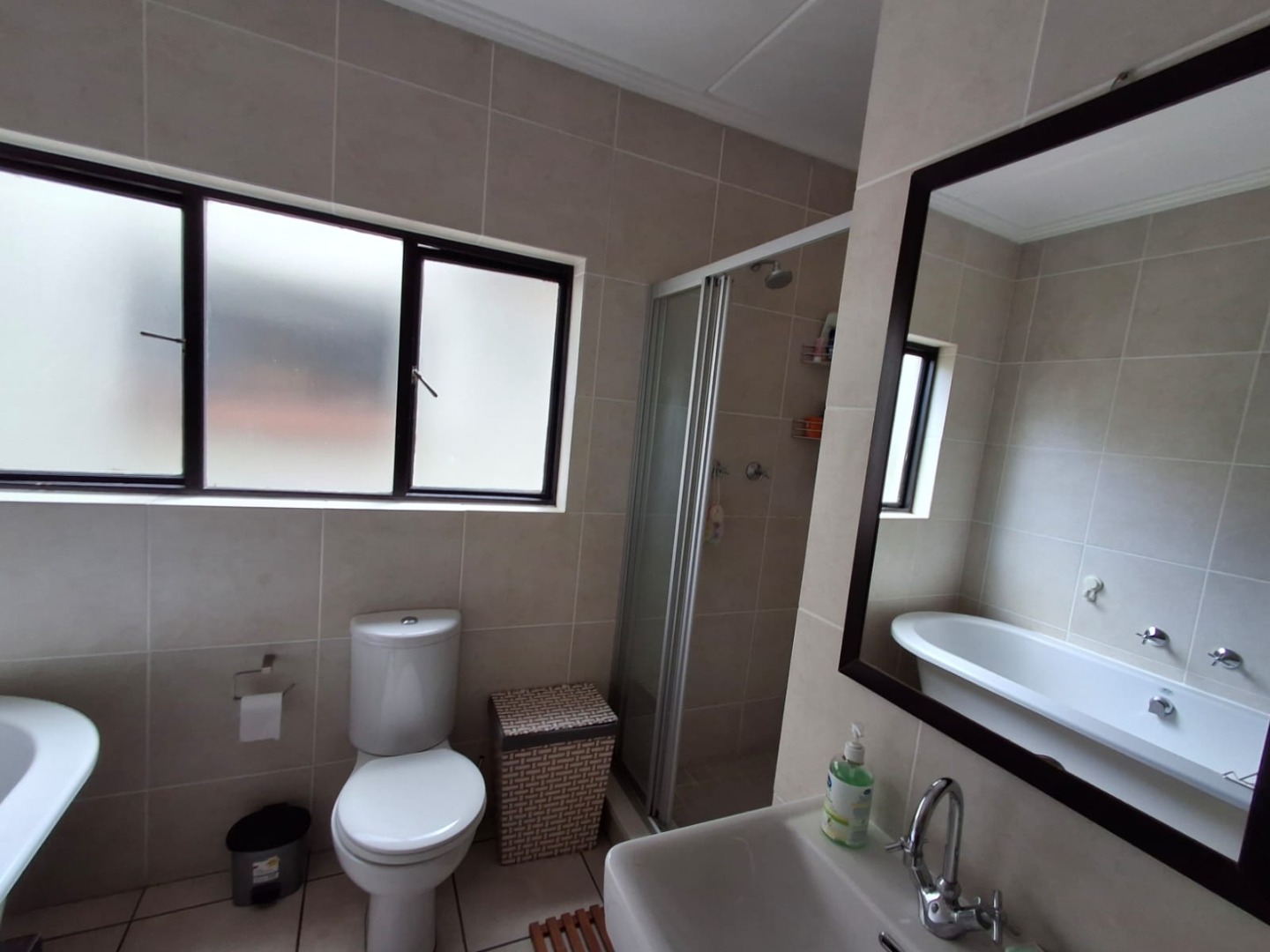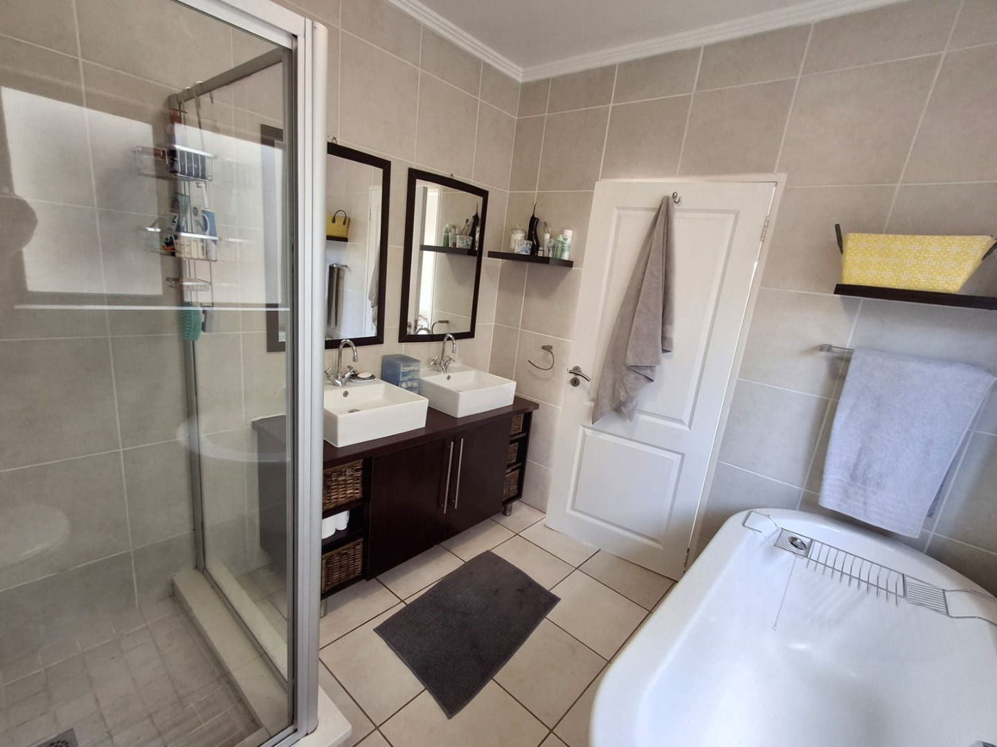 The home boasts three well-sized bedrooms, all with tiled floors and built-in cupboards. The spacious master bedroom is a true retreat, complete with a full en-suite bathroom featuring a bath, shower, toilet, and elegant his-and-hers vanity basins. The second bathroom is equally well appointed with a bath, shower, toilet, and vanity basin.