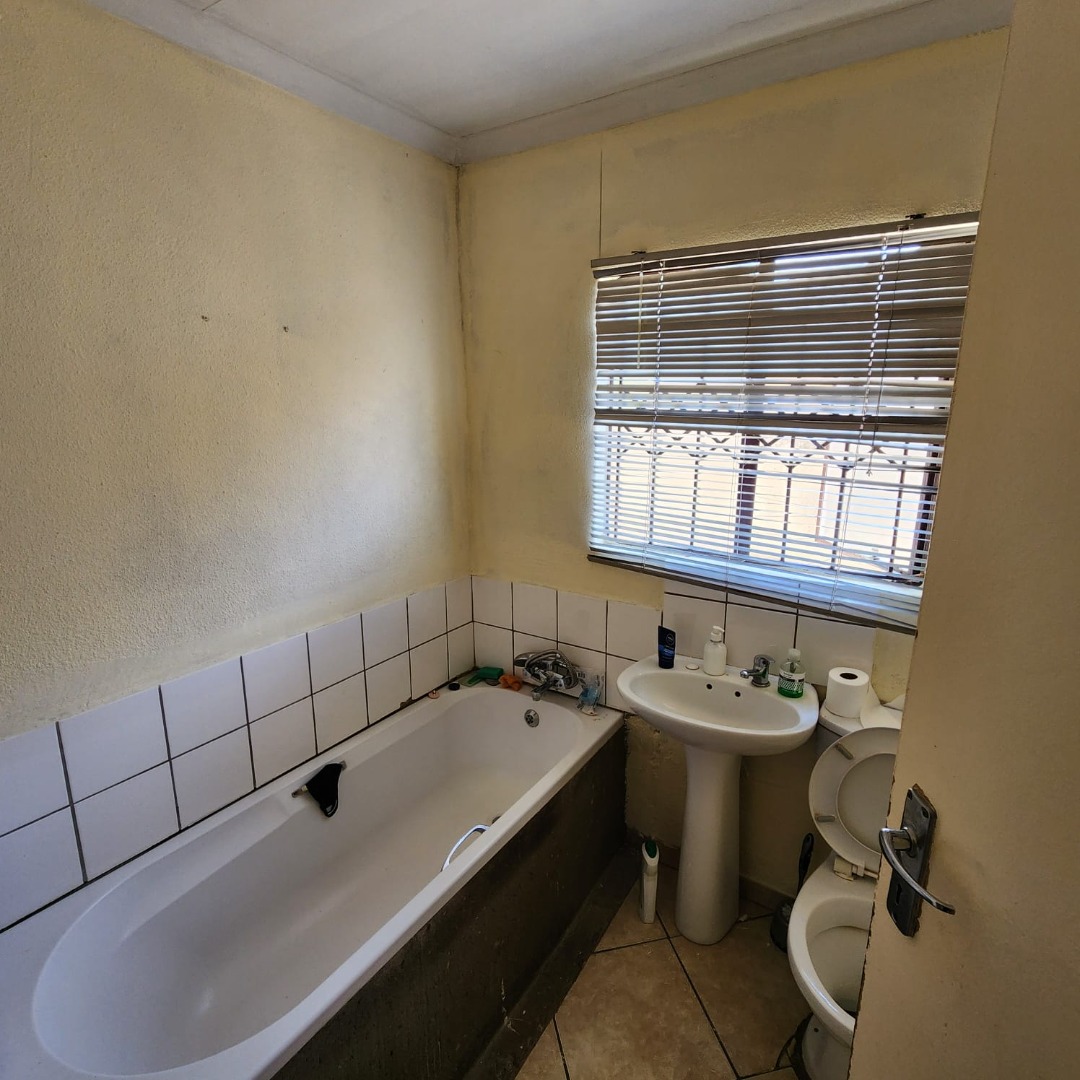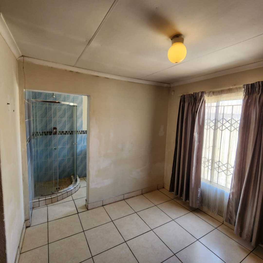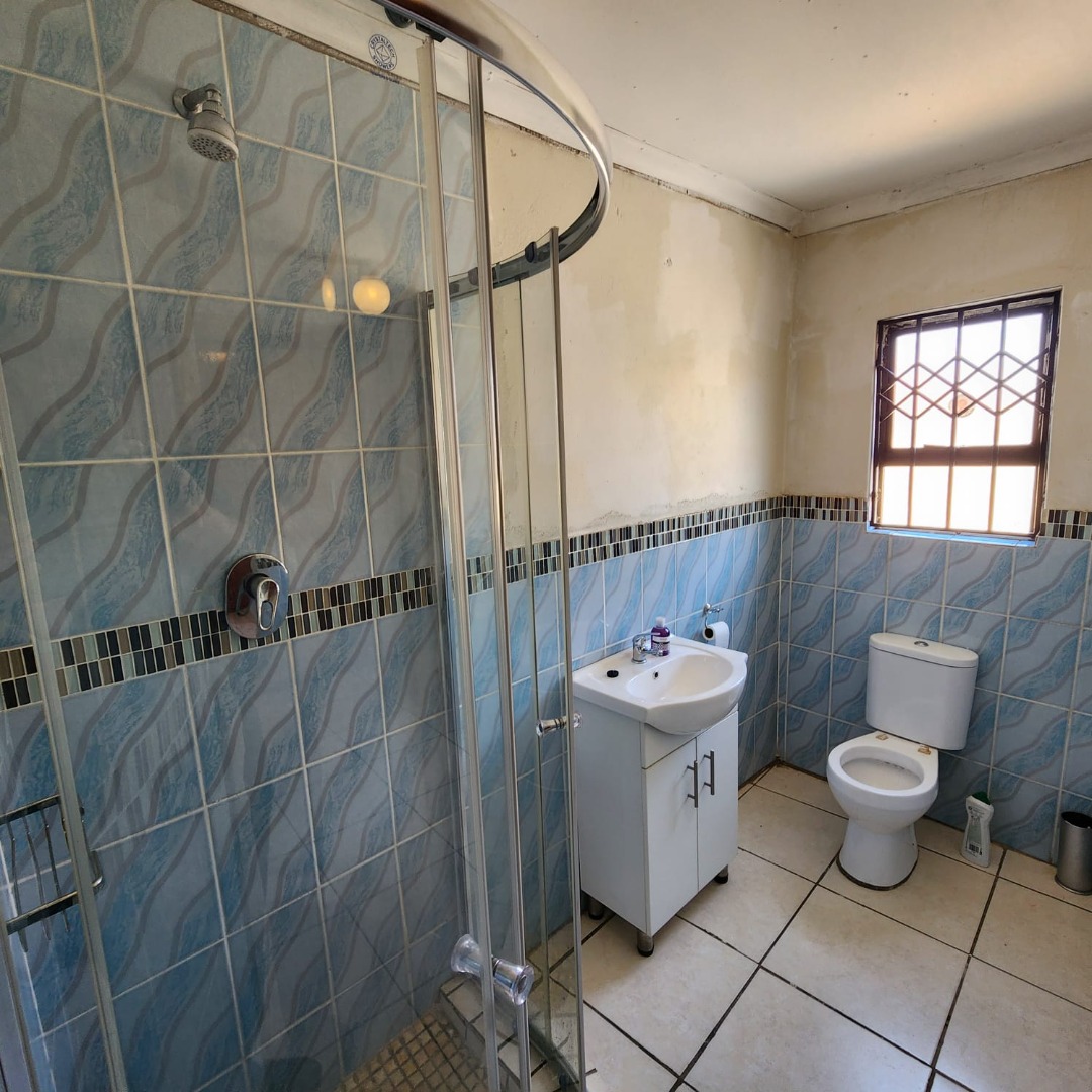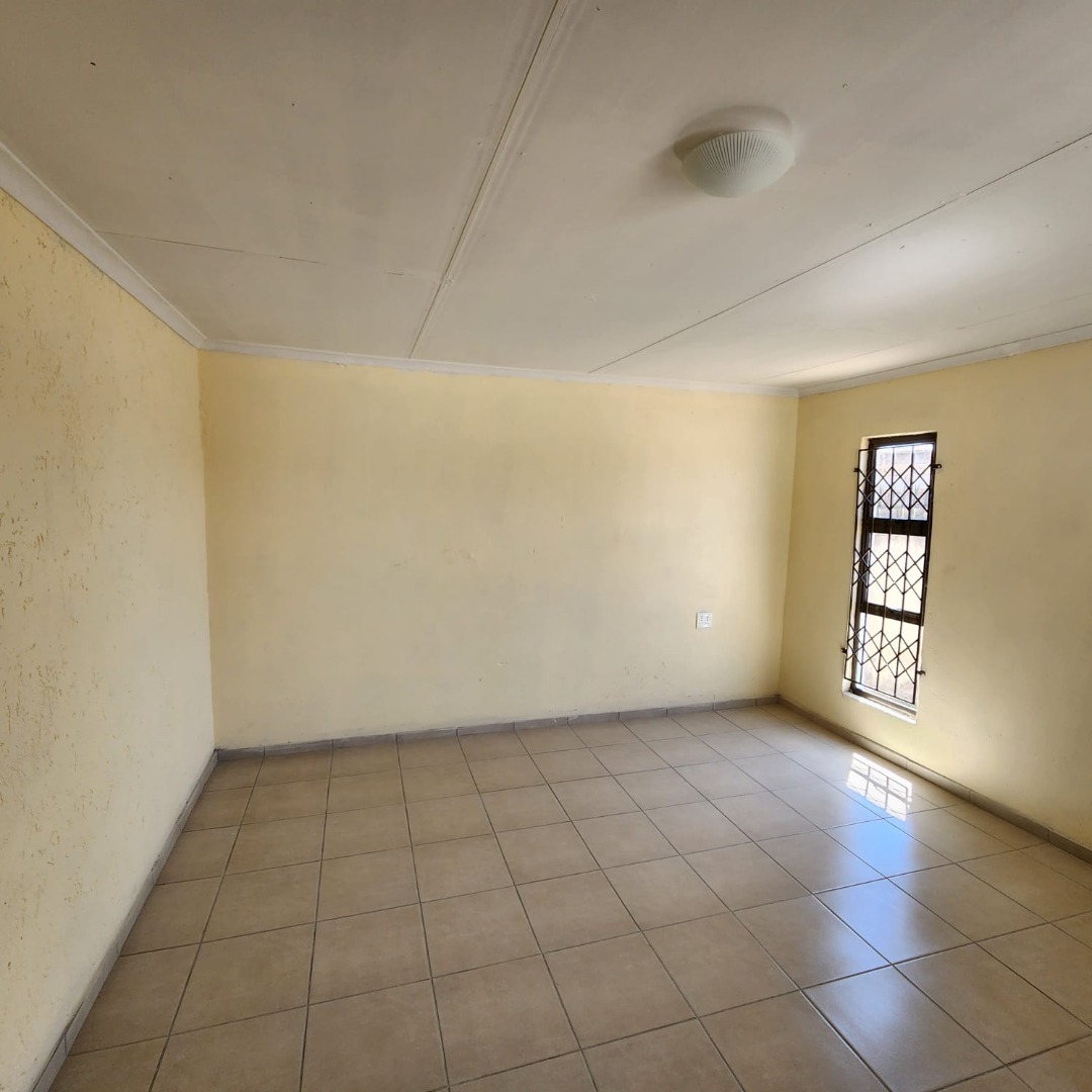 The residence comprises three well-proportioned bedrooms, each fitted with durable tiled and carpeted flooring. One bedroom benefits from a private en-suite bathroom, while a second full bathroom serves the remaining rooms. Both bathrooms are practical, featuring essential fixtures, tiled floors, and windows secured with burglar bars for peace of mind.