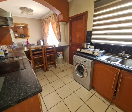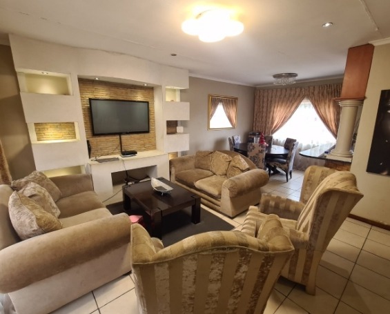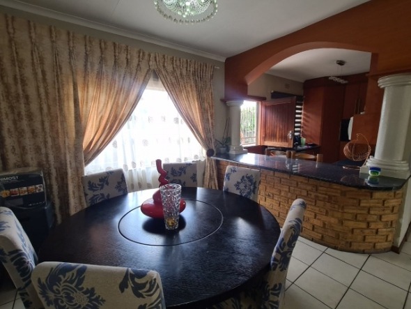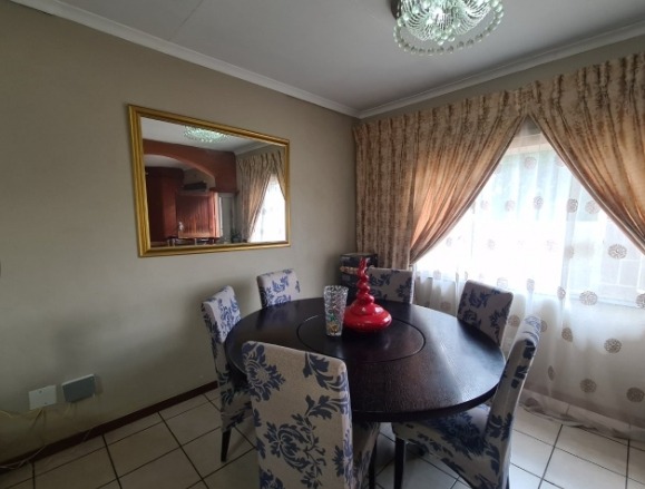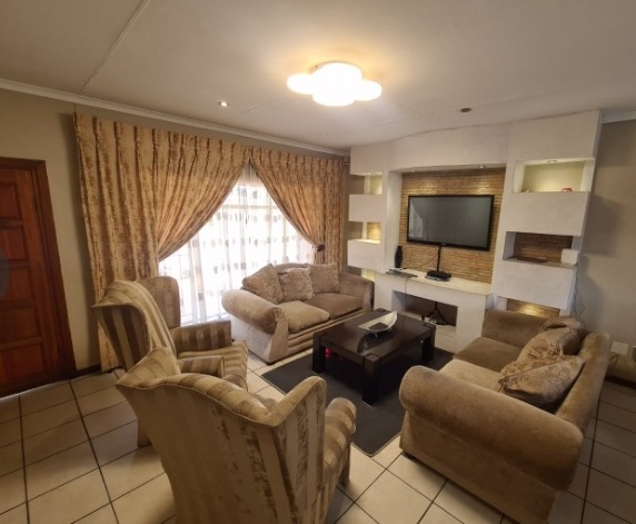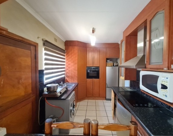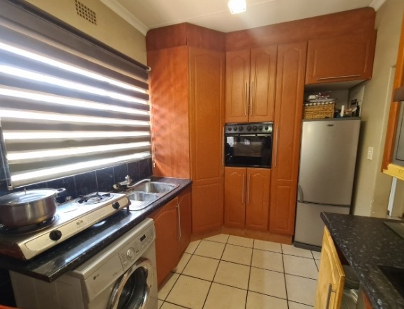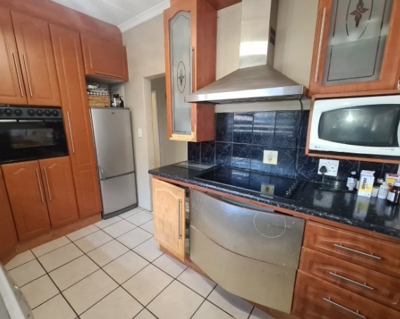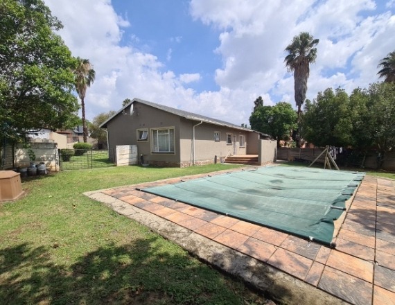 Discover this charming single-story residence set on a generous 964 sqm erf, offering a welcoming kerb appeal with its well-maintained front lawn and mature trees. The neutral-toned exterior and dark tiled roof present a classic aesthetic, providing a serene backdrop for comfortable living. This property is designed for ease of access and practical family life, making a solid first impression. Step inside to an inviting open-plan layout, seamlessly connecting the lounge and dining areas. Tiled flooring extends throughout these spaces, complemented by a custom-built media unit in the living room, complete with decorative shelving and accent lighting. The functional kitchen boasts ample wooden cabinetry, dark countertops, and essential appliances including a gas stovetop, oven, and space for a washing machine, all centered around a convenient breakfast bar that fosters social interaction. The home features three comfortable bedrooms, providing private retreats for the entire family. These are serviced by two well-appointed bathrooms, ensuring convenience and functionality for daily routines. Outside, the expansive garden offers a private oasis, perfect for relaxation and outdoor activities. A covered swimming pool promises refreshing enjoyment during warmer months, while the single garage provides secure parking and additional storage. The large erf size allows for further landscaping possibilities or outdoor entertainment setups. Key Features: * 3 Bedrooms, 2 Bathrooms * Open-plan Lounge & Dining Area * Functional Kitchen with Breakfast Bar * Single Garage * Covered Swimming Pool * Expansive 964 sqm Erf * Well-maintained Garden * Tiled Flooring Throughout