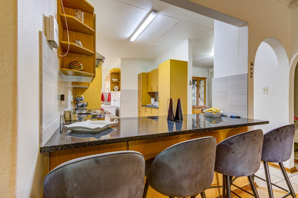 Stylish open-plan kitchen with granite countertops, breakfast counter, tiled floors, and wooden cabinets
