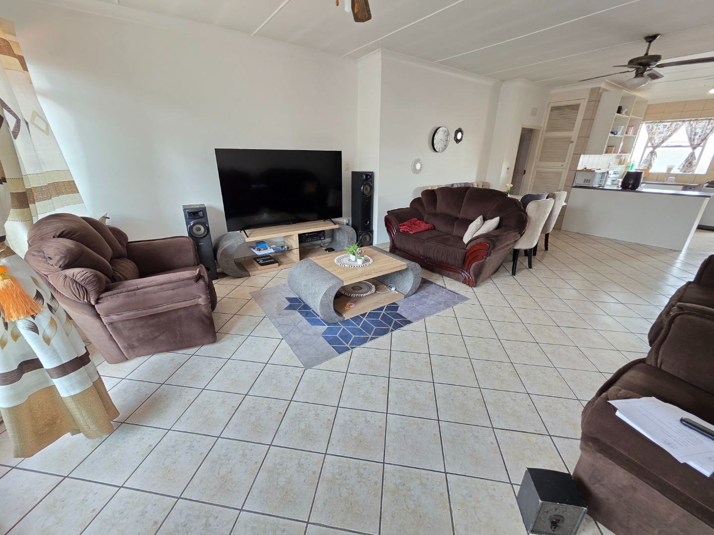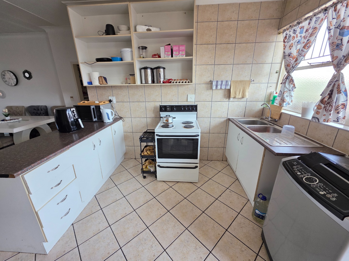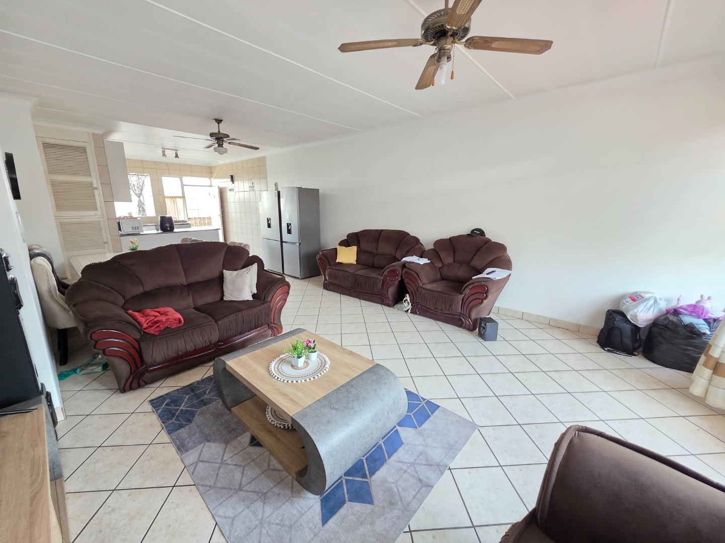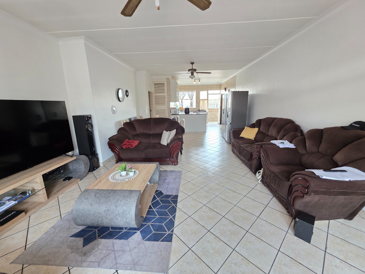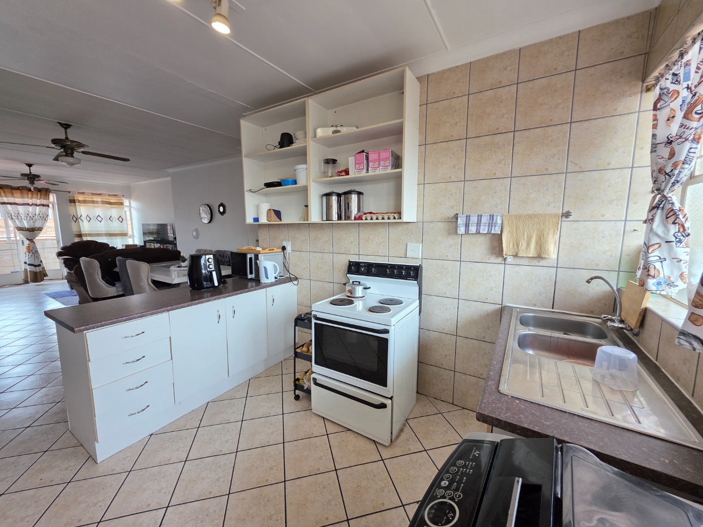 The interior features a bright and spacious open-plan lounge and dining area, benefiting from ample natural light and equipped with ceiling fans for comfort. Practical tiled flooring extends throughout, ensuring easy maintenance. The functional kitchen, complete with a double sink and space for appliances, seamlessly connects to the living space, ideal for everyday convenience.