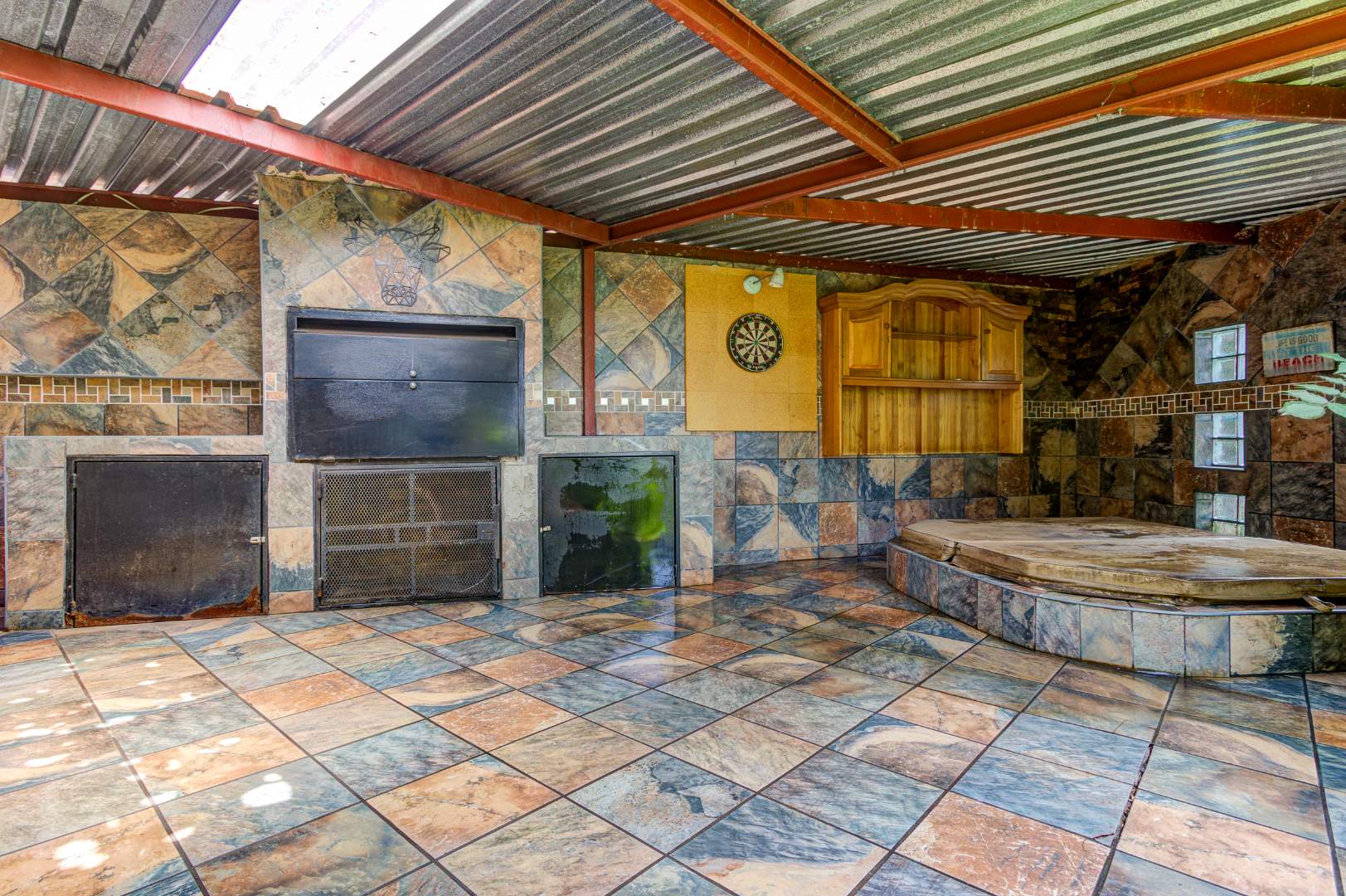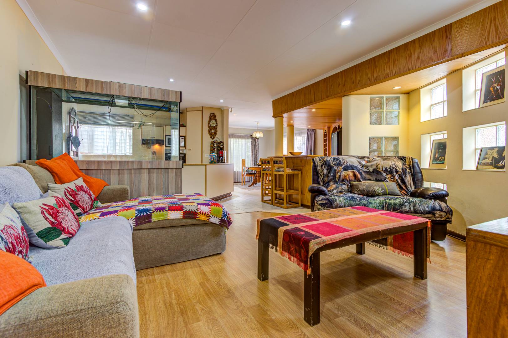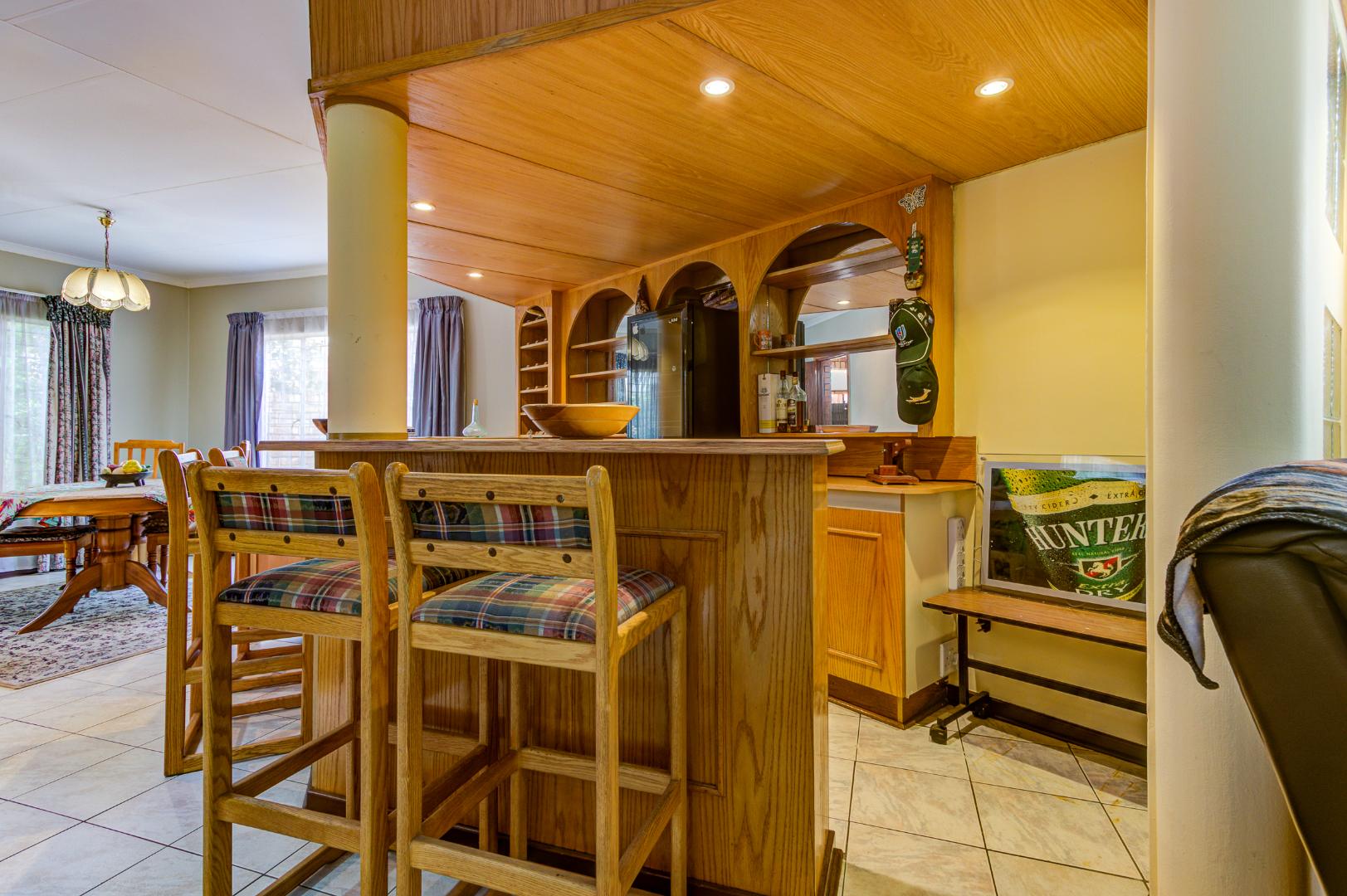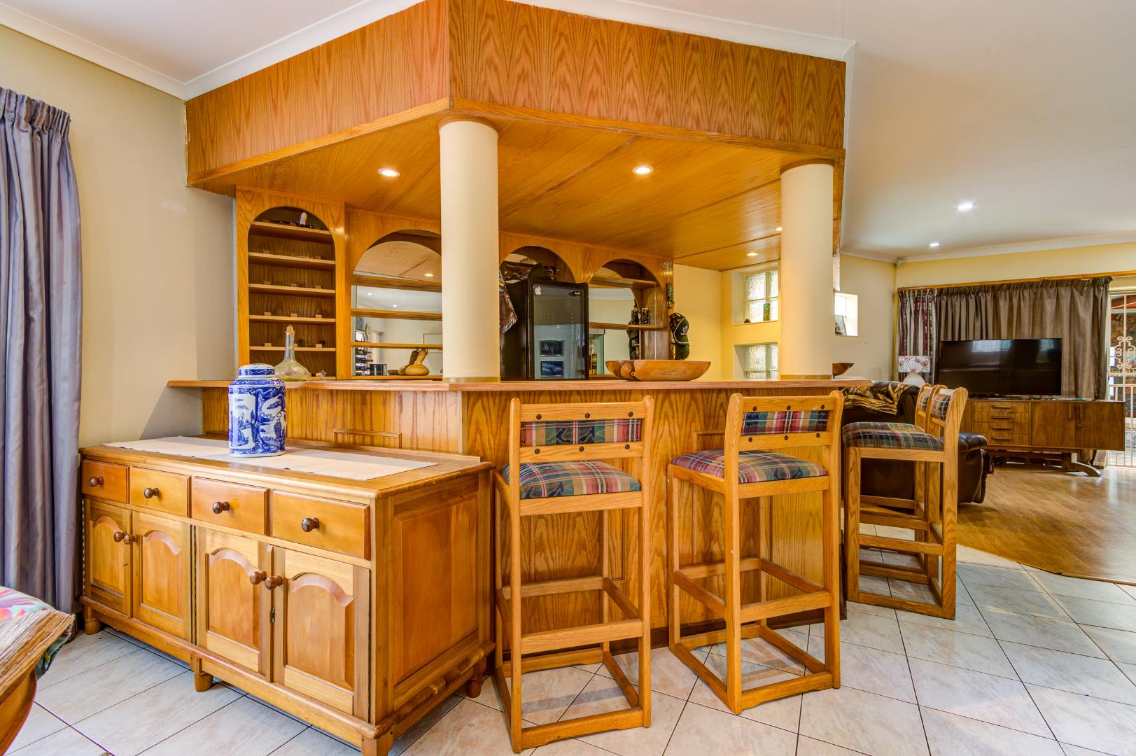 Step inside to an interior designed for comfortable living and entertaining. The open-plan layout seamlessly connects the lounge and dining areas, featuring a mix of laminate and tiled flooring. A dedicated family/TV room provides additional space. A highlight is the impressive built-in wooden bar, complete with shelving and integrated lighting, creating an ideal setting for social gatherings and an outdoor braai room.