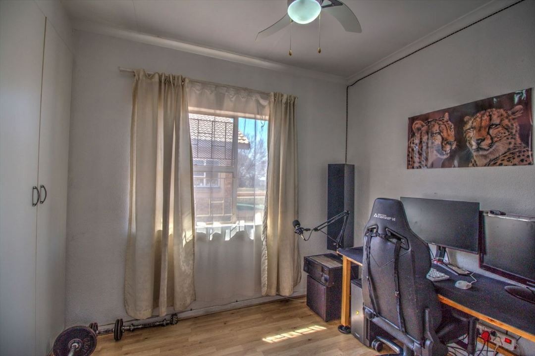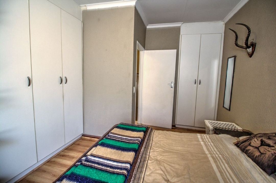 The tiled open-plan lounge features a sliding door that fills the home with natural light and leads out to the private garden, ideal for quiet relaxation or small pets—cats are allowed. The kitchen is practical and well-designed, complete with a combo scullery, small laundry area, and a handy pantry cupboard.