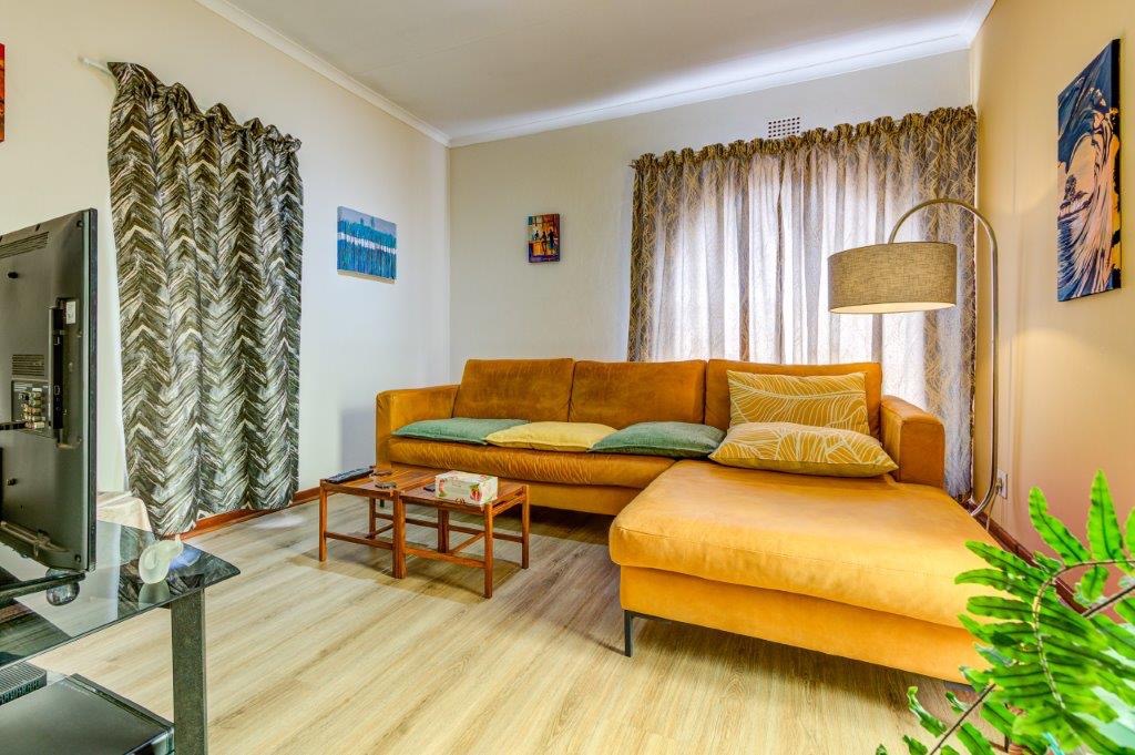 Open-plan laminated lounge with sliding door leading to an established private garden
