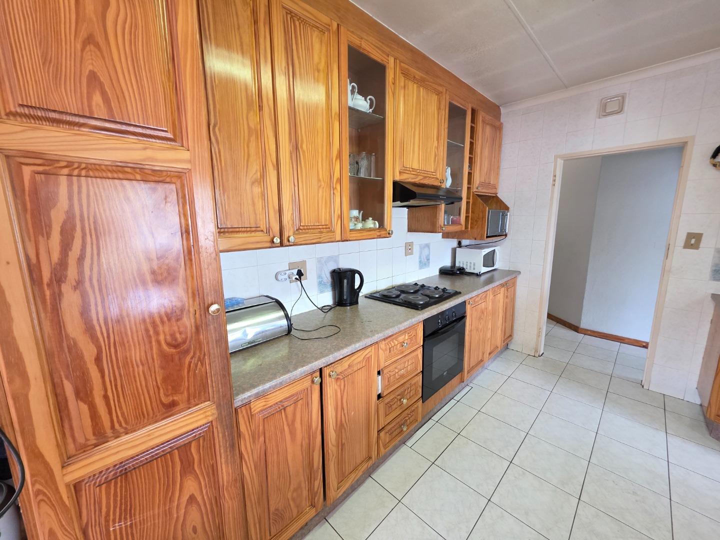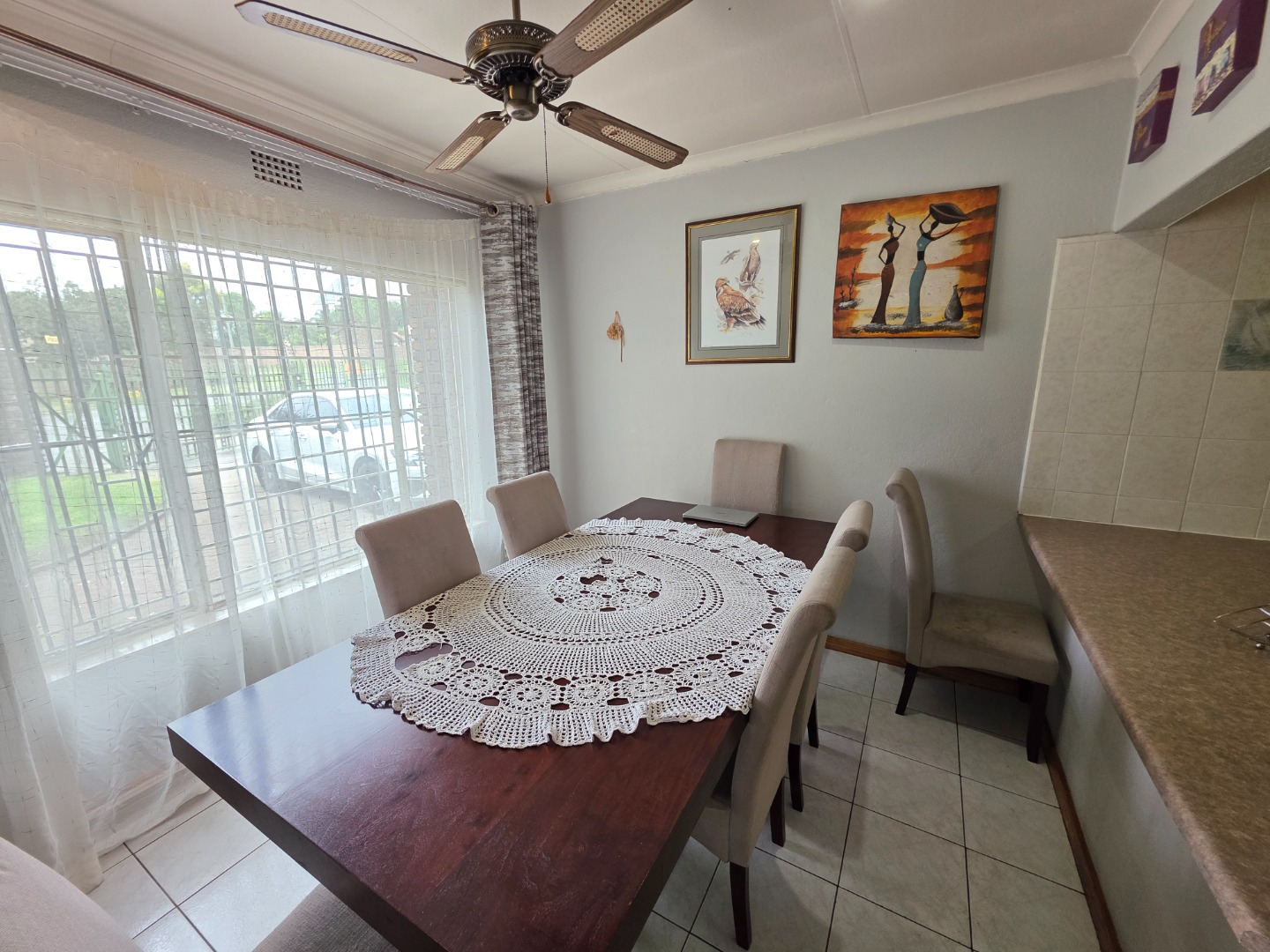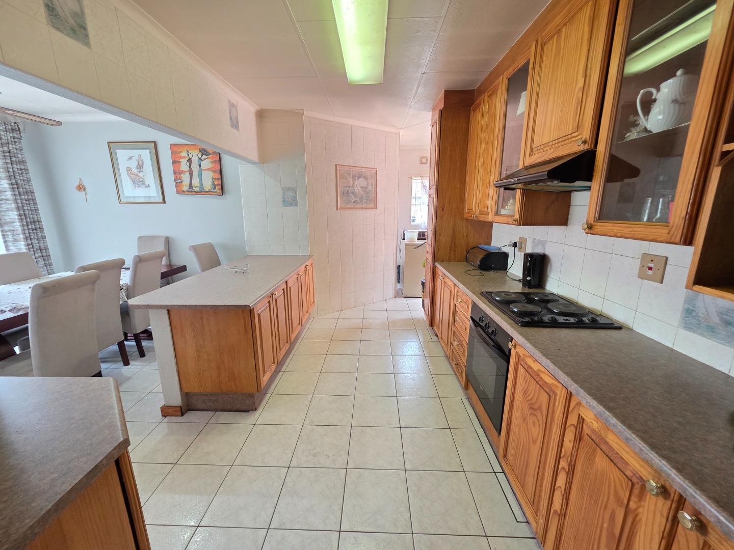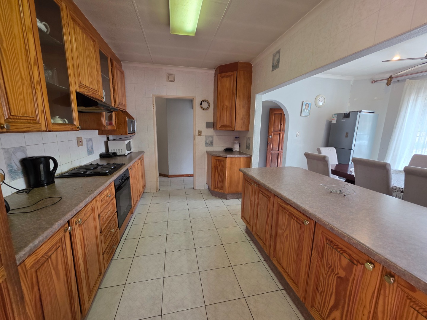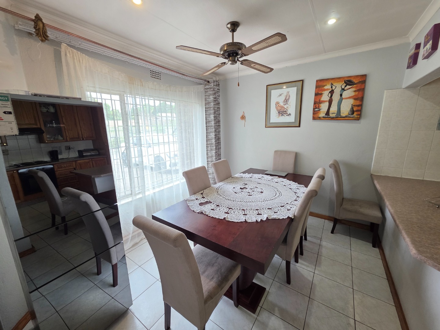 Step inside to find a spacious interior designed for comfortable living. The inviting lounge and dining areas are bathed in natural light from large windows, complemented by tiled flooring and ceiling fans. The functional kitchen, featuring ample wooden cabinetry, generous counter space, a built-in oven, and a hob, seamlessly connects to the dining area via a practical breakfast bar, ideal for family meals.