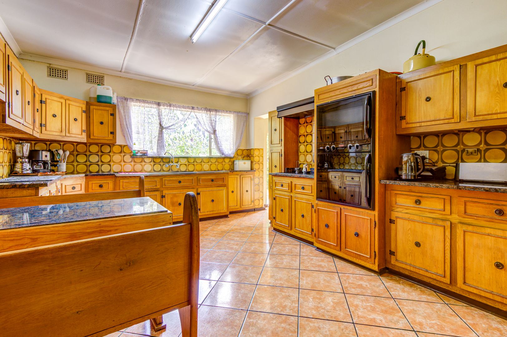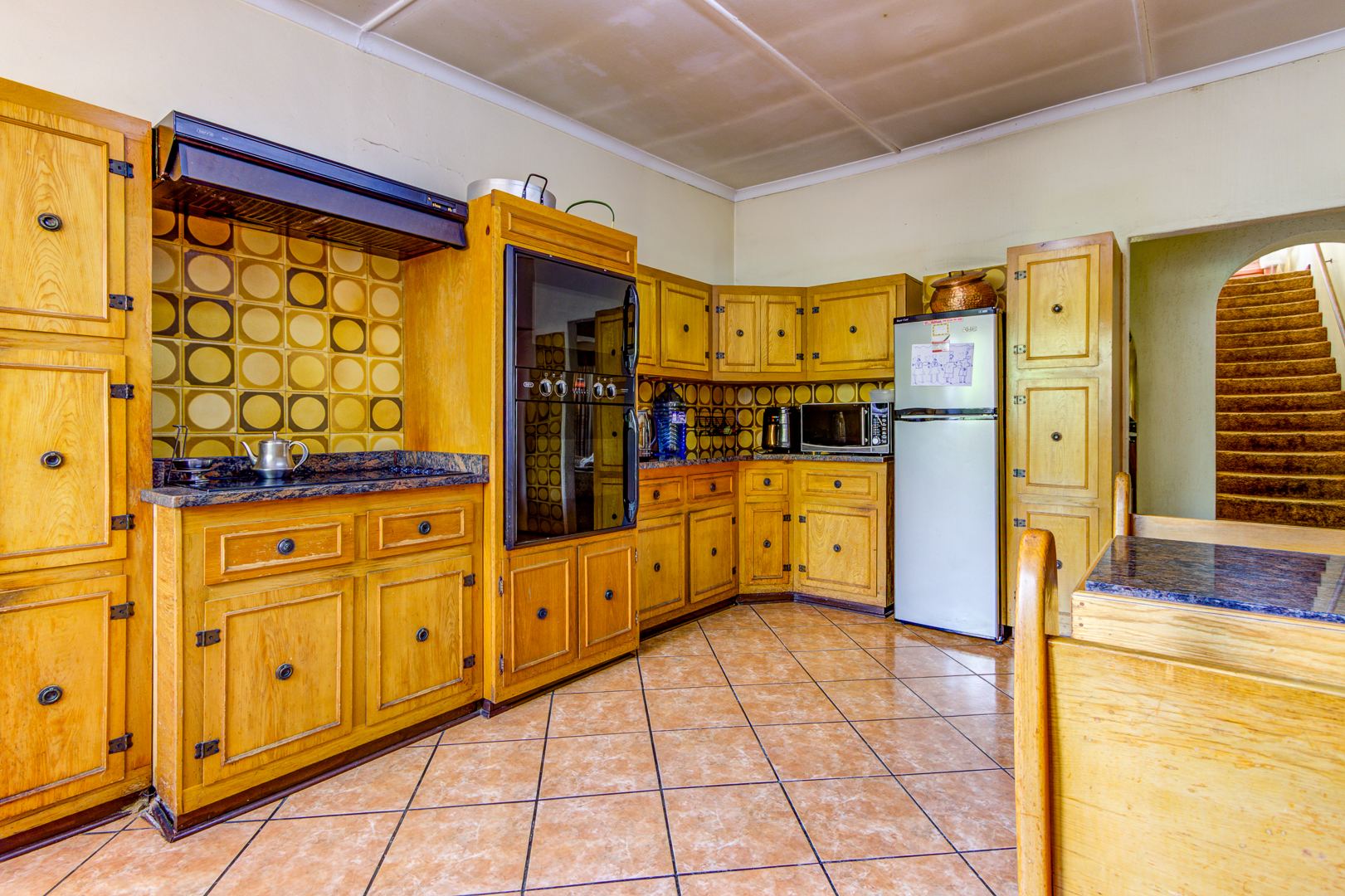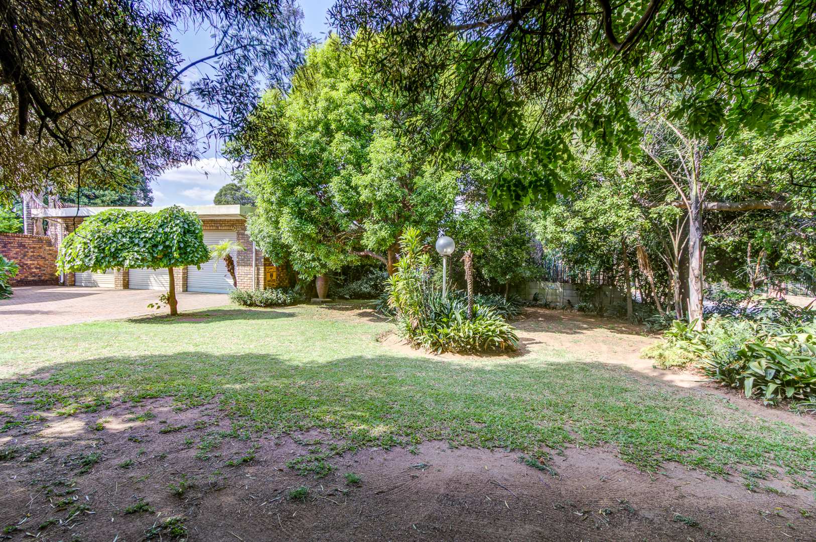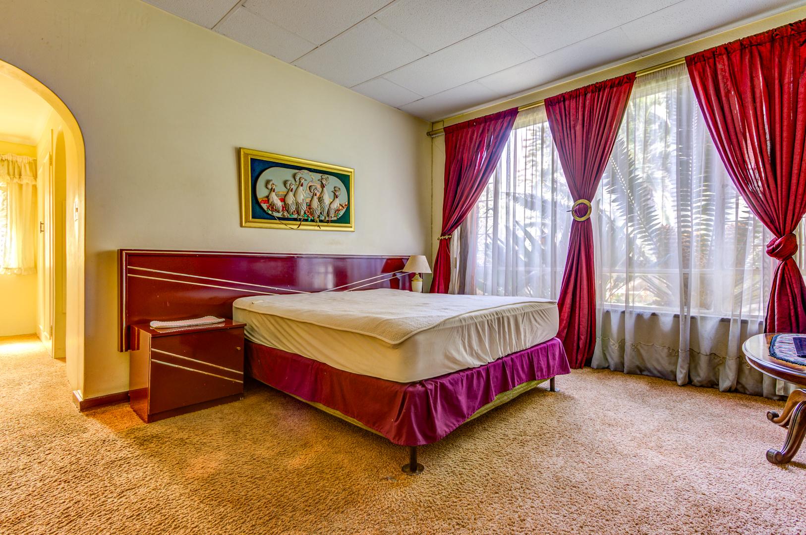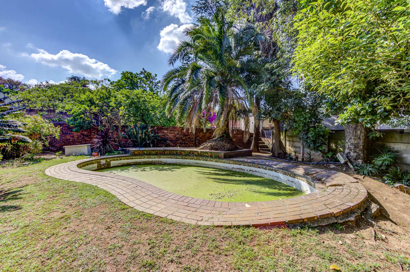 The exterior features a large garden with established trees, a covered patio perfect for outdoor entertaining, and extensive paving. A significant highlight is the kidney-shaped swimming pool, currently awaiting revival, which promises to be a focal point for leisure once restored. Practical amenities include four garages, an additional parking space, and staff quarters, enhancing the property's functionality. Security is addressed with burglar bars, and pets are allowed, making it a suitable family environment.