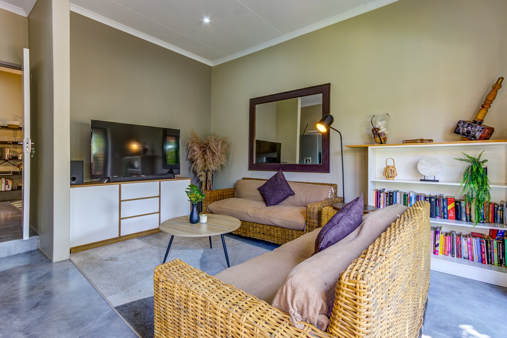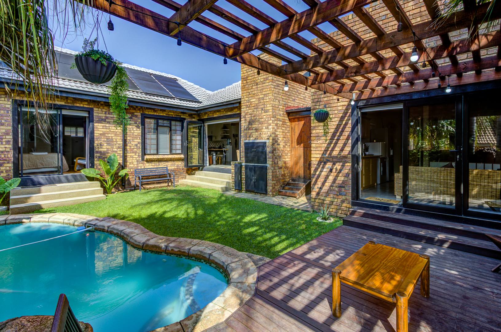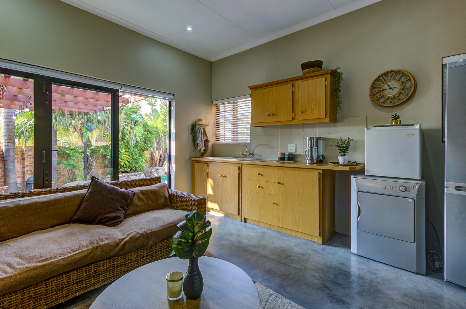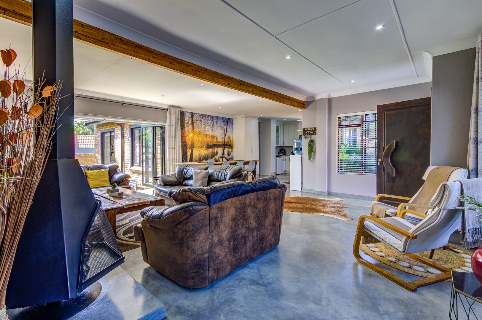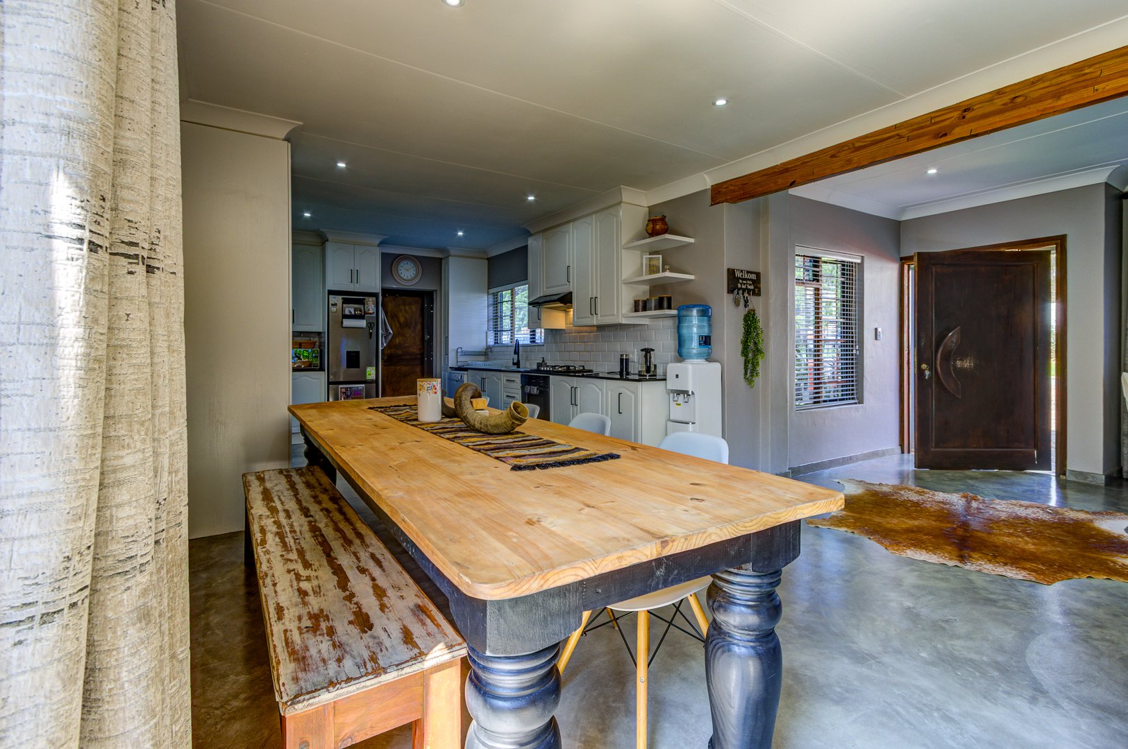 The lounge and dining area, the second lounge as well as the main bedroom opens up with sliding /Stackable doors to the entertainment area and pool. Both Lounges, dining and kitchen area consist of Epoxy flooring.