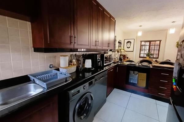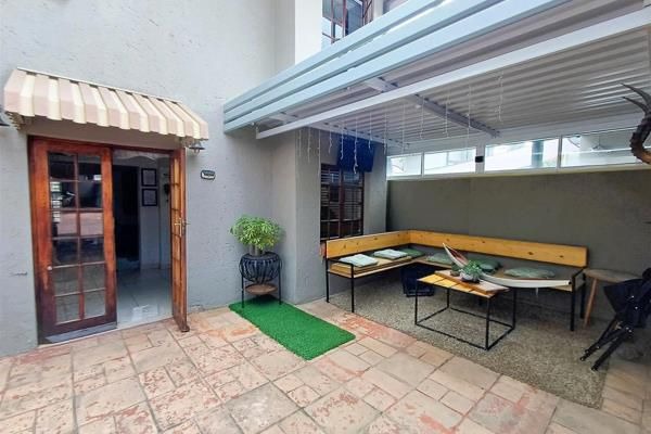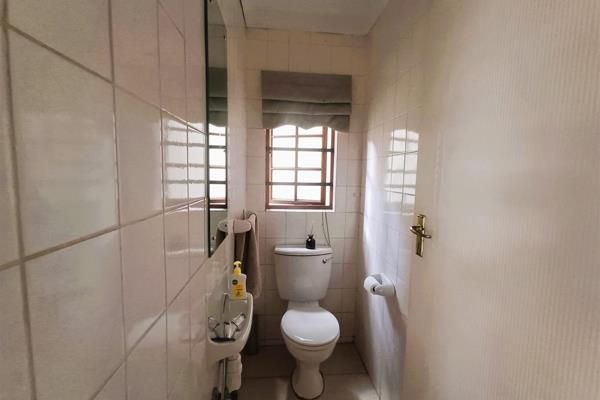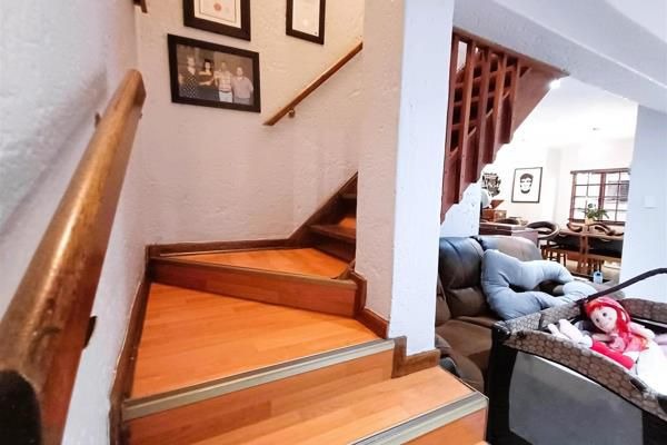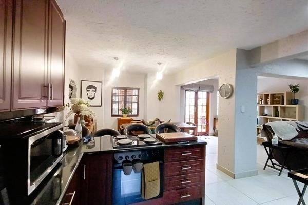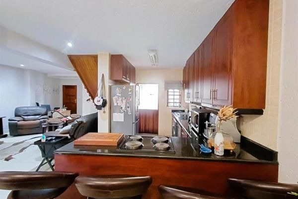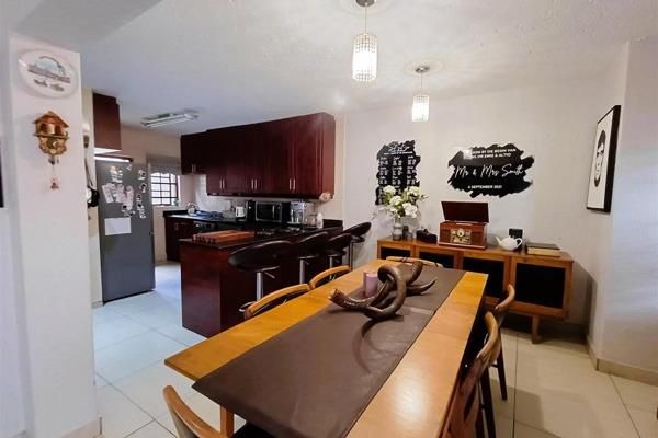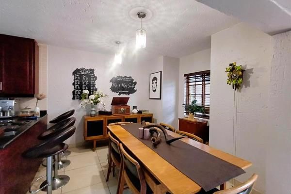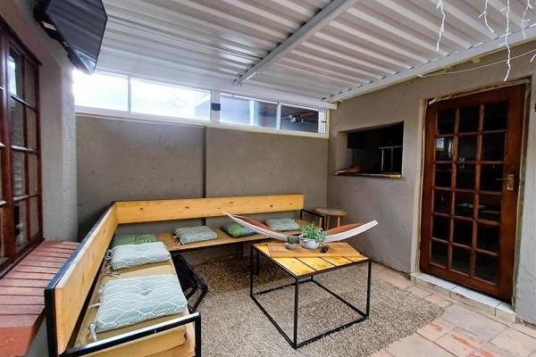 The open-plan lounge and dining area connect seamlessly to a beautifully finished rosewood kitchen, complete with granite countertops—perfect for preparing family meals or hosting with flair. The flow continues outdoors to a private entertainment space, featuring a covered patio with a built-in braai and a well-kept garden, creating the ideal setting for both relaxation and gatherings. A guest bathroom is conveniently situated downstairs.