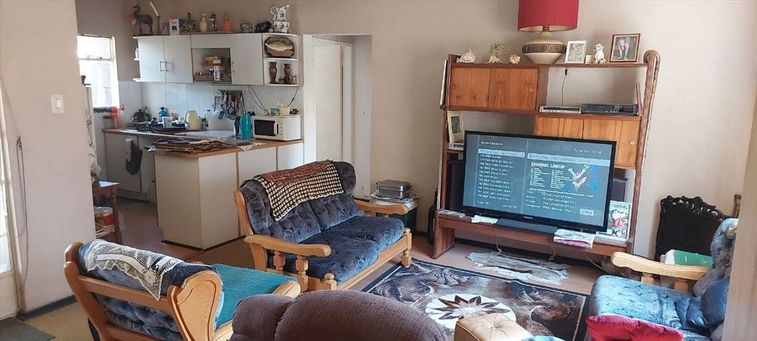 The home features an inviting open-plan lounge and dining area, both enhanced by wooden flooring that adds warmth and character. The open-plan kitchen offers a breakfast counter, melamine cabinetry, tiled floors and walls, and a combo scullery, along with a convenient pantry cupboard.