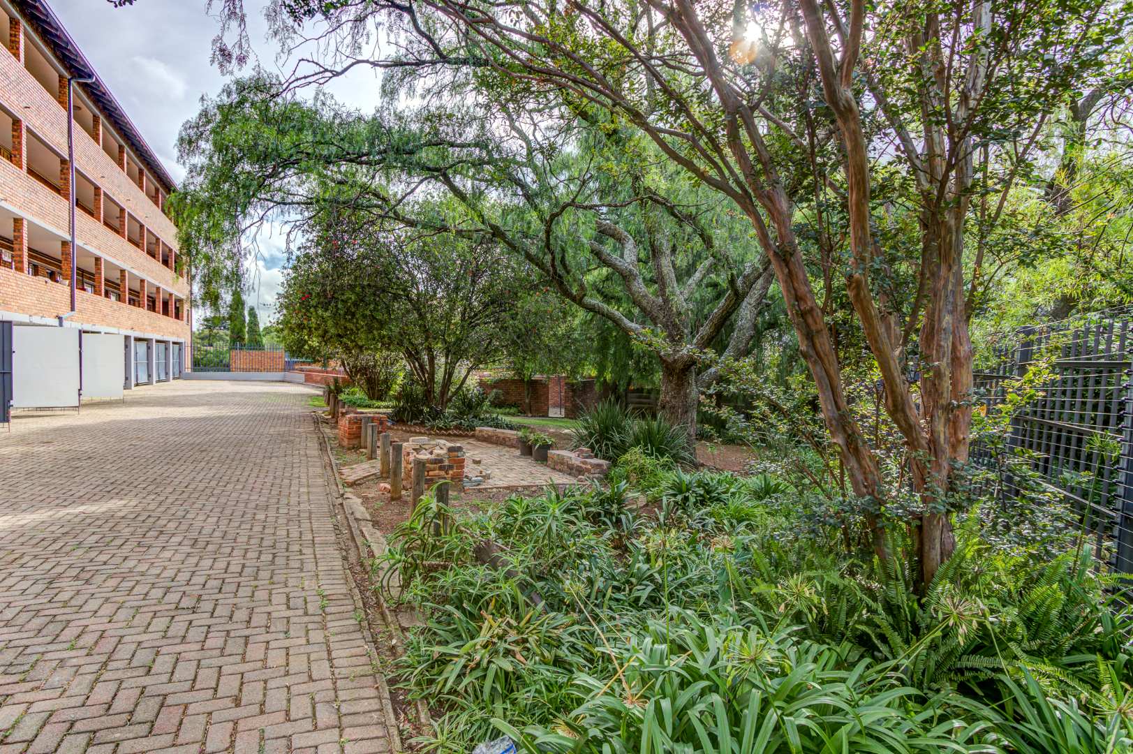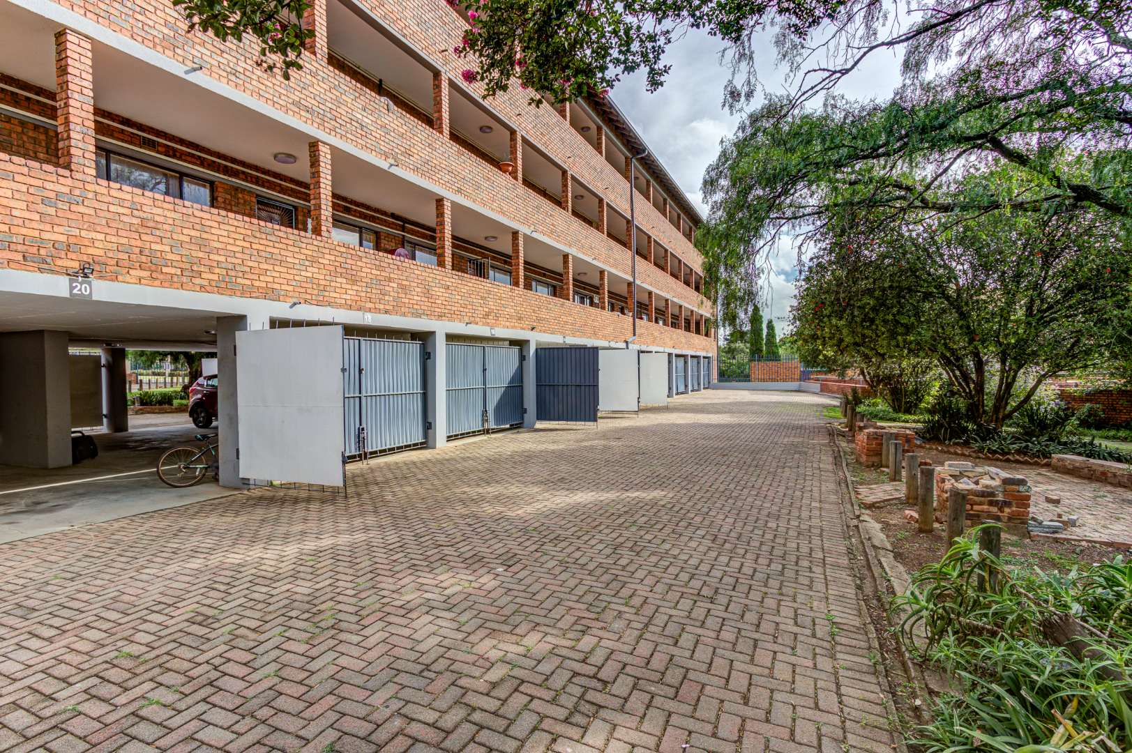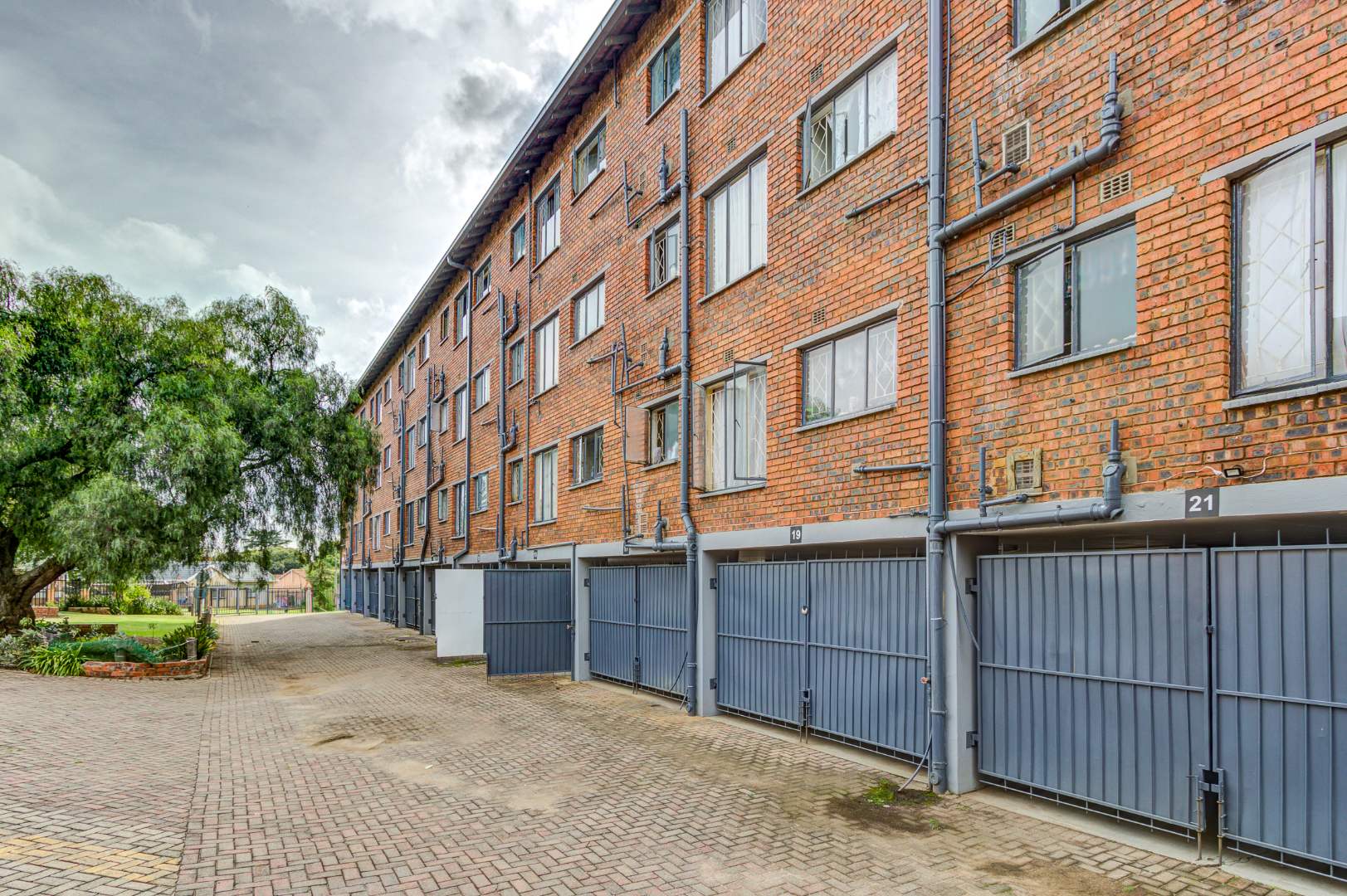 The multi-story brick building itself offers a robust and enduring exterior. Residents benefit from a dedicated parking bay.. The property boasts communal green garden spaces and mature trees, providing a pleasant outdoor environment, complemented by paved access areas.