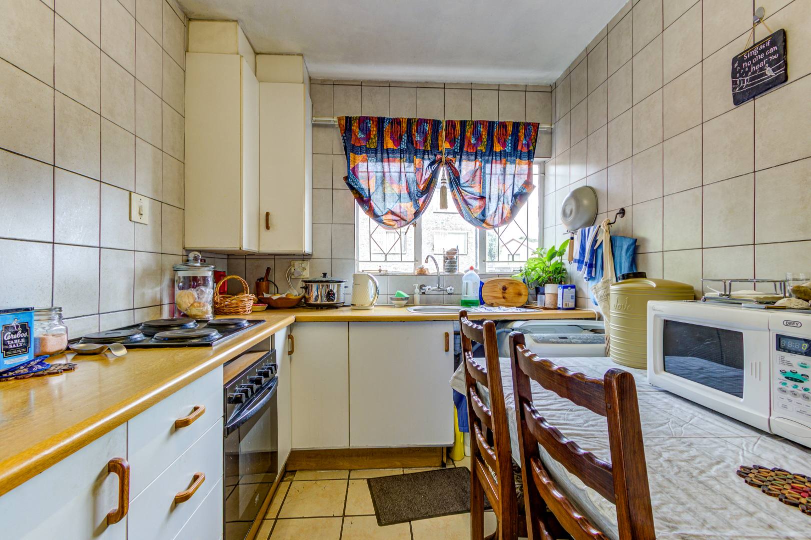 Discover practical living in this 60 sqm apartment located within the established Magda Hof complex in Croydon, Kempton Park. This functional unit features a well-lit lounge area with durable tiled flooring, offering a comfortable space for relaxation. An archway seamlessly connects to the dining room and a compact, tiled kitchen. The kitchen is equipped with essential appliances, ample cabinetry, and includes a convenient built-in dining area, making it ideal for everyday meals. While the aesthetic is classic, the layout is designed for efficiency and ease of use.