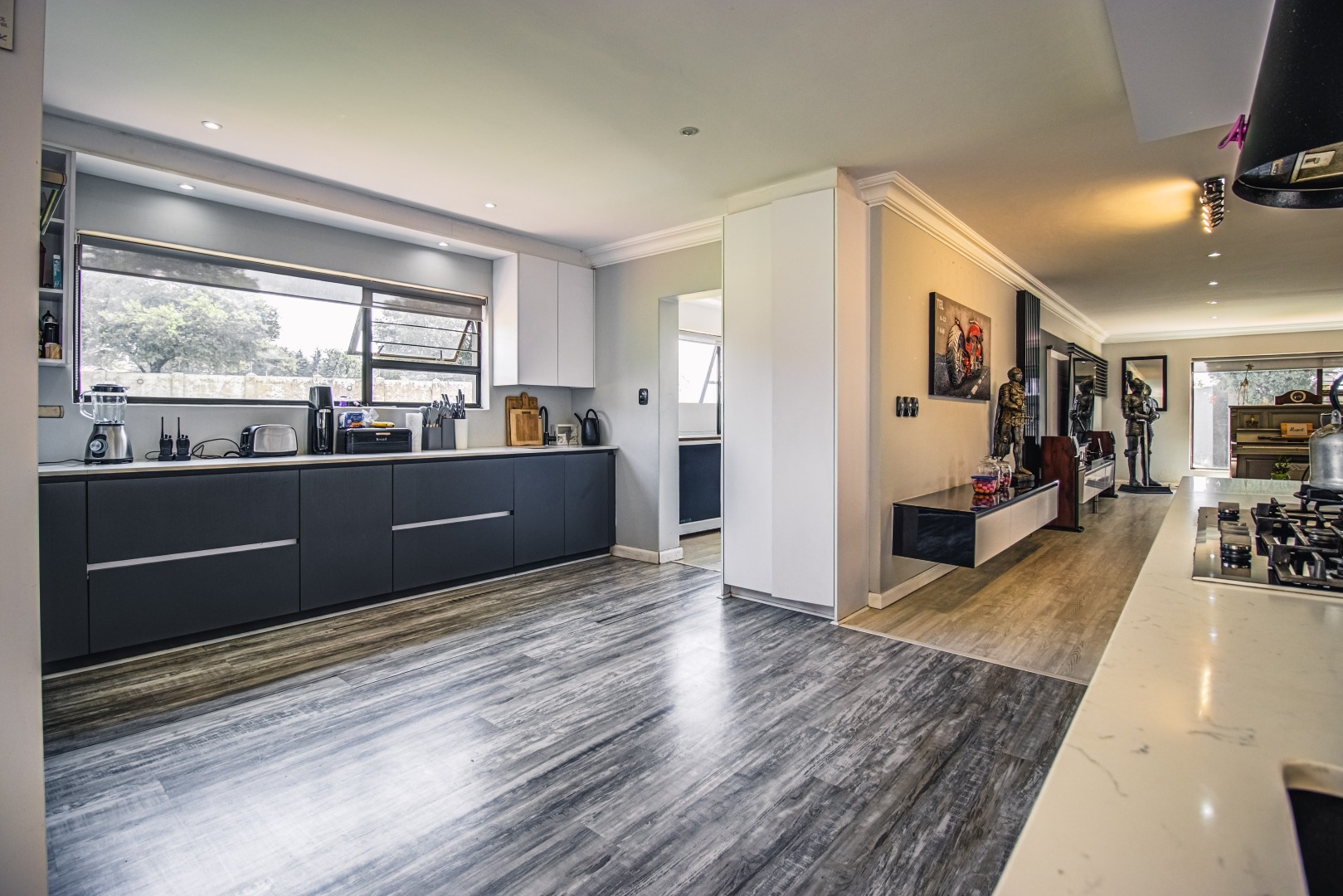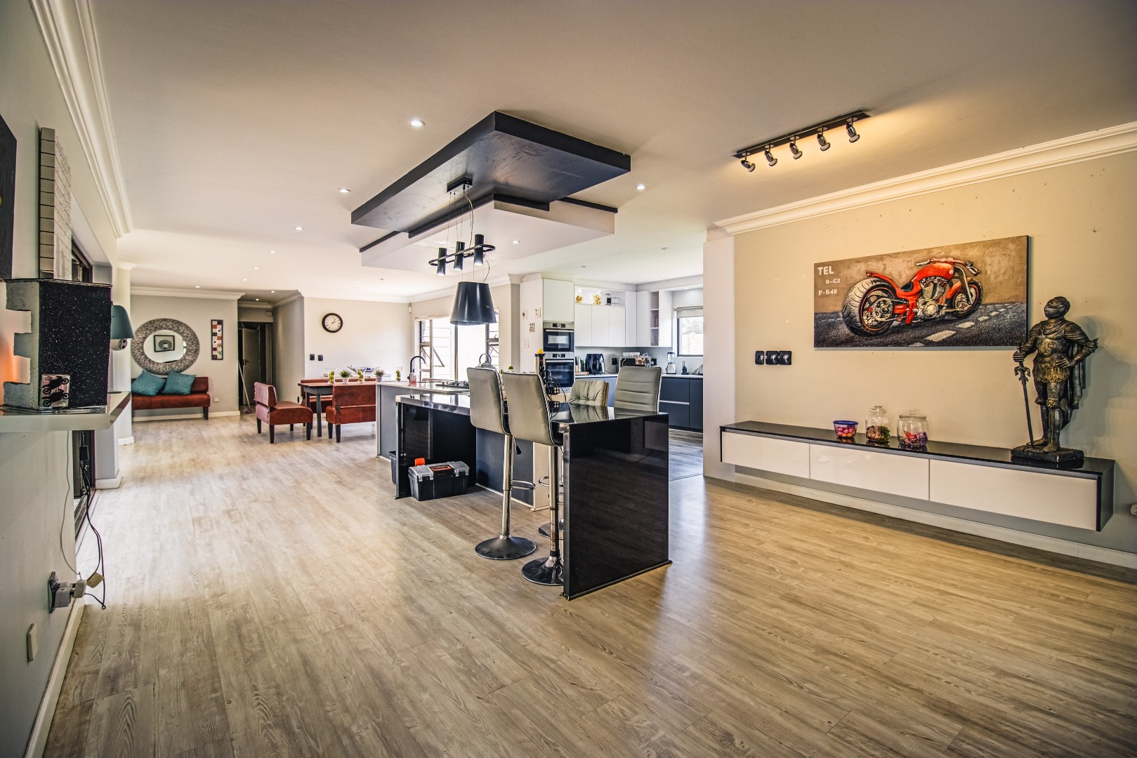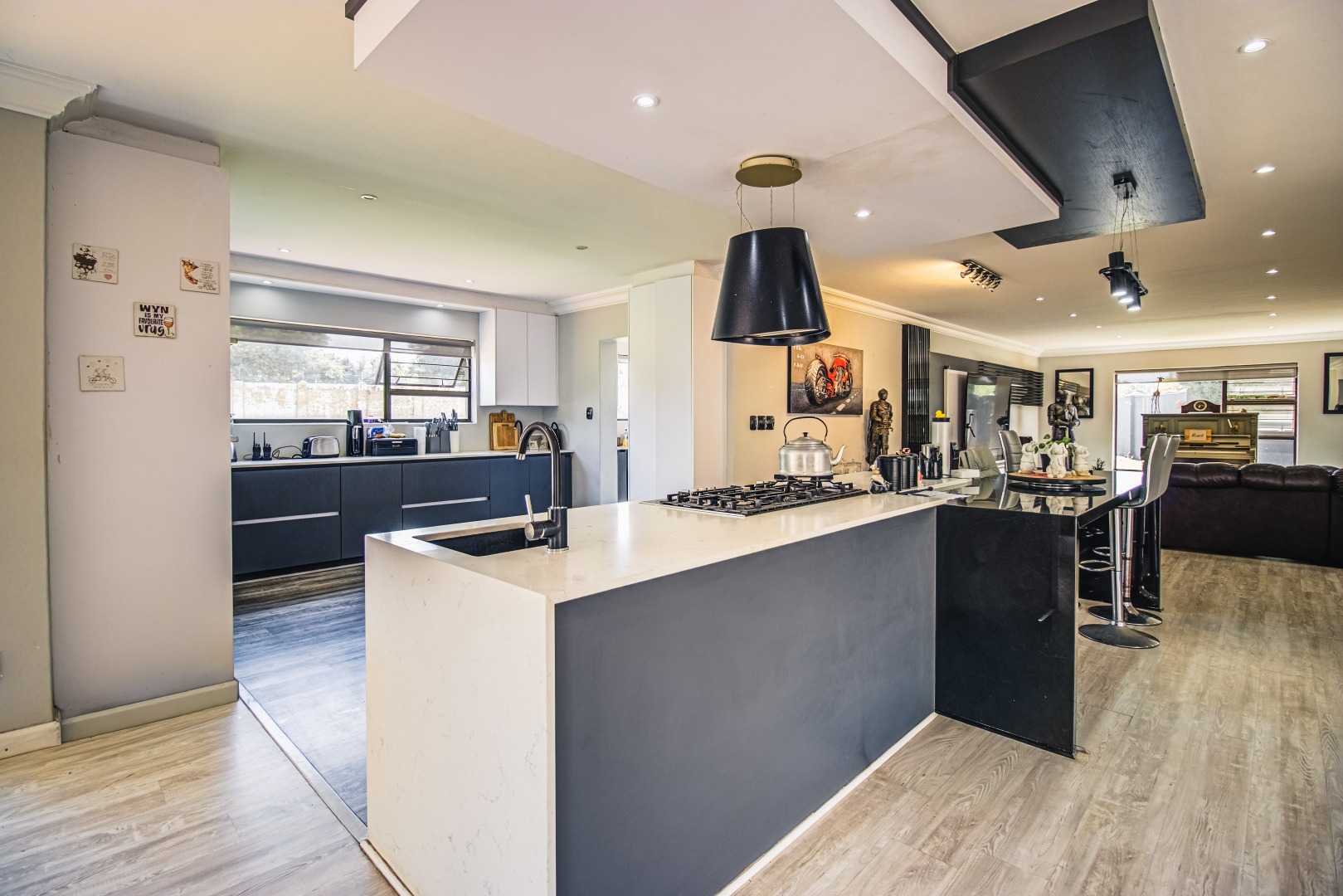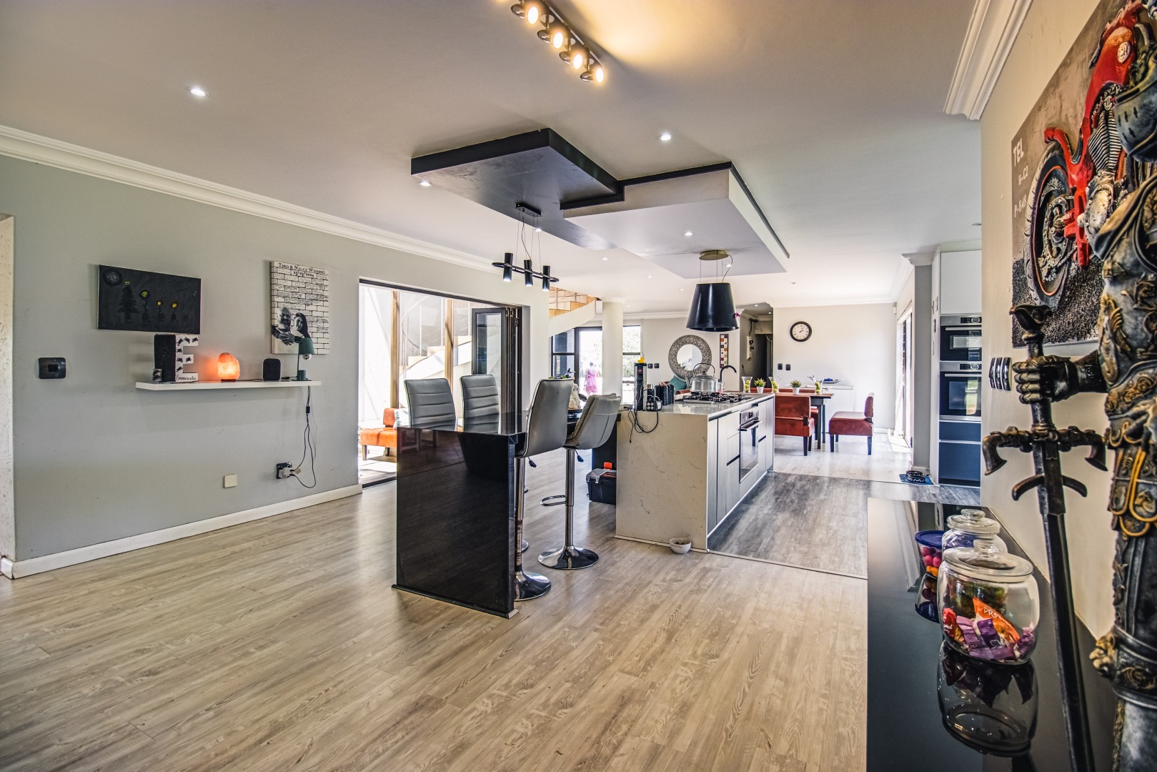 Step inside to discover an interior meticulously crafted for sophisticated living and grand entertaining. The expansive open-plan design seamlessly integrates three distinct lounges, a formal dining area, and a kitchen, all bathed in abundant natural light streaming through large sliding doors. The heart of this home is undoubtedly the contemporary kitchen, a culinary masterpiece featuring sleek two-tone cabinetry, a magnificent quartz waterfall island with an integrated gas hob, and double ovens. This space effortlessly transitions into a breakfast bar, perfect for casual mornings, and overlooks the vibrant living areas including an built in bar room, fostering an environment of connection. High ceilings, recessed lighting, and consistent light wood-look flooring create an atmosphere of refined elegance, while architectural details like crown molding and a striking spiral staircase add unique character and visual interest. A dedicated braai room and a built-in bar further enhance the entertainment possibilities, ensuring every gathering is memorable.