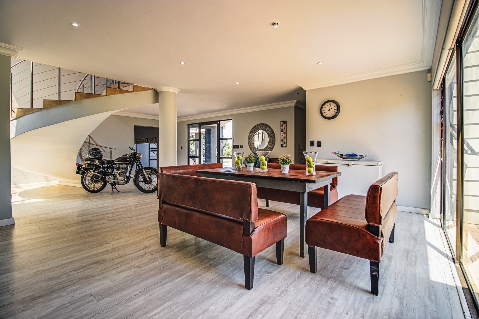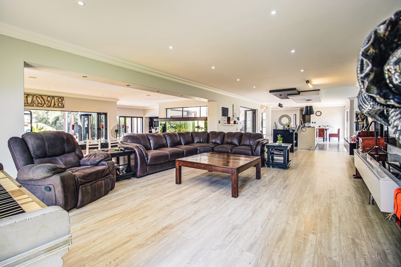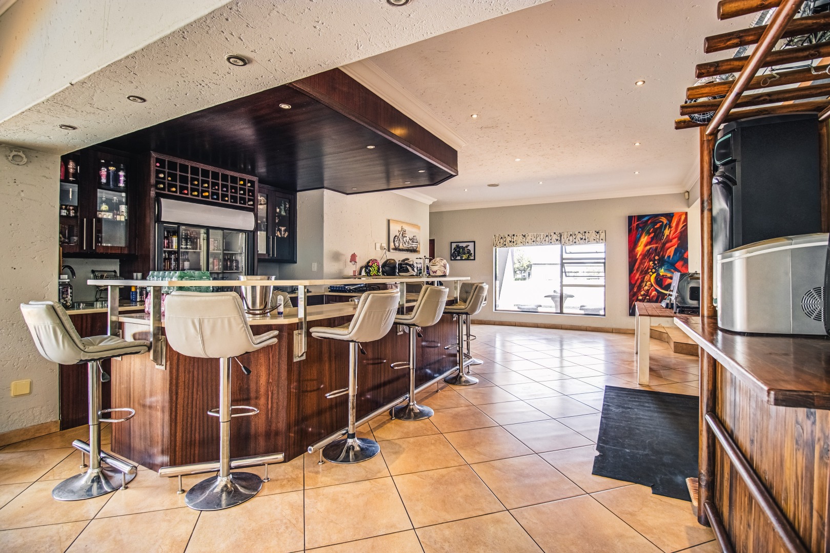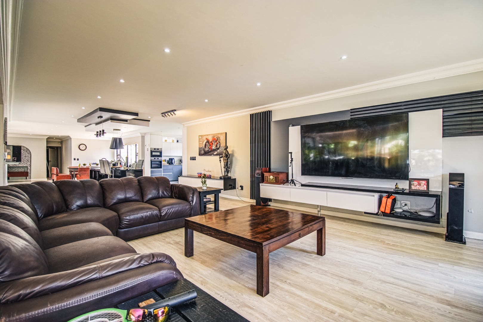 Step inside to discover an interior meticulously crafted for sophisticated living and grand entertaining. The expansive open-plan design seamlessly integrates three distinct lounges, a formal dining area, and a kitchen, all bathed in abundant natural light streaming through large sliding doors. The heart of this home is undoubtedly the contemporary kitchen, a culinary masterpiece featuring sleek two-tone cabinetry, a magnificent quartz waterfall island with an integrated gas hob, and double ovens. This space effortlessly transitions into a breakfast bar, perfect for casual mornings, and overlooks the vibrant living areas including an built in bar room, fostering an environment of connection. High ceilings, recessed lighting, and consistent light wood-look flooring create an atmosphere of refined elegance, while architectural details like crown molding and a striking spiral staircase add unique character and visual interest. A dedicated braai room and a built-in bar further enhance the entertainment possibilities, ensuring every gathering is memorable.