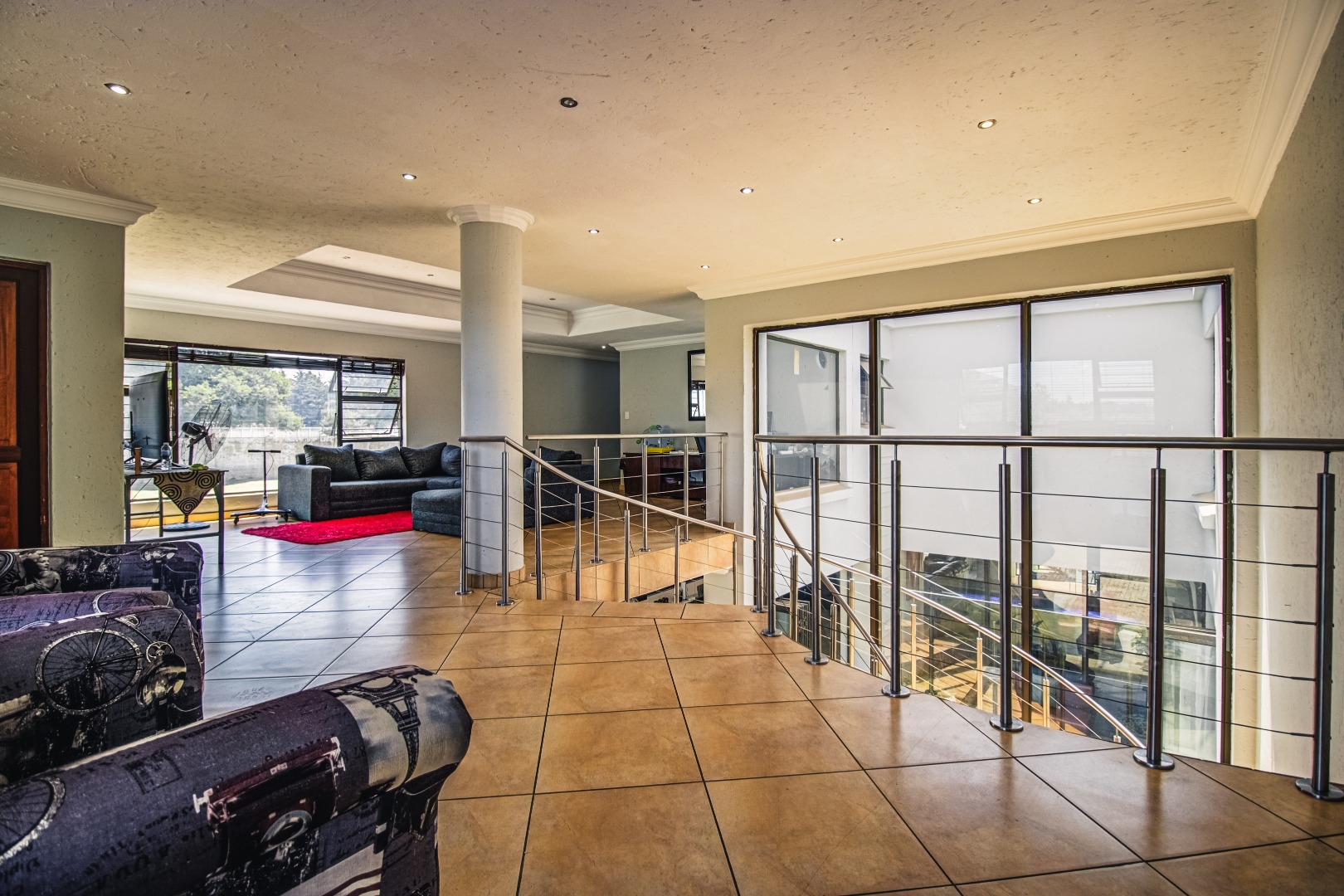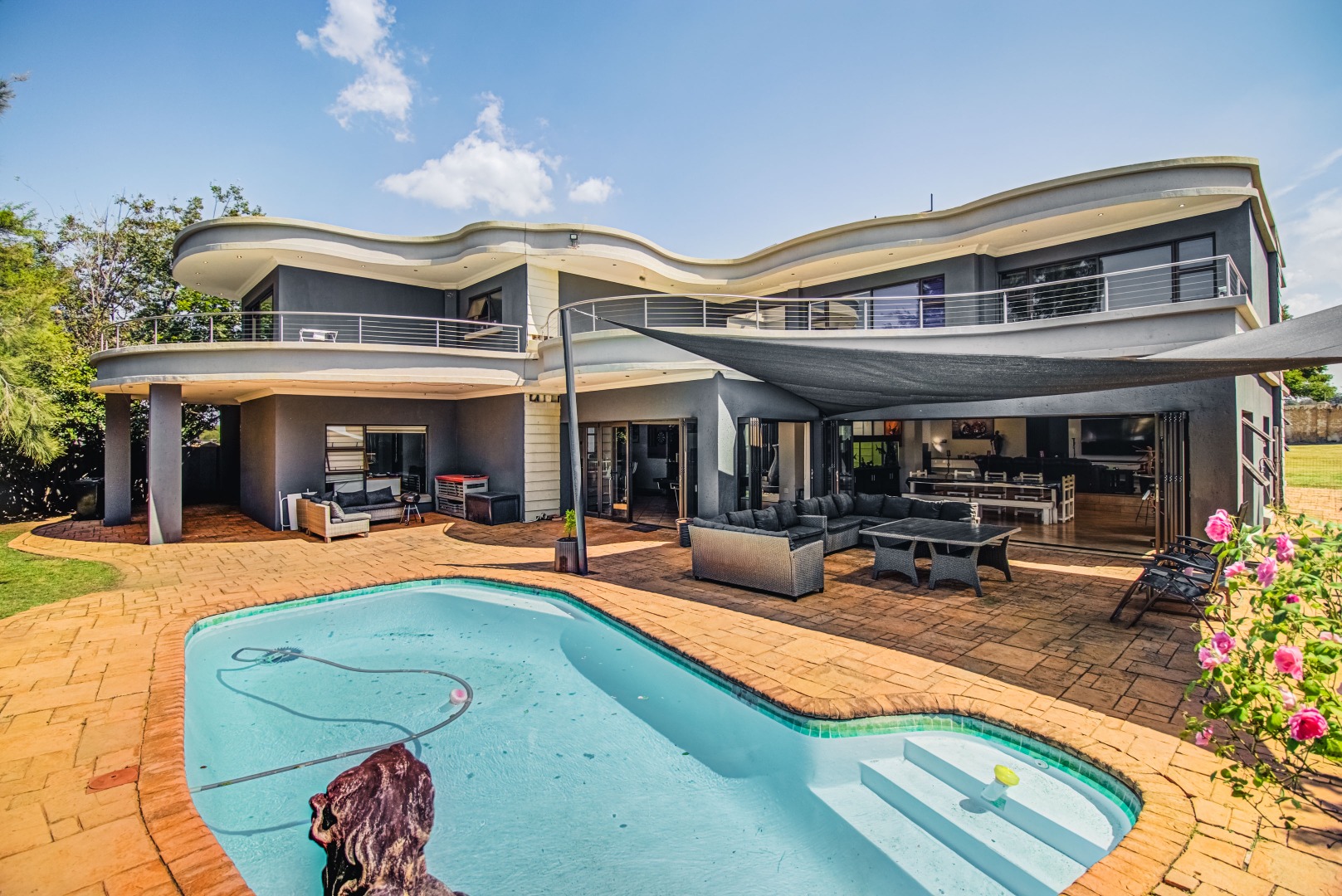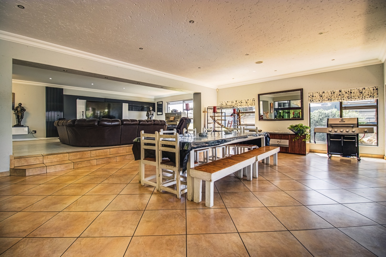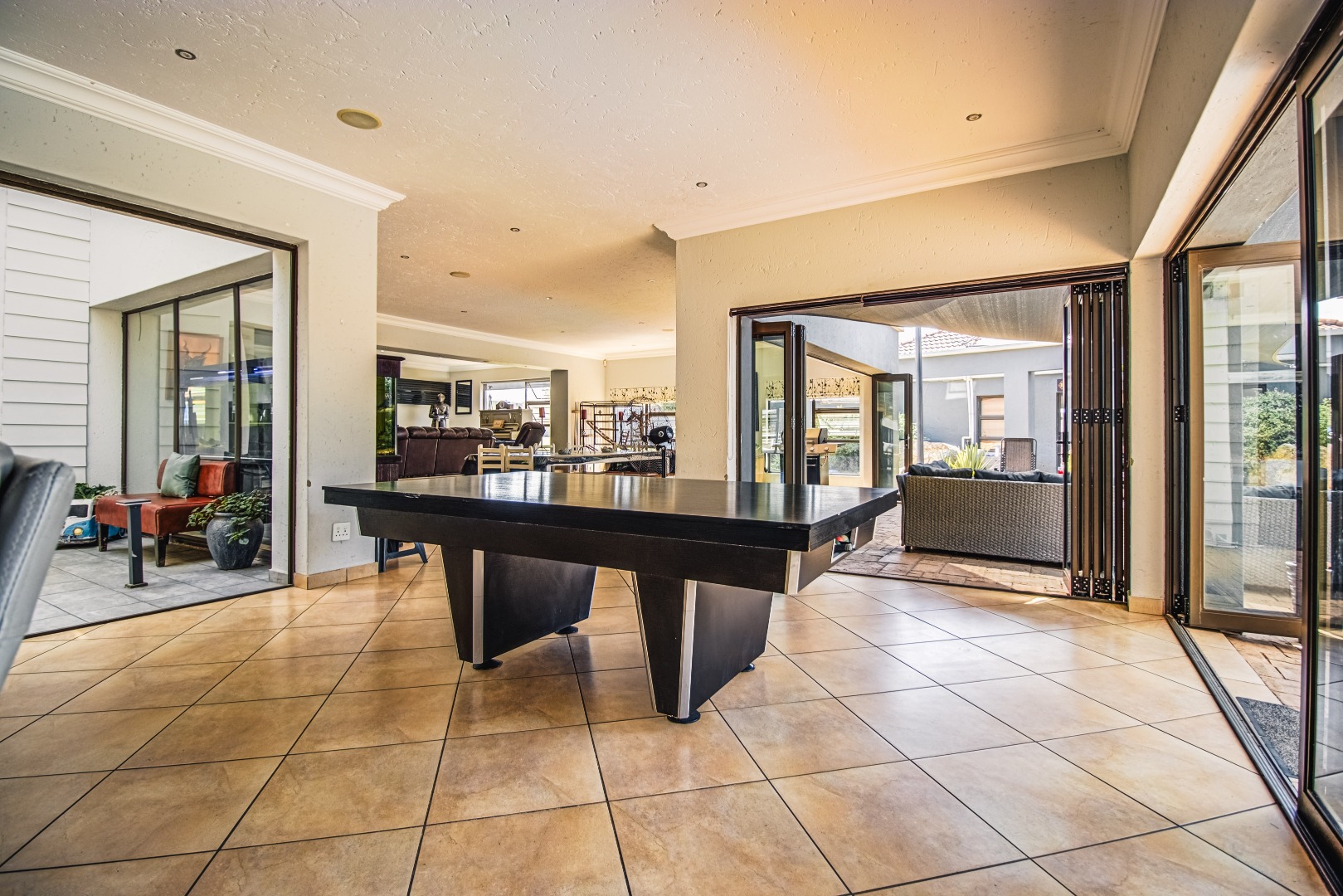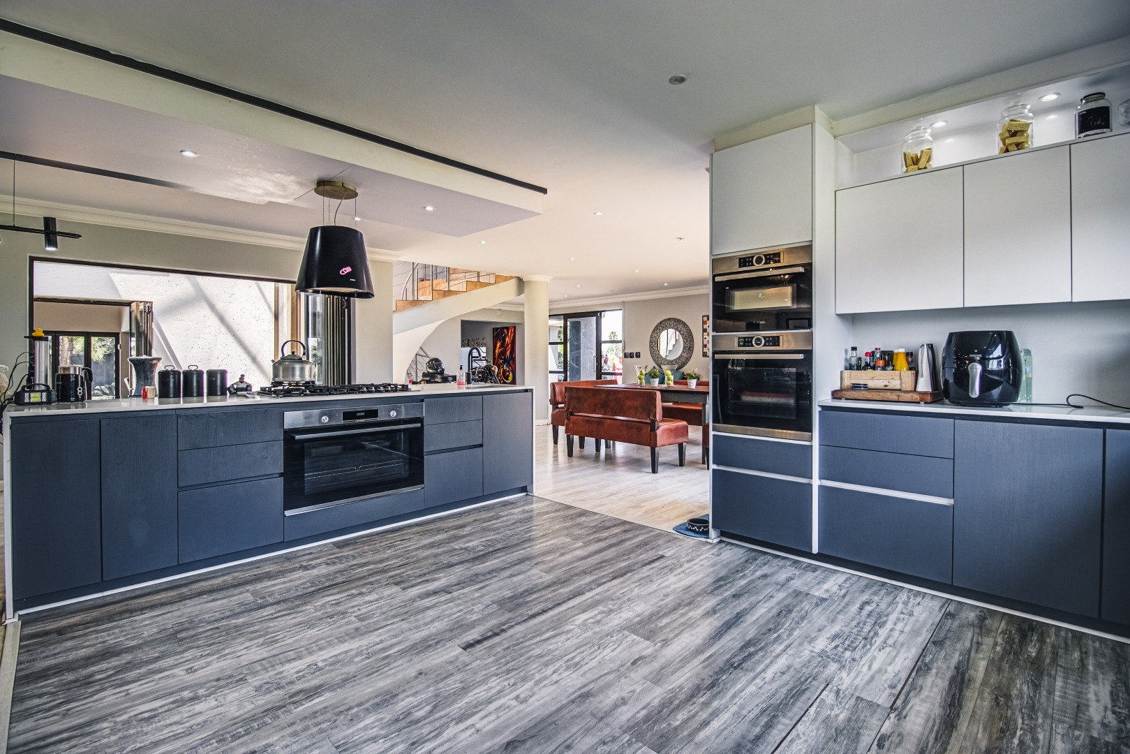 Step inside to discover an interior meticulously crafted for sophisticated living and grand entertaining. The expansive open-plan design seamlessly integrates three distinct lounges, a formal dining area, and a kitchen, all bathed in abundant natural light streaming through large sliding doors. The heart of this home is undoubtedly the contemporary kitchen, a culinary masterpiece featuring sleek two-tone cabinetry, a magnificent quartz waterfall island with an integrated gas hob, and double ovens. This space effortlessly transitions into a breakfast bar, perfect for casual mornings, and overlooks the vibrant living areas including an built in bar room, fostering an environment of connection. High ceilings, recessed lighting, and consistent light wood-look flooring create an atmosphere of refined elegance, while architectural details like crown molding and a striking spiral staircase add unique character and visual interest. A dedicated braai room and a built-in bar further enhance the entertainment possibilities, ensuring every gathering is memorable.