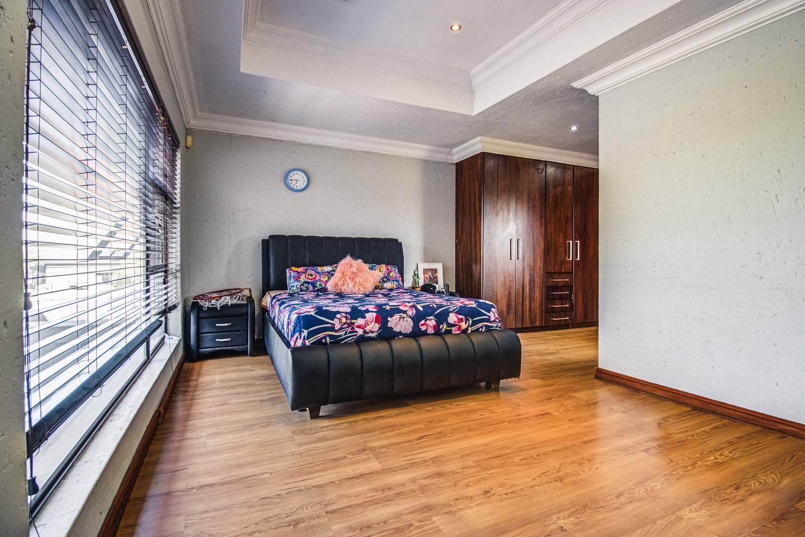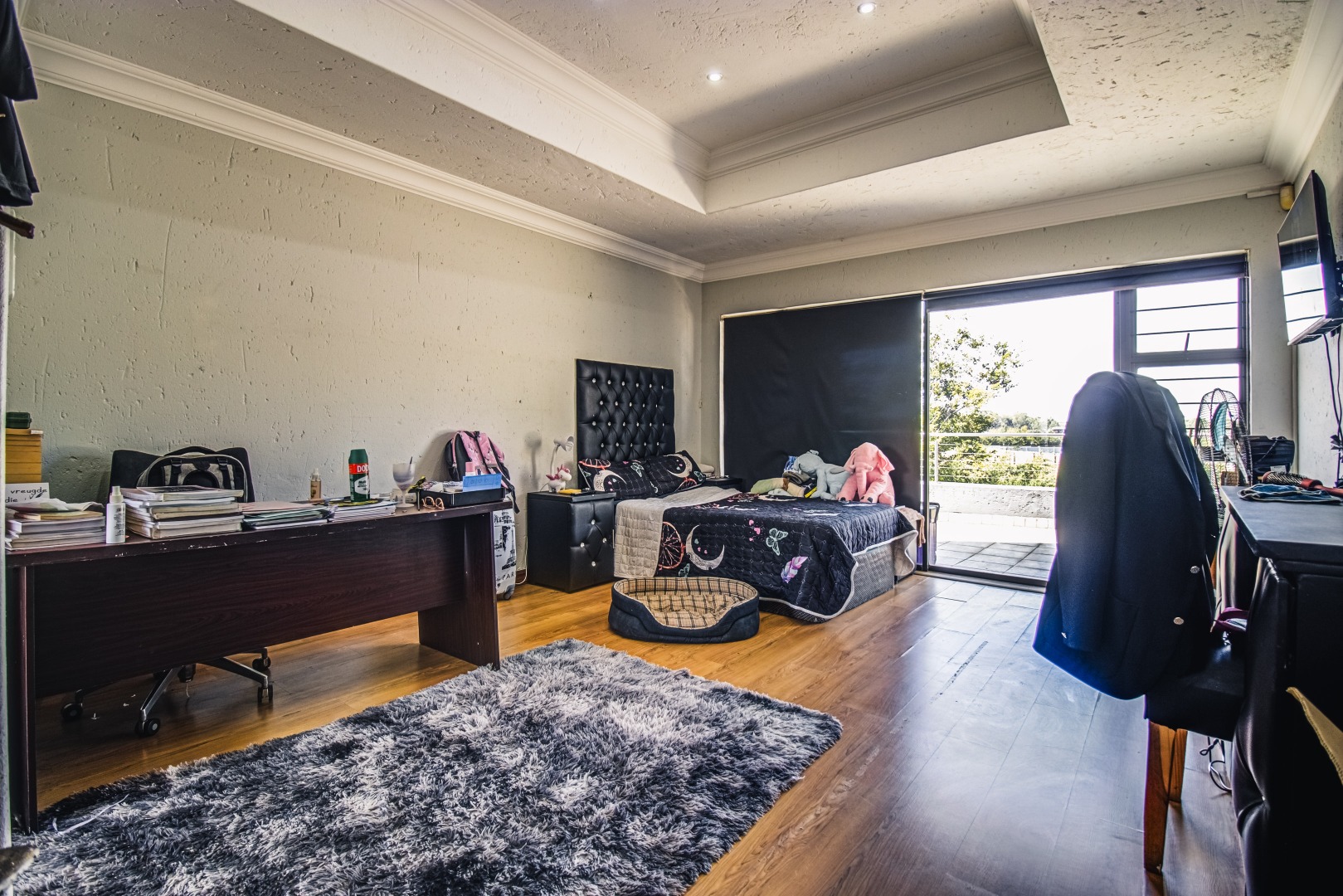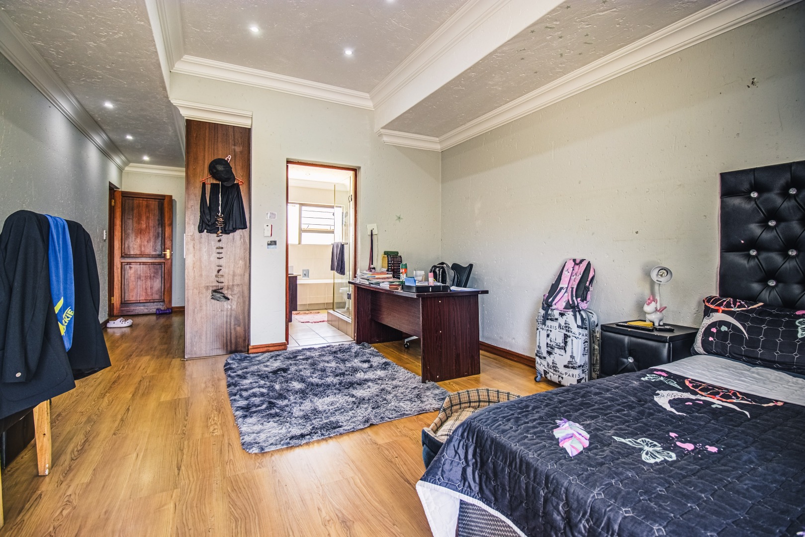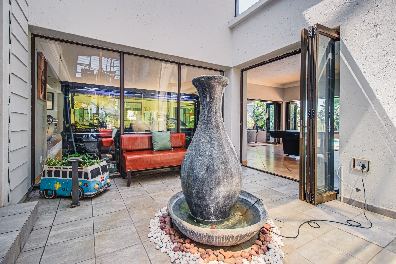 Step inside to discover an interior meticulously crafted for sophisticated living and grand entertaining. The expansive open-plan design seamlessly integrates three distinct lounges, a formal dining area, and a kitchen, all bathed in abundant natural light streaming through large sliding doors. The heart of this home is undoubtedly the contemporary kitchen, a culinary masterpiece featuring sleek two-tone cabinetry, a magnificent quartz waterfall island with an integrated gas hob, and double ovens. This space effortlessly transitions into a breakfast bar, perfect for casual mornings, and overlooks the vibrant living areas including an built in bar room, fostering an environment of connection. High ceilings, recessed lighting, and consistent light wood-look flooring create an atmosphere of refined elegance, while architectural details like crown molding and a striking spiral staircase add unique character and visual interest. A dedicated braai room and a built-in bar further enhance the entertainment possibilities, ensuring every gathering is memorable.