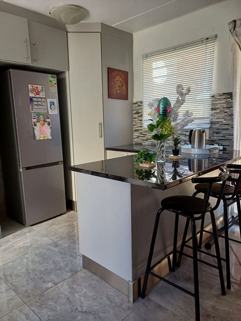 Step into a bright, open-plan lounge with tiled flooring, offering seamless flow into the stylish kitchen. The kitchen features granite tops, a breakfast counter, melamine cabinetry, an under-counter oven, and a sleek glass hob—perfect for modern living and easy entertaining.