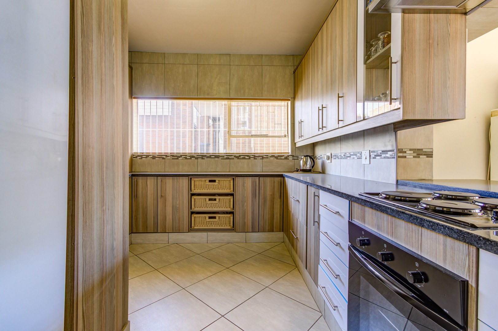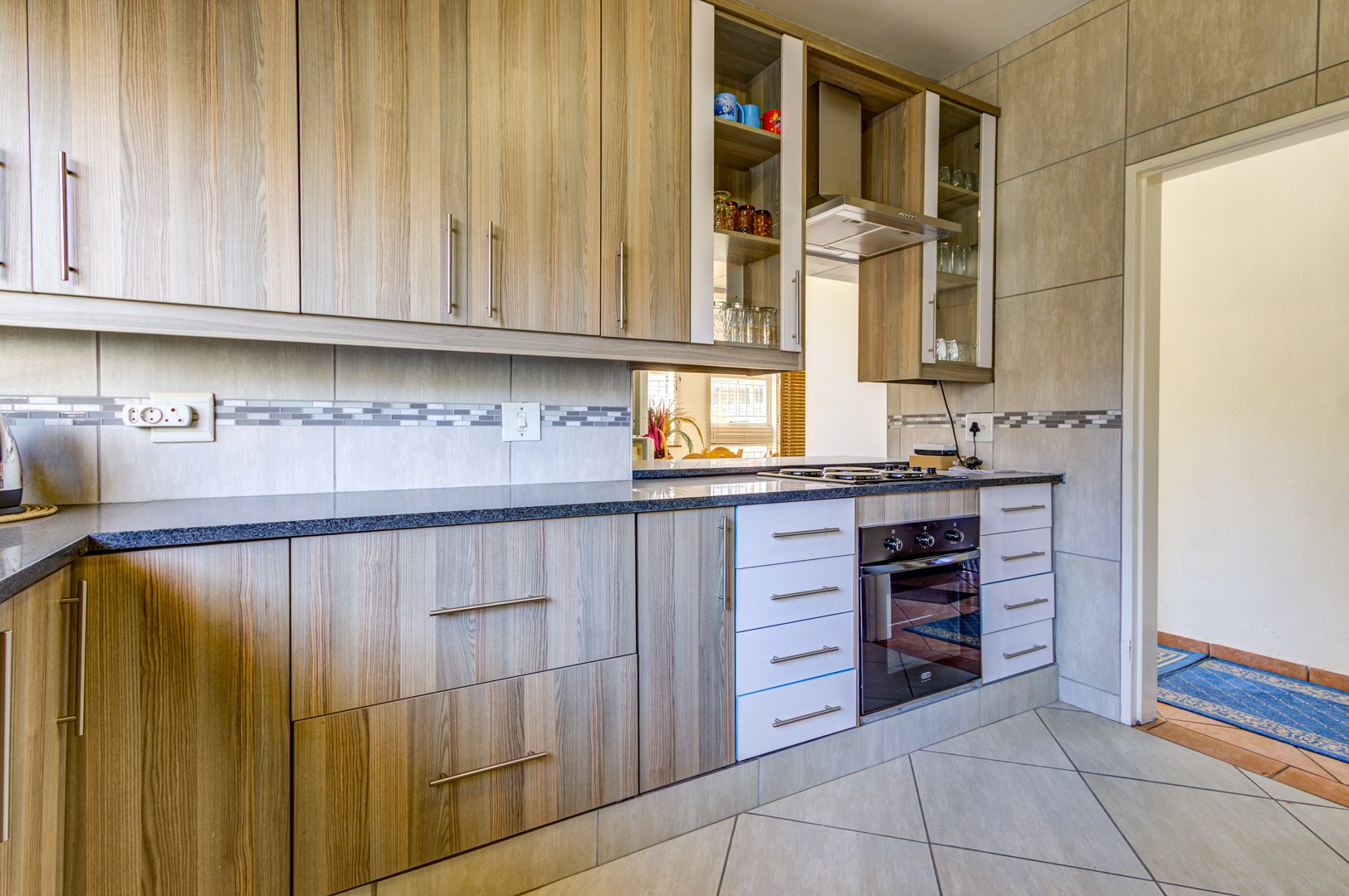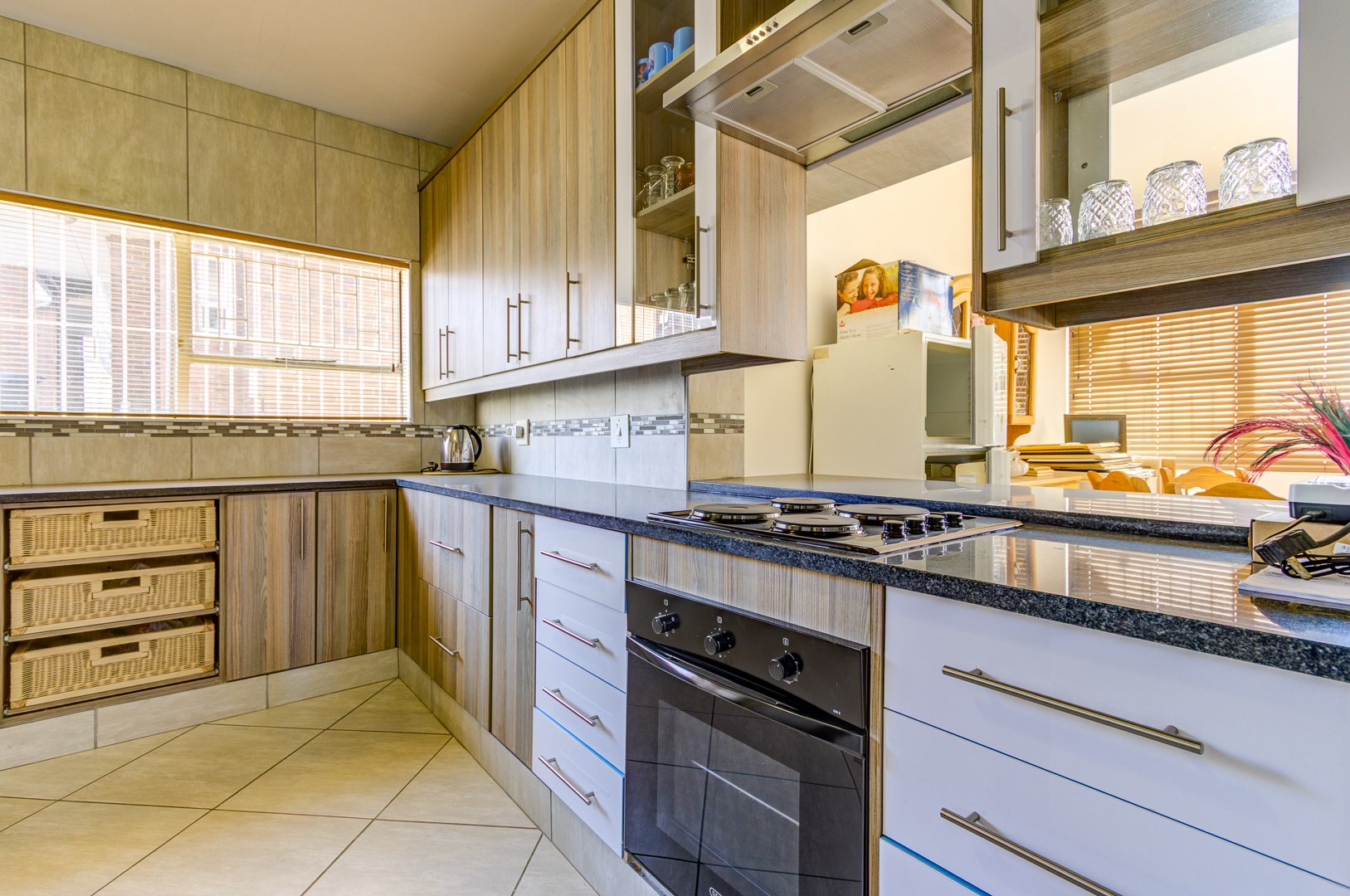 The kitchen is fitted with lots of cupboards and work space and granite tops. Stove, oven and extractor fan.