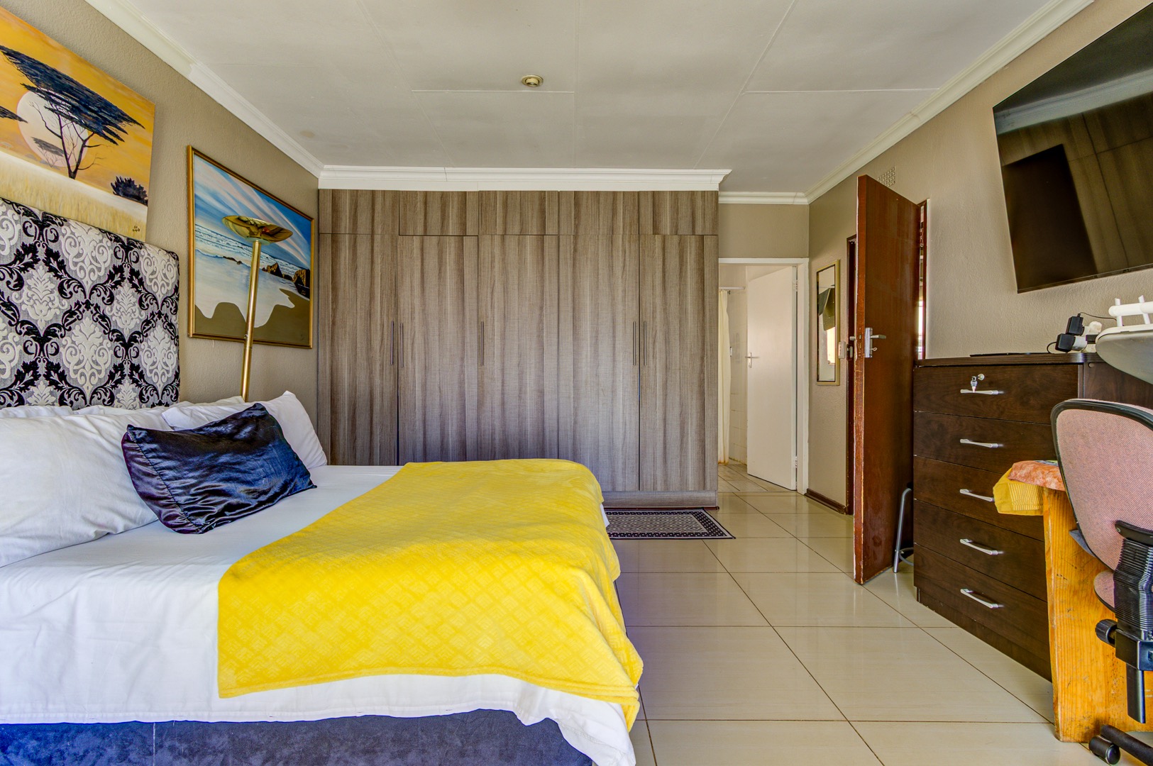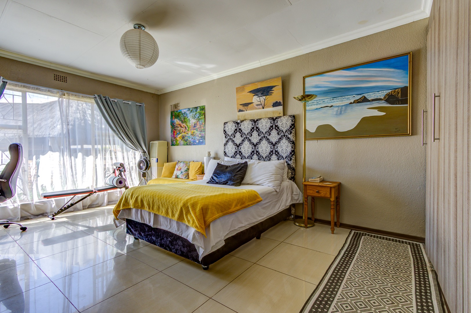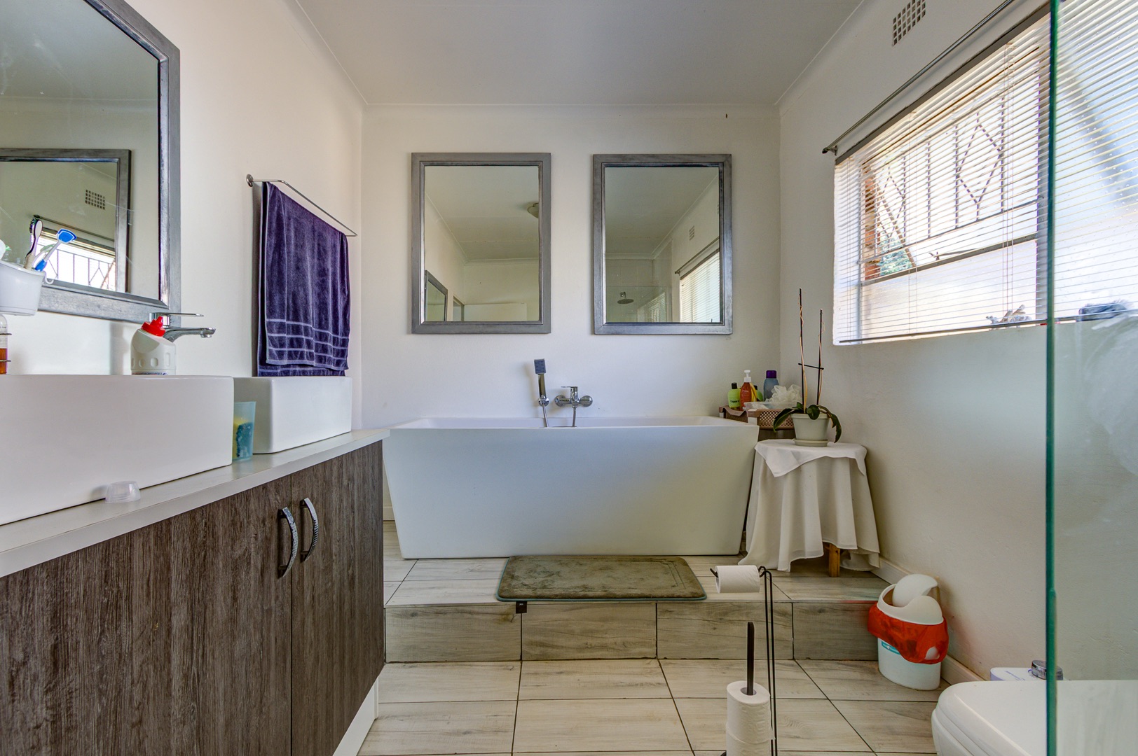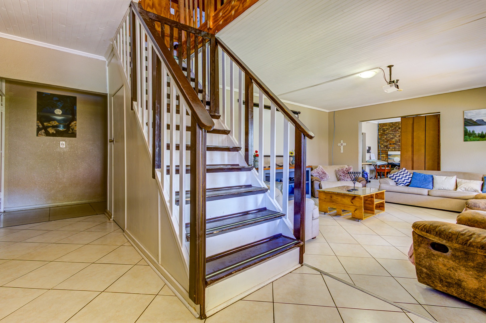 A staircase rises from the family room to a lofty open-plan space now serving as a sixth bedroom and compact gym, its vaulted ceilings inviting creativity. Back on the ground floor, a sunlit passage reveals the solar-powered inverter and batteries—discreetly ensuring uninterrupted living—before leading to five spacious, tiled bedrooms fitted with built-in cupboards. The main suite is palatial, wired for television, and adjoins a show-stopping en-suite where a freestanding bath, open rainfall shower, and twin vanities evoke a boutique-hotel ambience. A family bathroom nearby mirrors this sense of scale with both bath and shower.