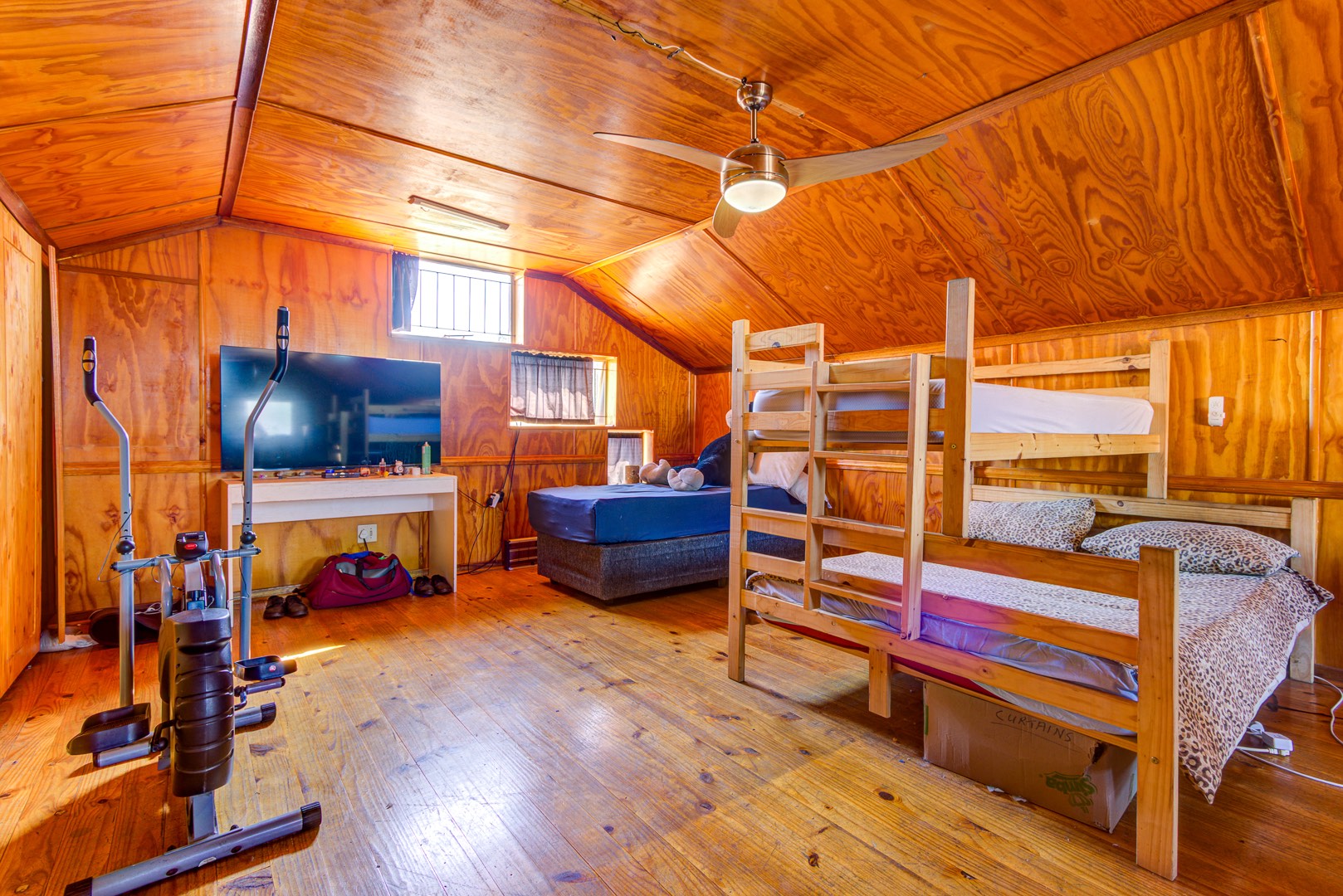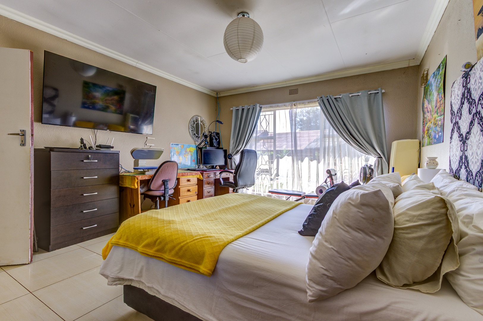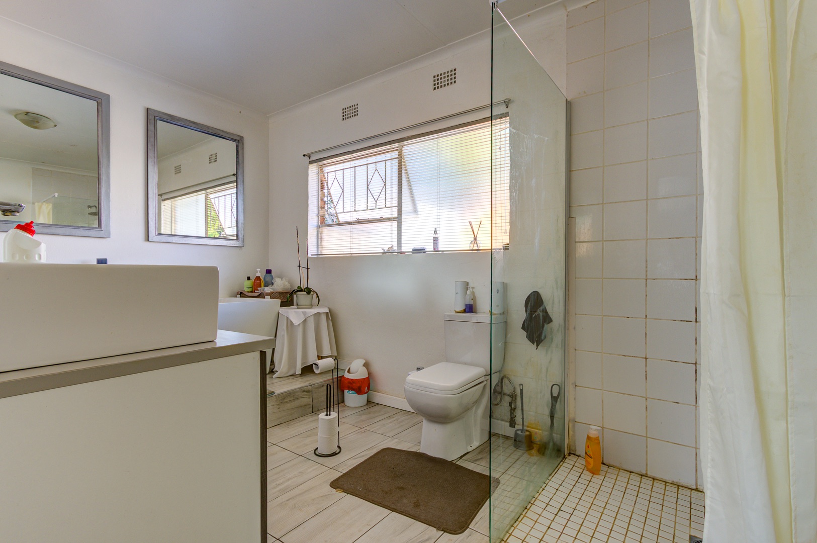 A staircase rises from the family room to a lofty open-plan space now serving as a sixth bedroom and compact gym, its vaulted ceilings inviting creativity. Back on the ground floor, a sunlit passage reveals the solar-powered inverter and batteries—discreetly ensuring uninterrupted living—before leading to five spacious, tiled bedrooms fitted with built-in cupboards. The main suite is palatial, wired for television, and adjoins a show-stopping en-suite where a freestanding bath, open rainfall shower, and twin vanities evoke a boutique-hotel ambience. A family bathroom nearby mirrors this sense of scale with both bath and shower.