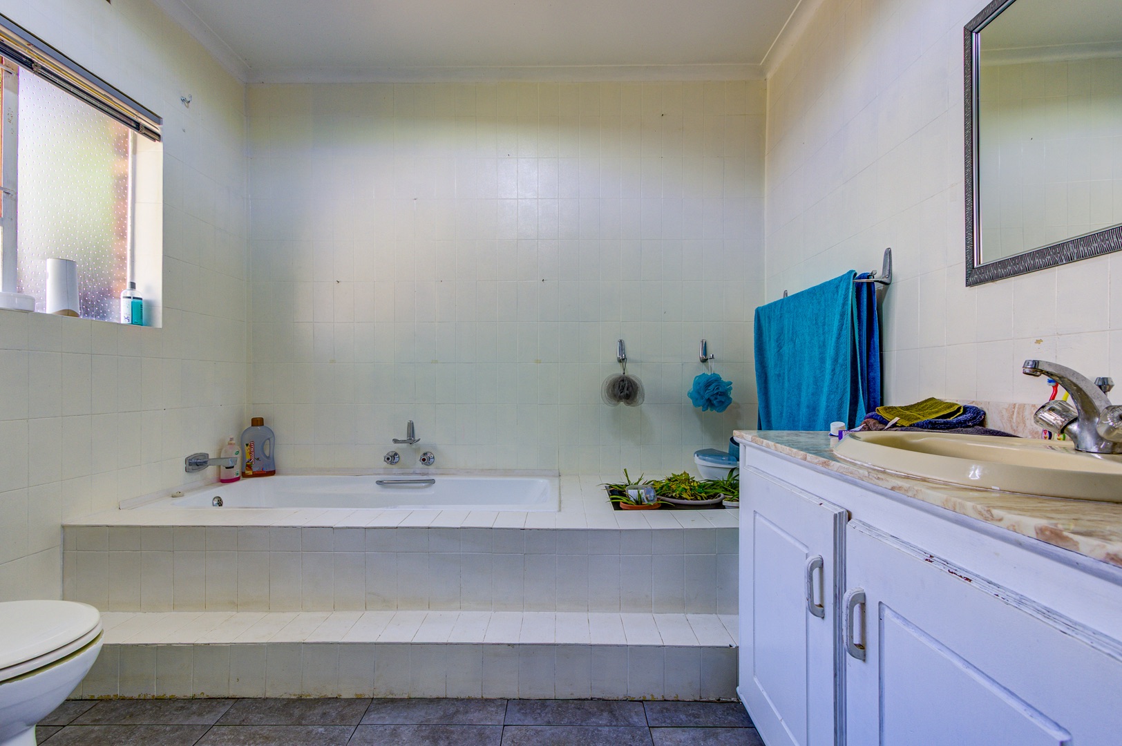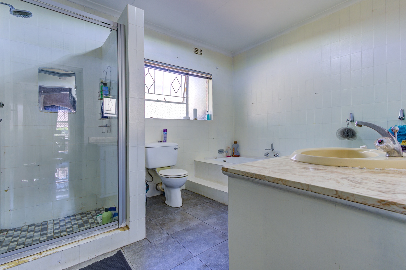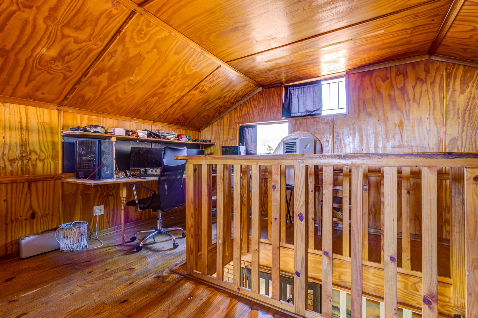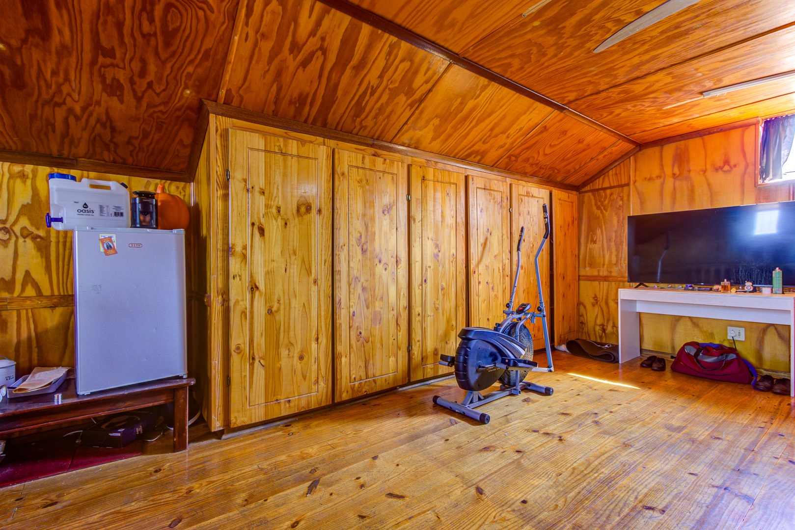 A staircase rises from the family room to a lofty open-plan space now serving as a sixth bedroom and compact gym, its vaulted ceilings inviting creativity. Back on the ground floor, a sunlit passage reveals the solar-powered inverter and batteries—discreetly ensuring uninterrupted living—before leading to five spacious, tiled bedrooms fitted with built-in cupboards. The main suite is palatial, wired for television, and adjoins a show-stopping en-suite where a freestanding bath, open rainfall shower, and twin vanities evoke a boutique-hotel ambience. A family bathroom nearby mirrors this sense of scale with both bath and shower.