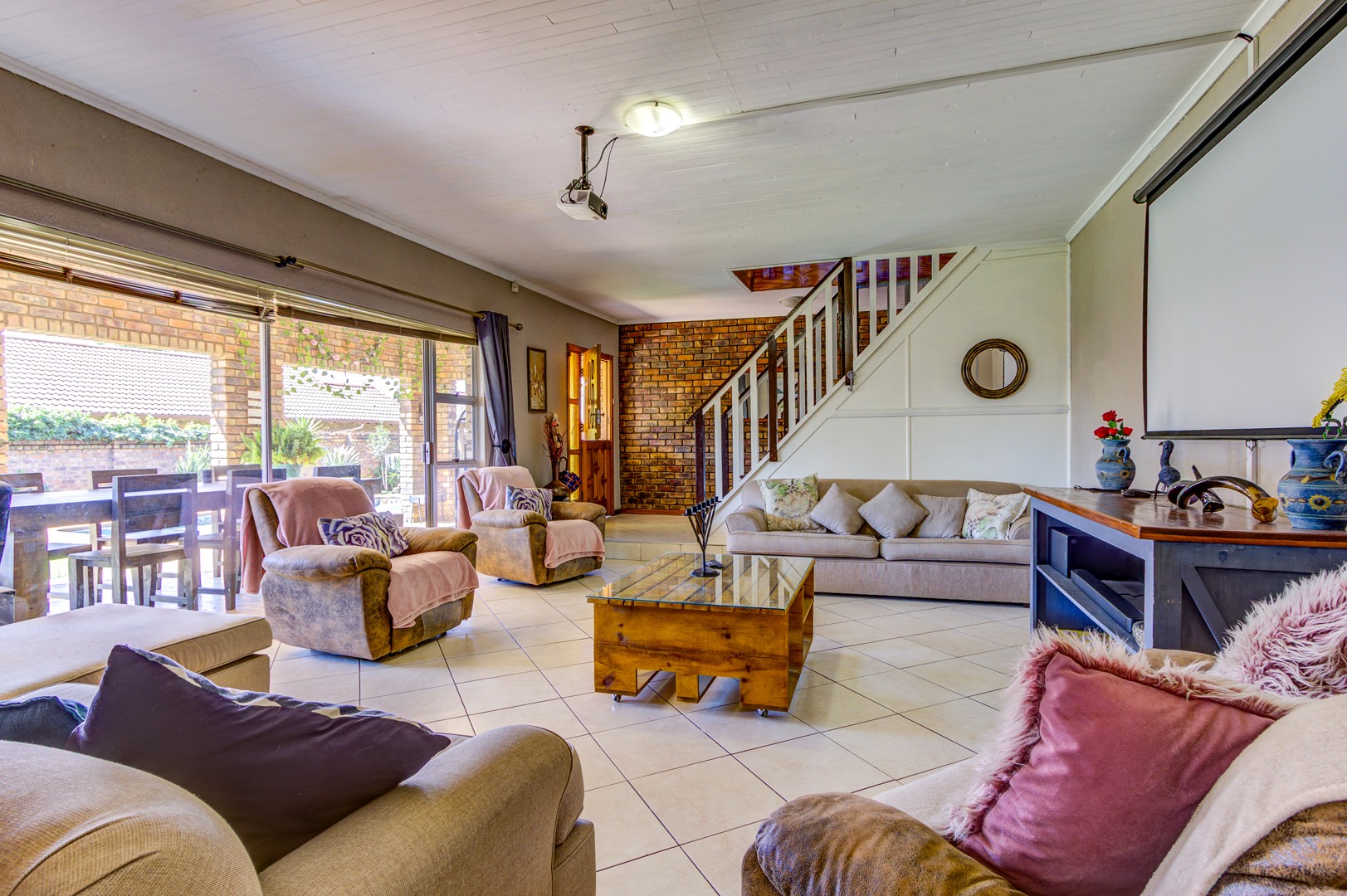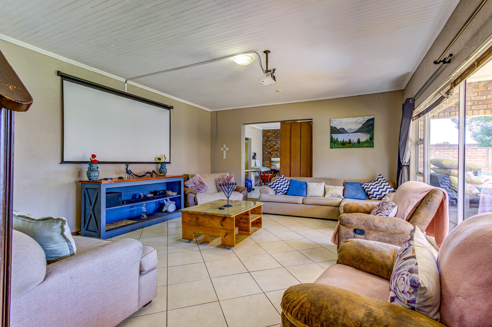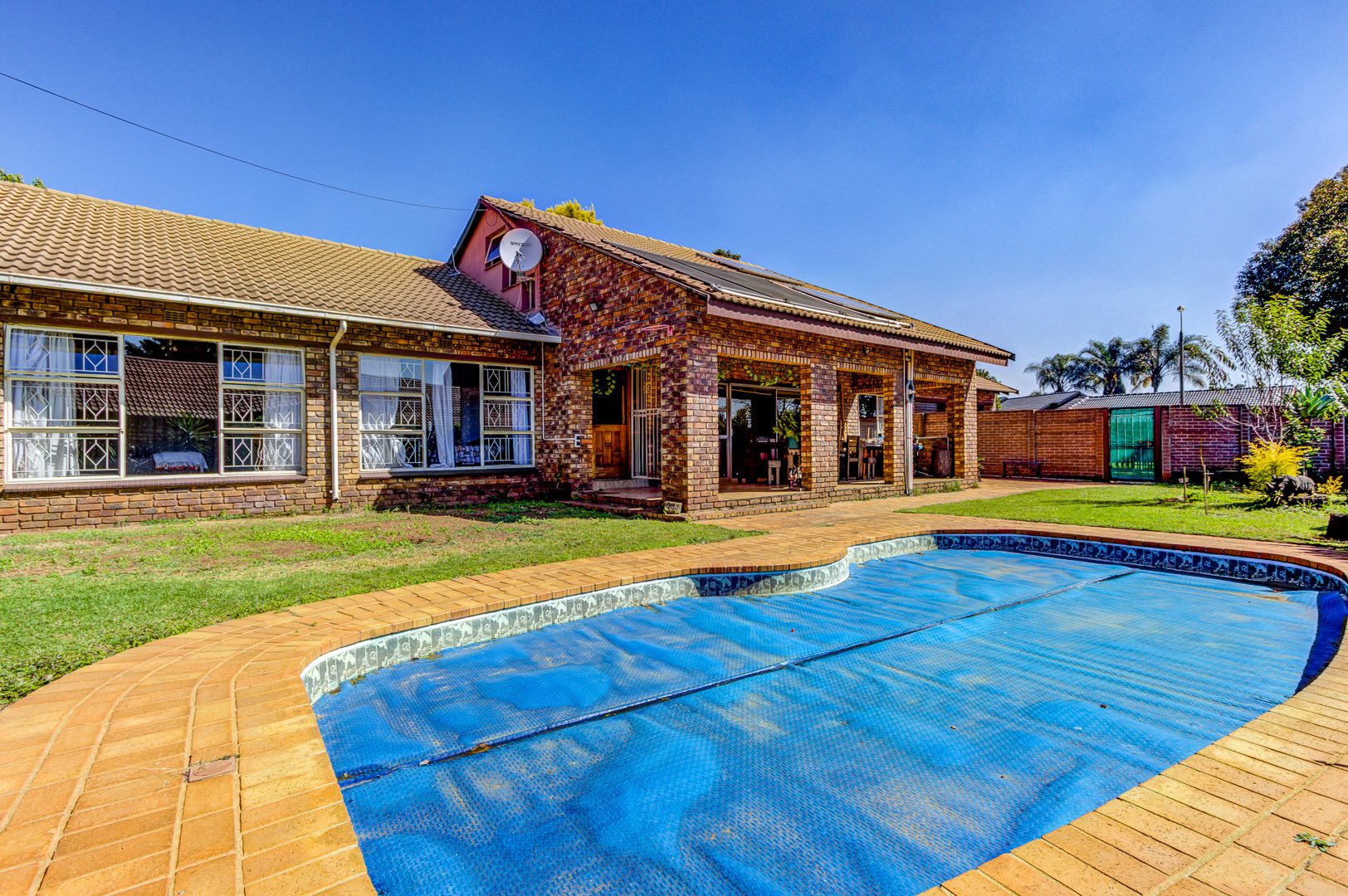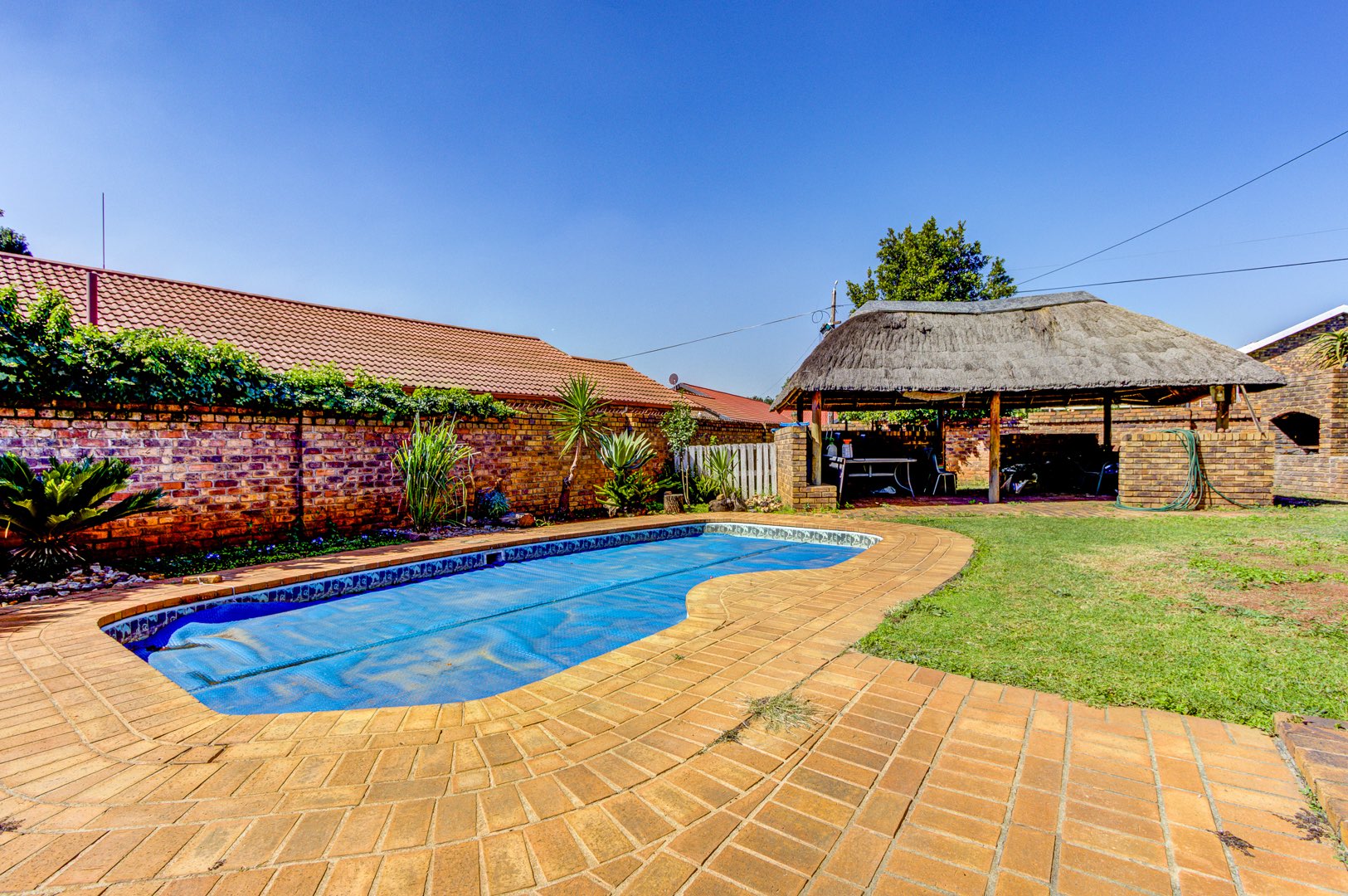Step inside and the heart of the home unfolds in one fluid sweep: a fully renovated, sun-filled dining room flowing into a stylish, stone-topped kitchen where modern fittings, crisp tiling, and ample cabinetry make both weekday meals and larger gatherings effortless. Slip through to the adjacent private lounge for an intimate conversation, or continue into an expansive family room where an overhead projector transforms movie nights into cinematic occasions. Glass doors pull back to a deep, covered patio that surveys the landscaped back garden, sparkling pool, built-in braai, and thatch-roof lapa—an entertainer’s axis whatever the season.