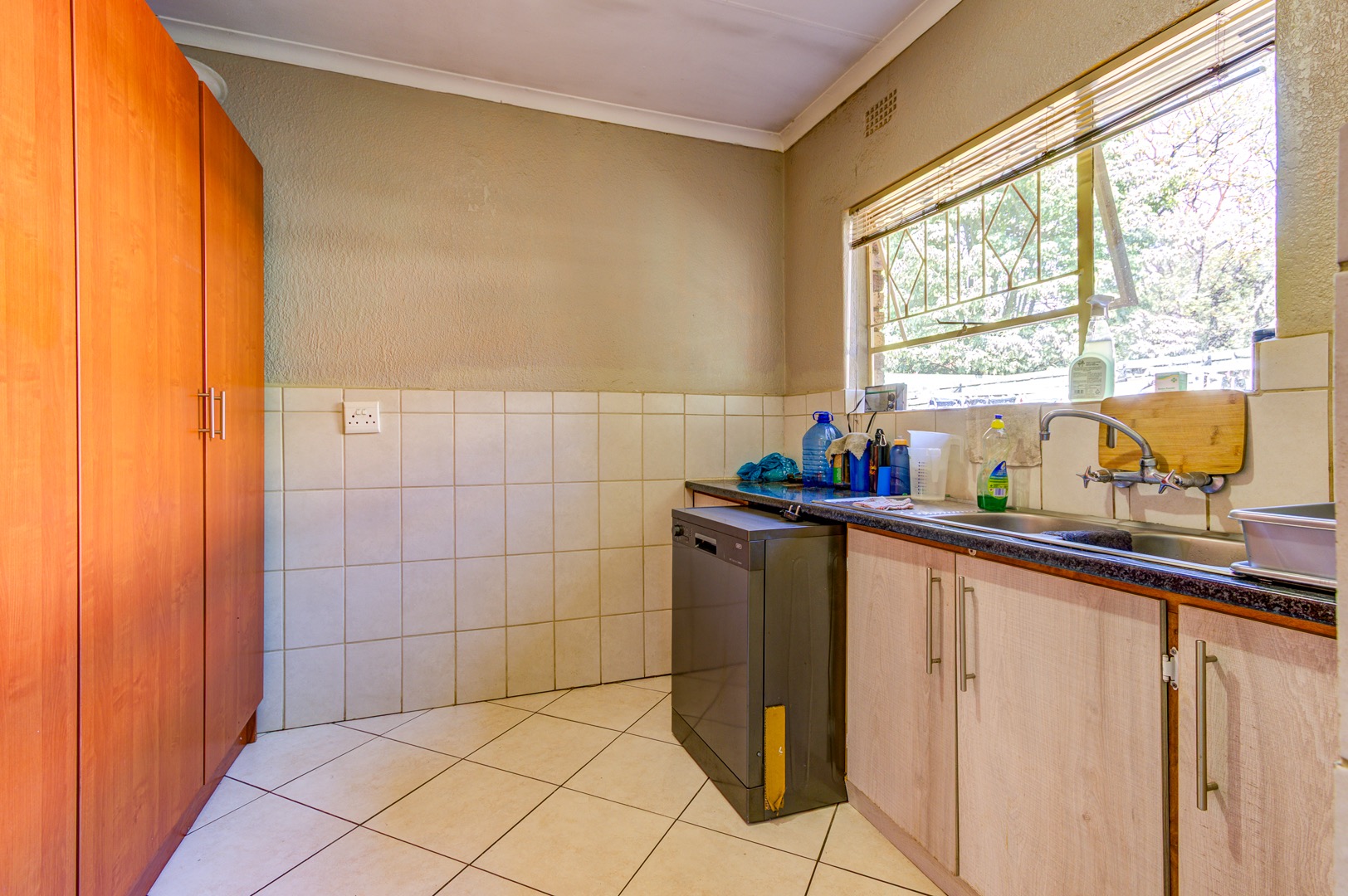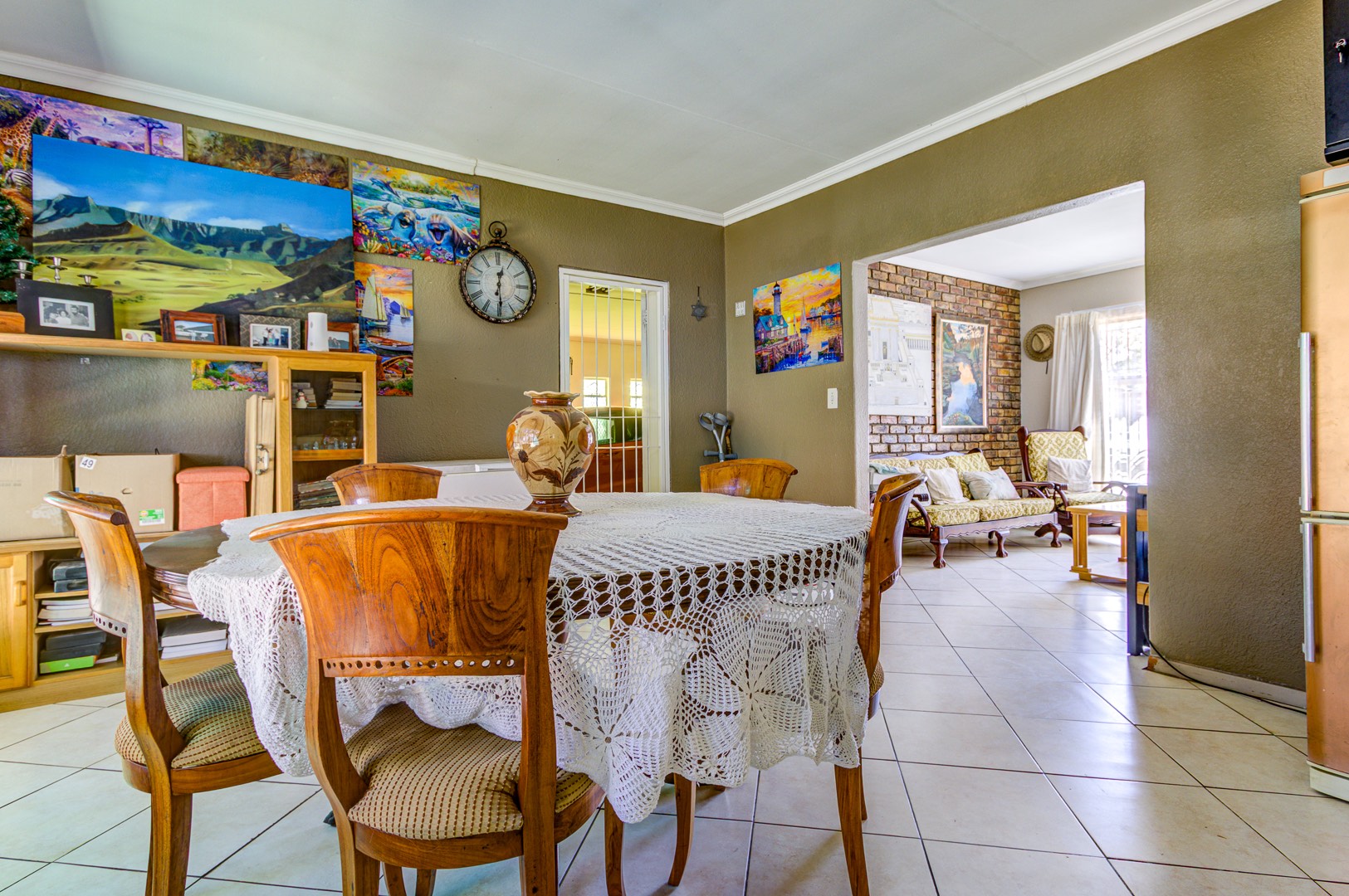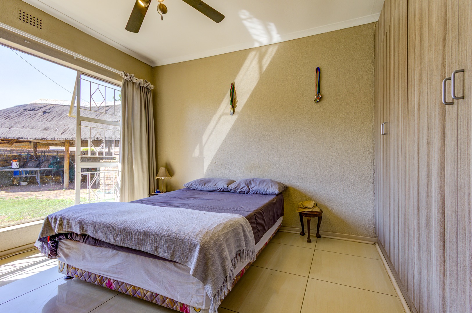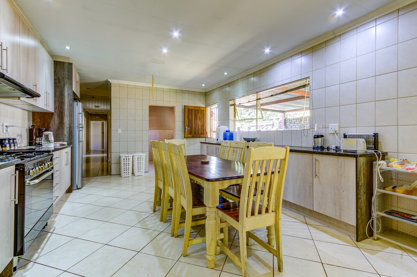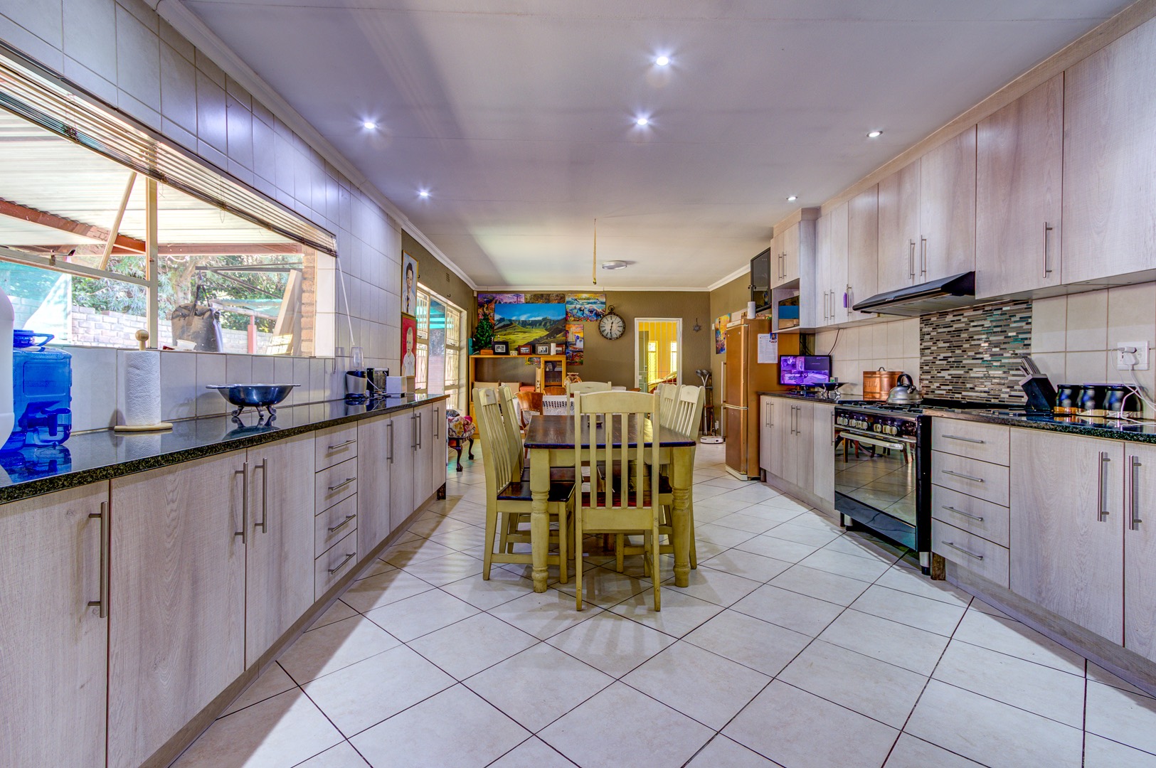Step inside and the heart of the home unfolds in one fluid sweep: a fully renovated, sun-filled dining room flowing into a stylish, stone-topped kitchen where modern fittings, crisp tiling, and ample cabinetry make both weekday meals and larger gatherings effortless. Slip through to the adjacent private lounge for an intimate conversation, or continue into an expansive family room where an overhead projector transforms movie nights into cinematic occasions. Glass doors pull back to a deep, covered patio that surveys the landscaped back garden, sparkling pool, built-in braai, and thatch-roof lapa—an entertainer’s axis whatever the season.