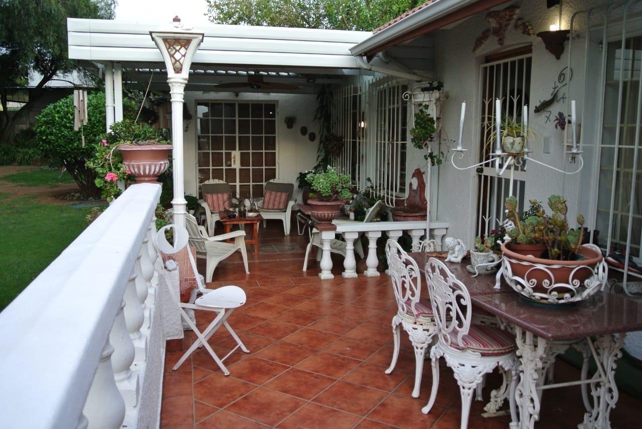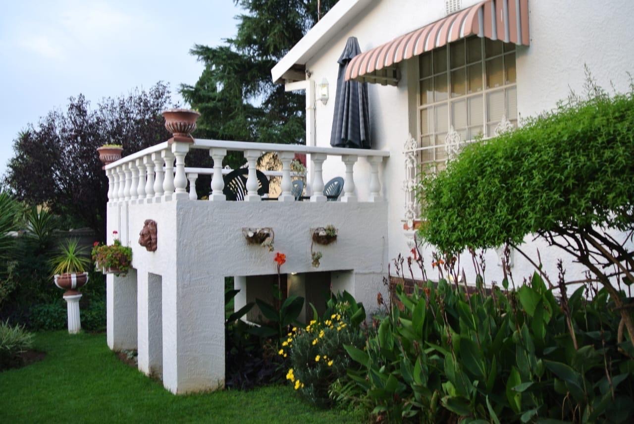 Wrap-around balcony overlooking a lush garden — a peaceful spot for morning coffee