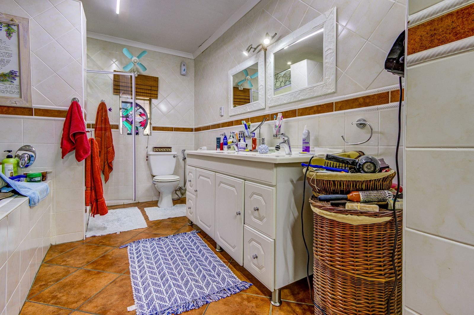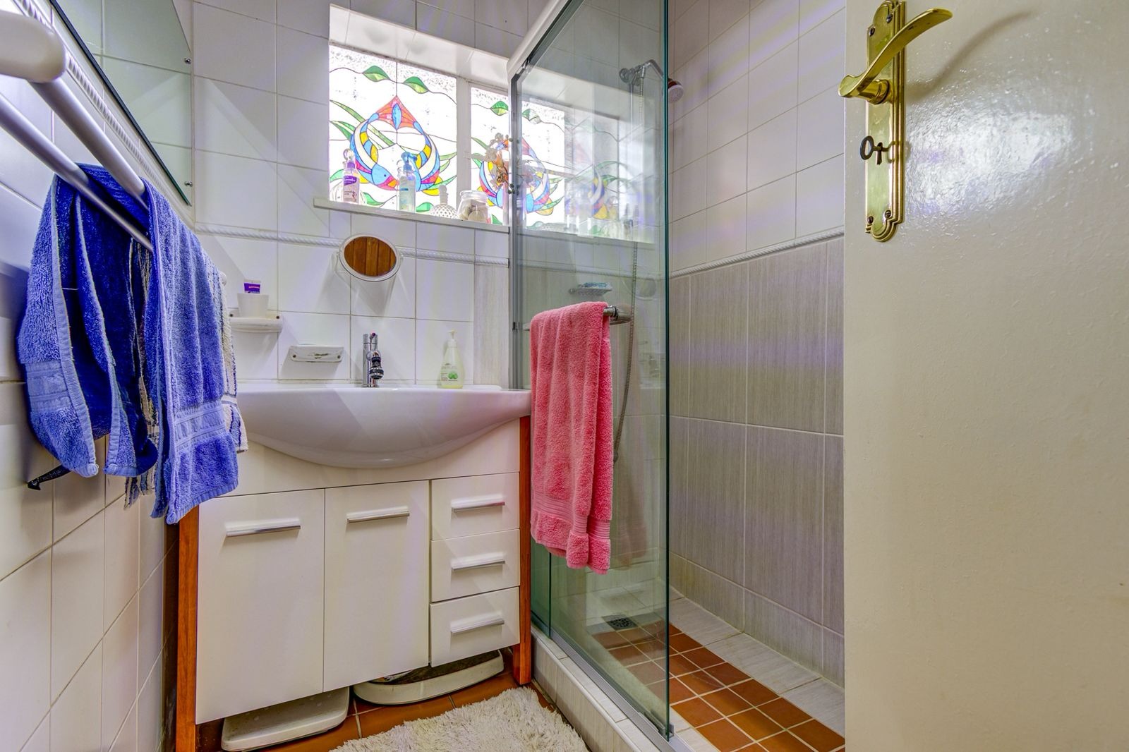 The home boasts 3 generously-sized bedrooms, including a luxurious main suite with its own pajama lounge, walk-in cupboards, and a spa-style en-suite bathroom featuring a double vanity, full bath, and shower. A second beautifully finished bathroom serves the rest of the home — complete with an eye-catching stained-glass window that adds a touch of artistry.