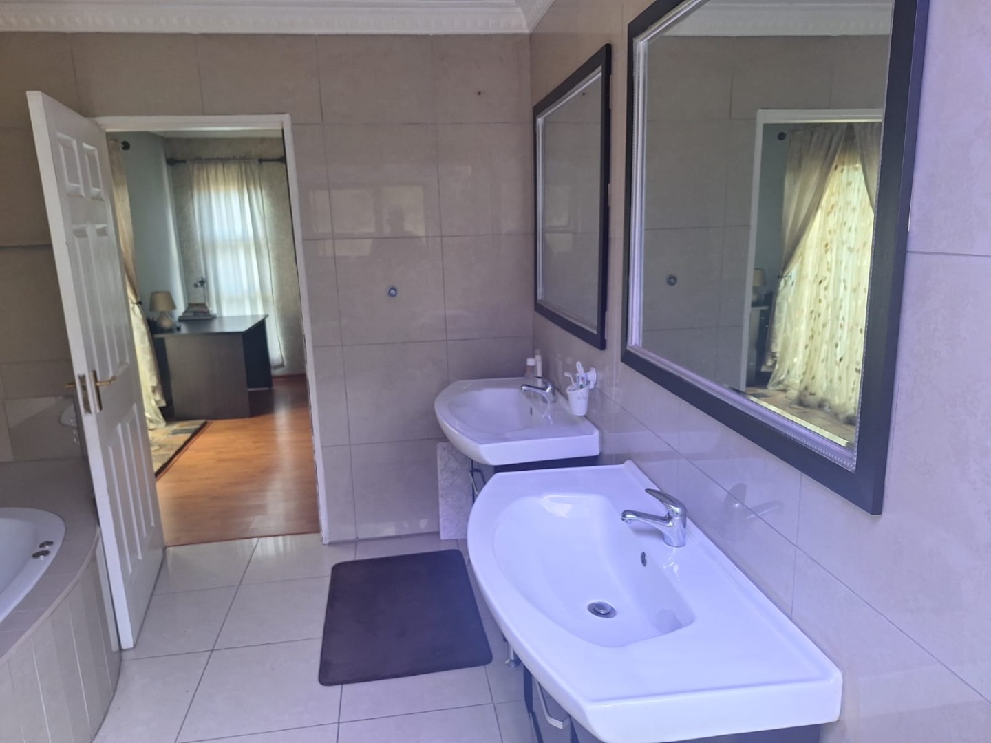 Nestled within the secure confines of Glen Erasmia, Kempton Park, this inviting 3-bedroom, 3-bathroom residence offers a spacious 274 sqm floor plan on a generous 703 sqm erf. The home's contemporary two-story design features a neutral-toned facade, an attractive wooden garage door, and a paved driveway, creating a welcoming curb appeal. Inside, the layout includes a dedicated lounge, a dining room, and a well-appointed kitchen, providing ample space for family living and entertaining. The property boasts three comfortable bedrooms, ensuring private retreats for all residents. With three bathrooms, including one en-suite, convenience is paramount. Each bathroom is functionally designed, featuring both a corner bathtub and a separate shower enclosure, along with tiled walls and floors for easy maintenance. Natural light filters through windows, enhancing the bright and airy feel of these essential spaces. Step outside to discover a private outdoor area, complete with high boundary walls and an electric fence for enhanced security. The garden features mature trees, tropical-style plants, and defined garden beds, offering potential for a lush oasis. A modern decorative water feature adds aesthetic appeal, while the paved driveway provides four parking spaces, including a single garage, catering to all your vehicle needs. Security is a key feature of this property, situated within a gated community with controlled access via boom gates and robust perimeter fencing. This ensures peace of mind for residents. Glen Erasmia is a desirable suburb in Kempton Park, South Africa, known for its residential tranquility and convenient access to local amenities and transport routes. Key Features: * 3 Bedrooms, 3 Bathrooms (1 en-suite) * Spacious 274 sqm floor size on 703 sqm erf * Secure gated community with boom gates and electric fencing * Modern two-story architectural design * Single garage and four parking spaces * Dedicated lounge, dining room, and kitchen * Private garden with mature trees and water feature * Paved driveway and attractive wooden garage door