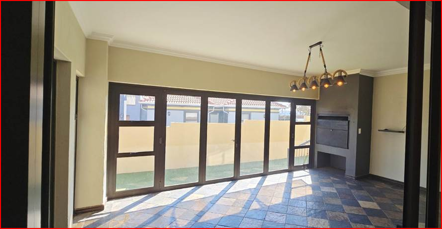 Designed for seamless indoor-outdoor living, the property features large glass sliding and bifold doors that open to various spaces. A bright entertainment area, possibly a sunroom, includes a built-in braai and distinctive checkered tiled flooring, perfect for hosting. The home comprises four well-proportioned bedrooms, with 3.5 bathrooms, including a private ensuite, offering comfort and privacy for the entire family.