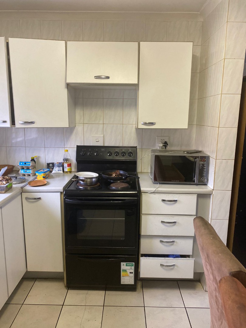 Inside, the 52 sqm unit offers a practical layout designed for comfortable living. The lounge area, featuring durable tiled flooring and neutral light grey walls, provides a versatile space for relaxation and entertainment. While currently furnished, the neutral palette allows for easy personalization to suit your style. The functional kitchen is equipped with white upper and lower cabinetry, a freestanding stove/oven, tiled walls and flooring for easy maintenance. A double sink and a window providing natural light enhance the practicality of this space.