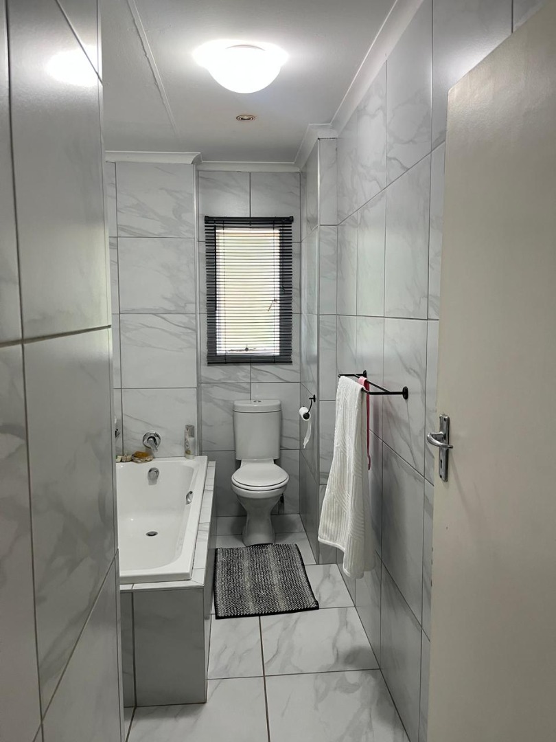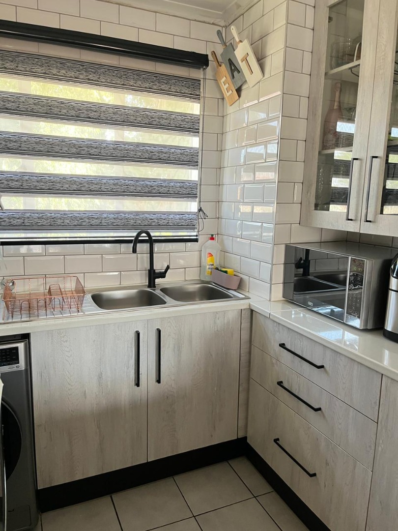 Discover secure living in this inviting 2-bedroom, 2-bathroom apartment within the well-maintained Avonlea complex. The property offers robust gated access and an electric fence, ensuring peace of mind. Step inside to an open-plan living and kitchen area, designed for modern convenience. The kitchen boasts contemporary light wood-grain cabinets, white countertops, and a striking black and white checkered backsplash. Integrated appliances include an oven, hob, extractor fan, double sink, and space for a washing machine, making it perfect for daily living. This apartment features two comfortable bedrooms, including one with an ensuite bathroom, providing privacy. The main bedroom offers a stylish navy blue upholstered headboard and tiled flooring. Both bathrooms are finished with modern white and grey marble-look tiles, featuring a clean bathtub in one and a contemporary rainfall shower head in the other. Residents benefit from excellent communal amenities, including a large swimming pool and a clubhouse, ideal for leisure and social gatherings. Two dedicated parking bays are also provided. Situated in the desirable suburb of Glen Marais, Kempton Park, this property offers a prime location in South Africa, known for its accessibility and balanced lifestyle. Key Features: * 2 Bedrooms, 2 Bathrooms (1 ensuite) * Open-plan living and kitchen * Modern kitchen with integrated appliances * Secure gated complex with electric fence * Communal swimming pool and clubhouse * Two dedicated parking bays * Located in Glen Marais, Kempton Park