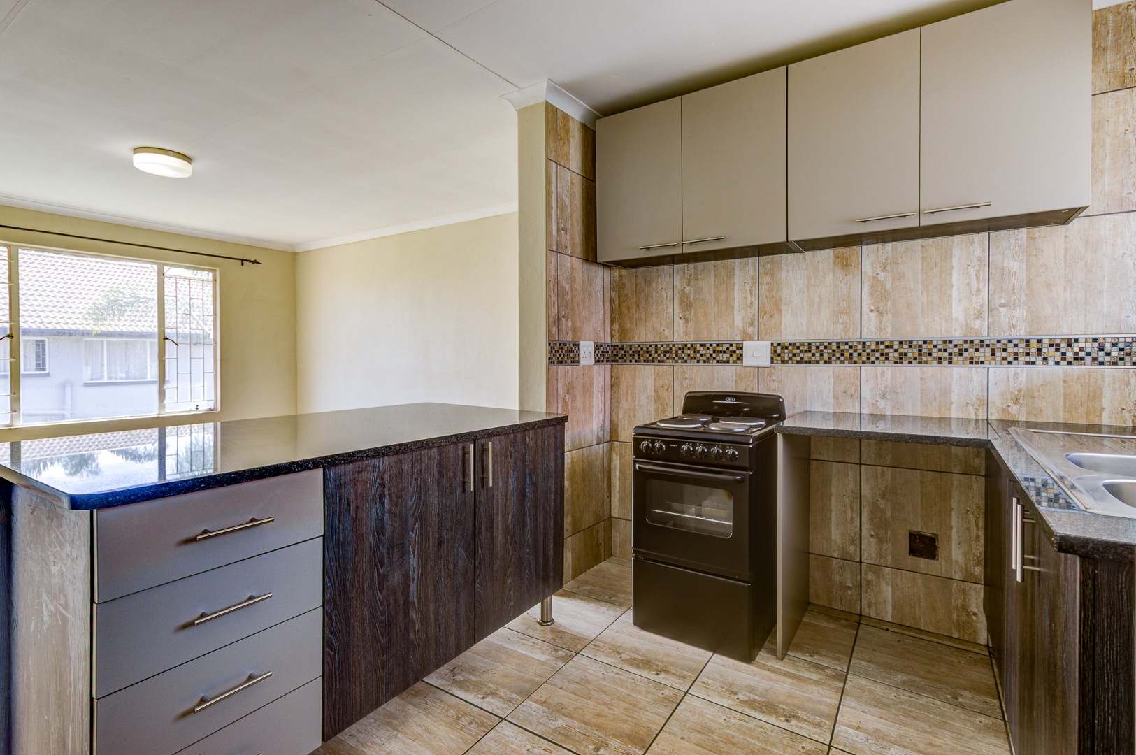 Open-plan lounge and kitchen with modern granite countertops