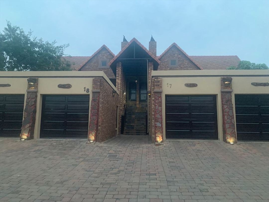 Outdoor living is enhanced by a covered patio, perfect for entertaining with its built-in braai and ample space for dining. The property boasts a multi-level design with a distinctive brick, stone, and tiled roof aesthetic, complemented by well-maintained paving and modern garage doors. Ample covered parking is provided by two integrated garages. Pets are permitted, adding to the home's appeal.