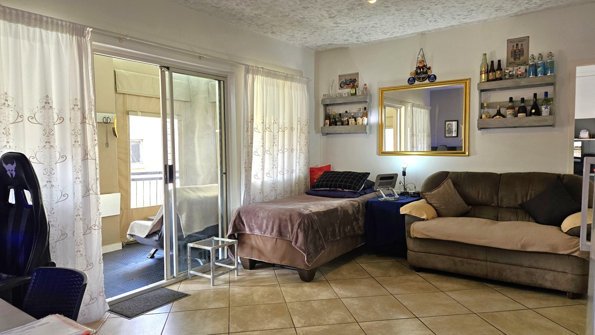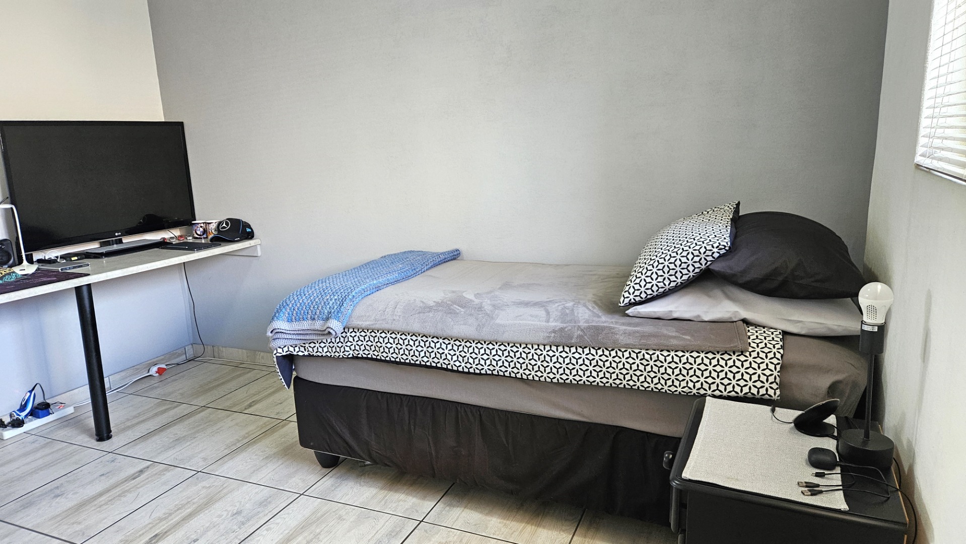 There are 2 bedrooms with tiled floors, built-in cupboards and built-in study desks.