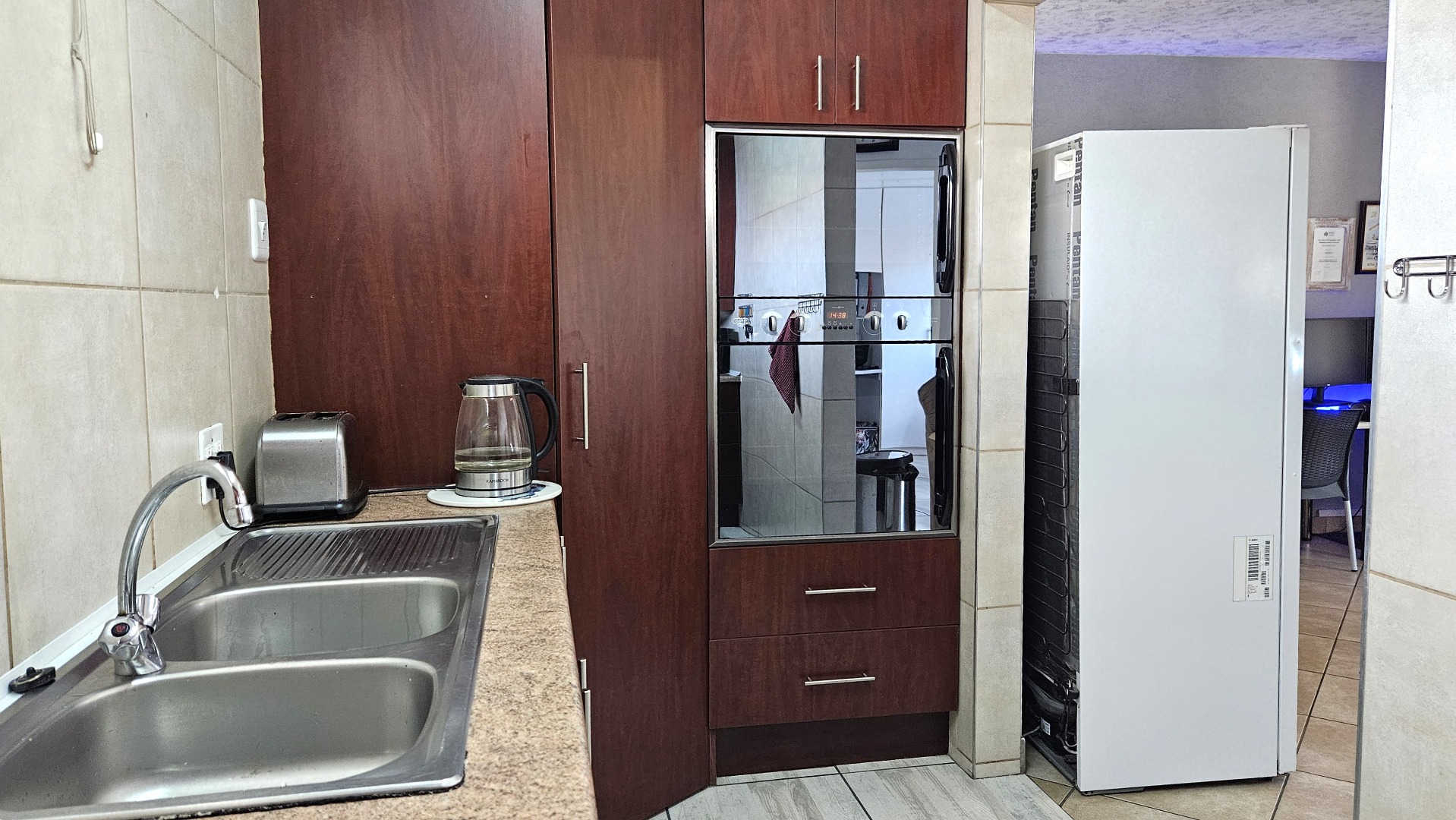 The neat Melamine kitchen features a double eye level oven, hob, pantry cupboard and space for 1 appliance.