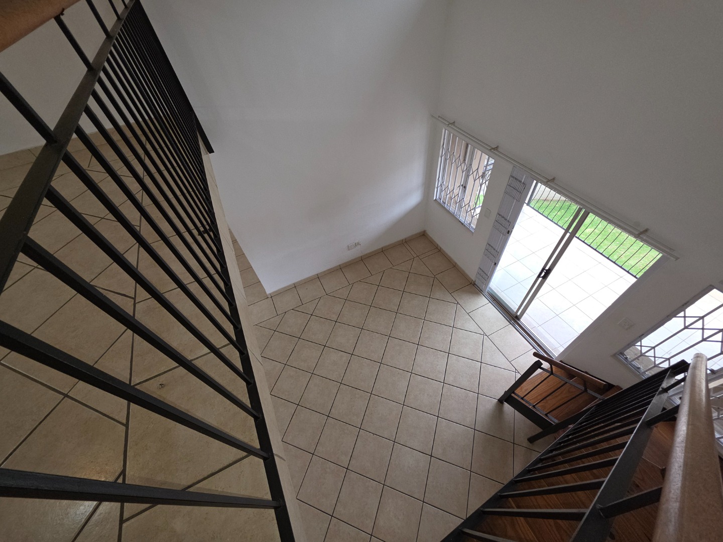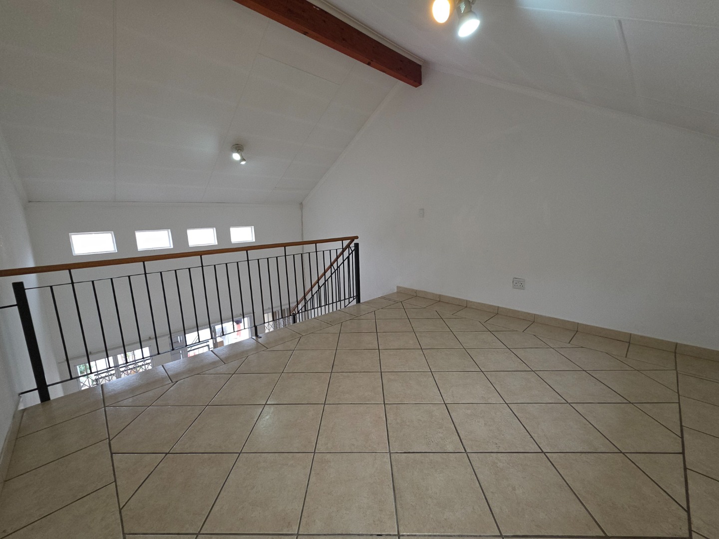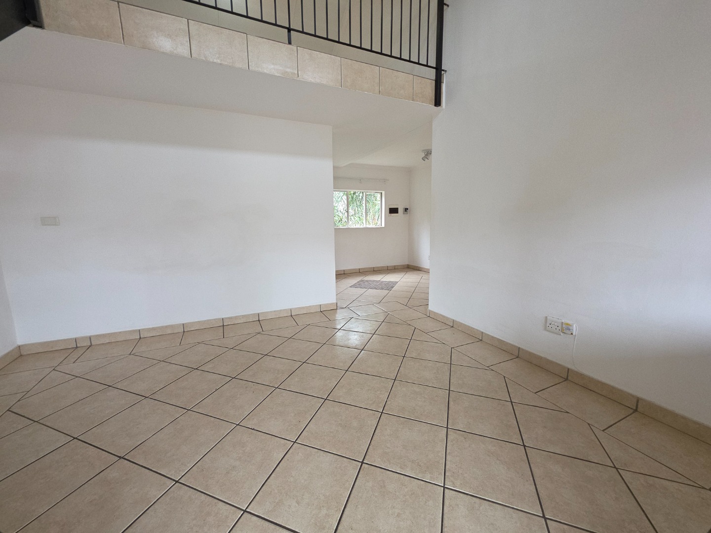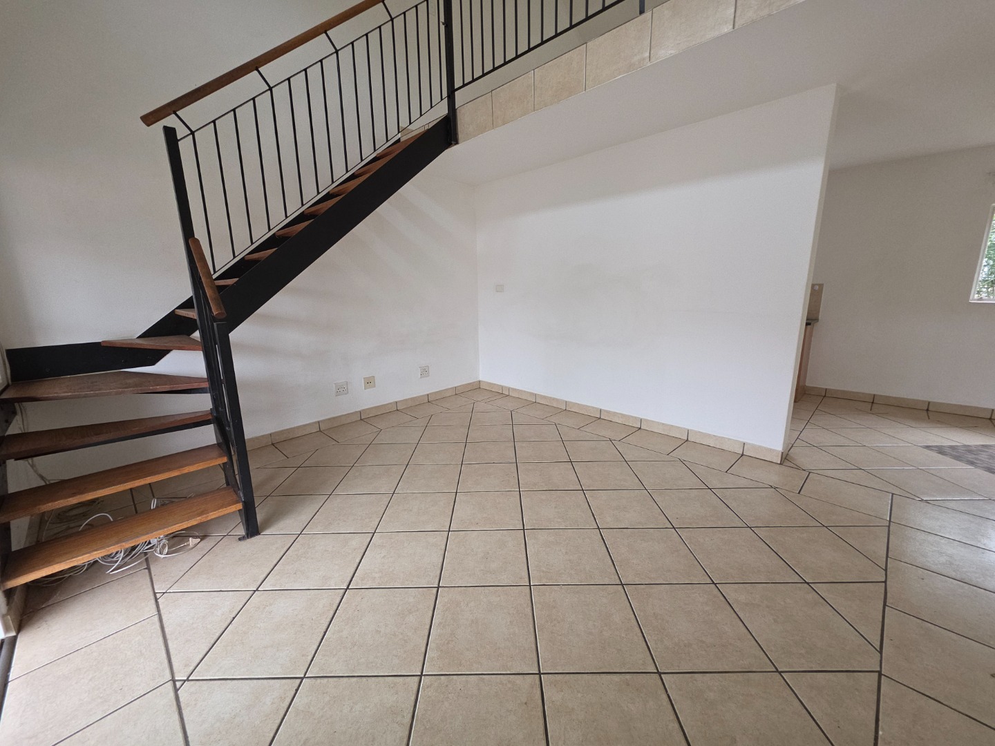 Spanning 120 square metres, this unfurnished apartment boasts an open-plan layout with neutral white walls and durable tiled flooring throughout, providing a versatile canvas for personalisation. The living space includes two lounges, one of which features a unique tiled/loft area, adding architectural interest and flexible usage options. A modern industrial-style staircase with wooden treads connects the levels, enhancing the contemporary feel.