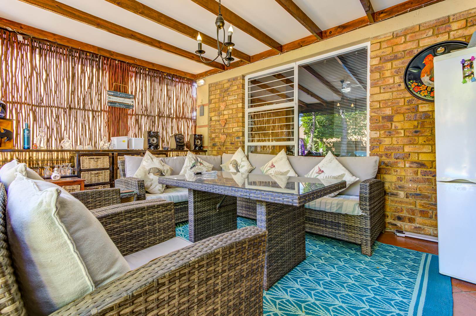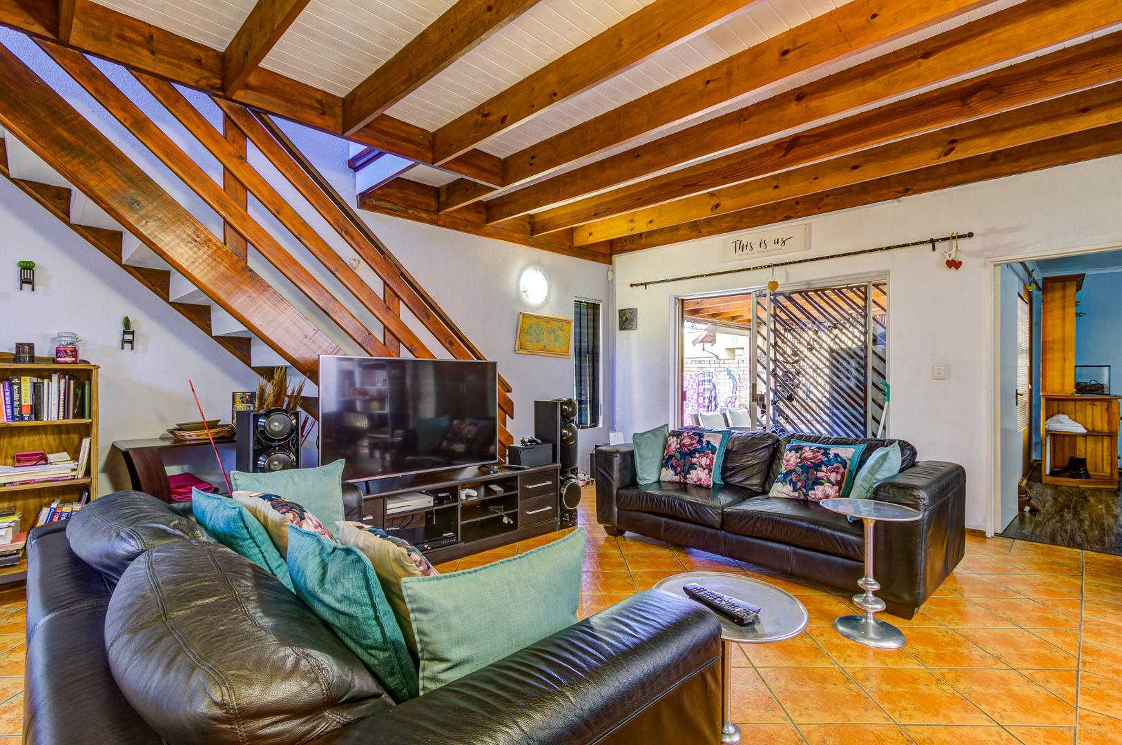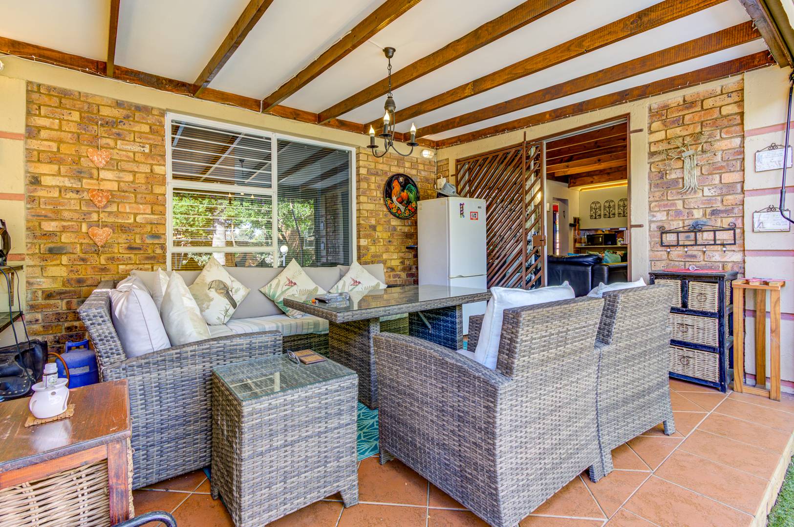 The lounge opens effortlessly onto a covered patio, ideal for relaxing with a morning coffee or enjoying evening sundowners while overlooking the sparkling pool area—your own private oasis for those warm summer days.