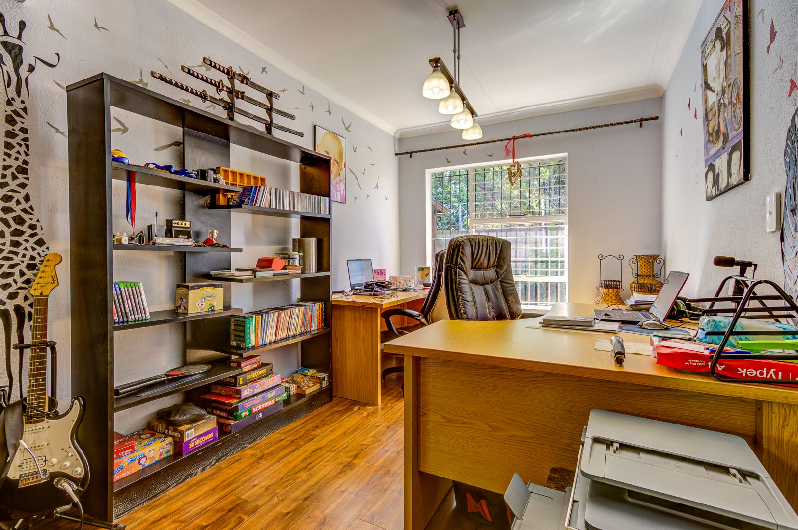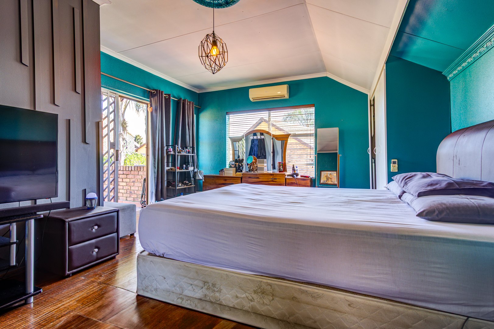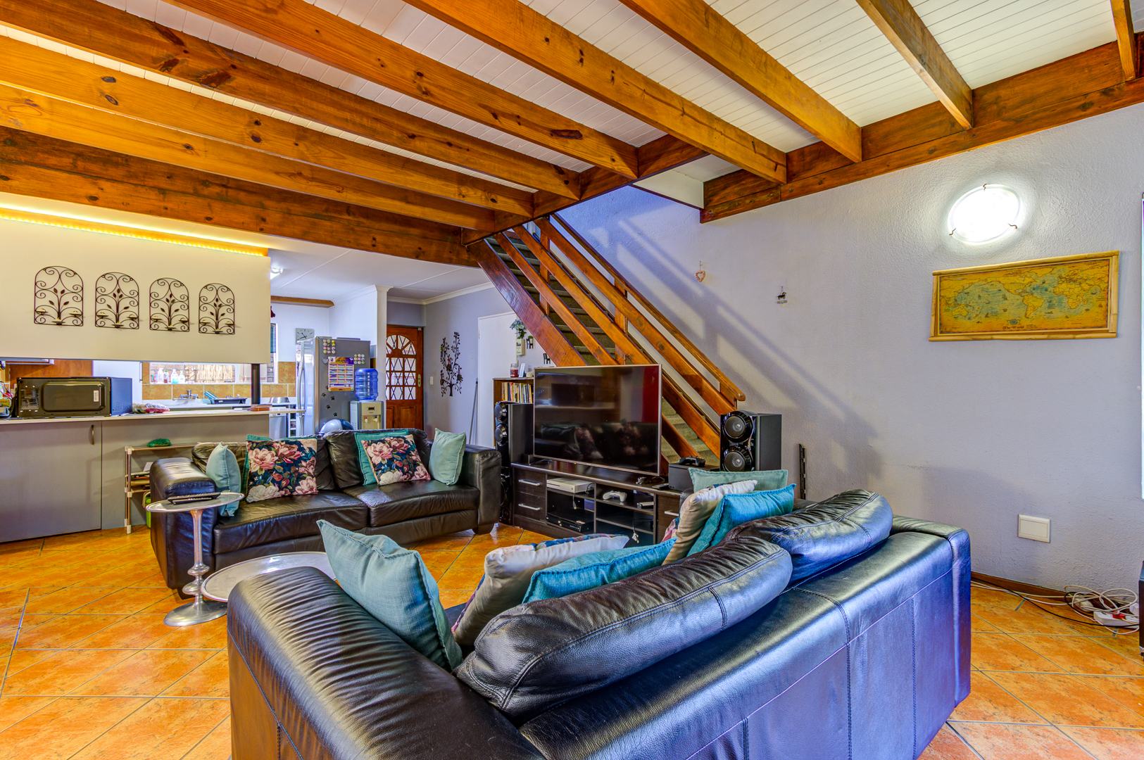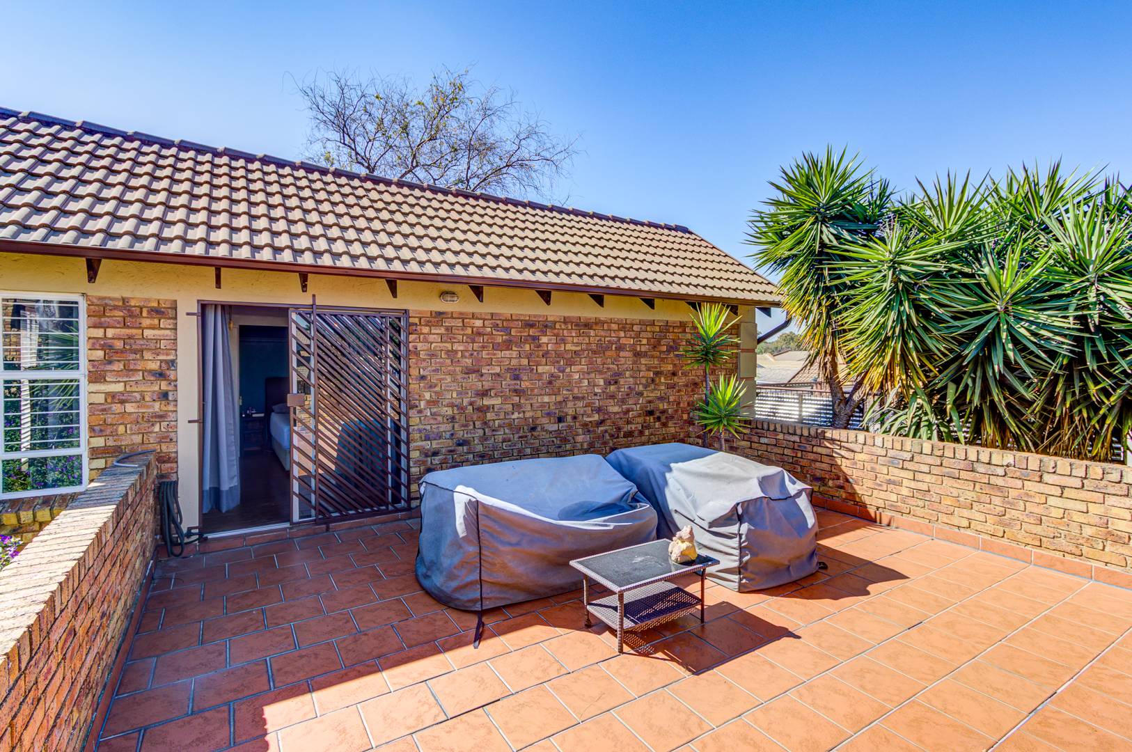 The lounge opens effortlessly onto a covered patio, ideal for relaxing with a morning coffee or enjoying evening sundowners while overlooking the sparkling pool area—your own private oasis for those warm summer days.