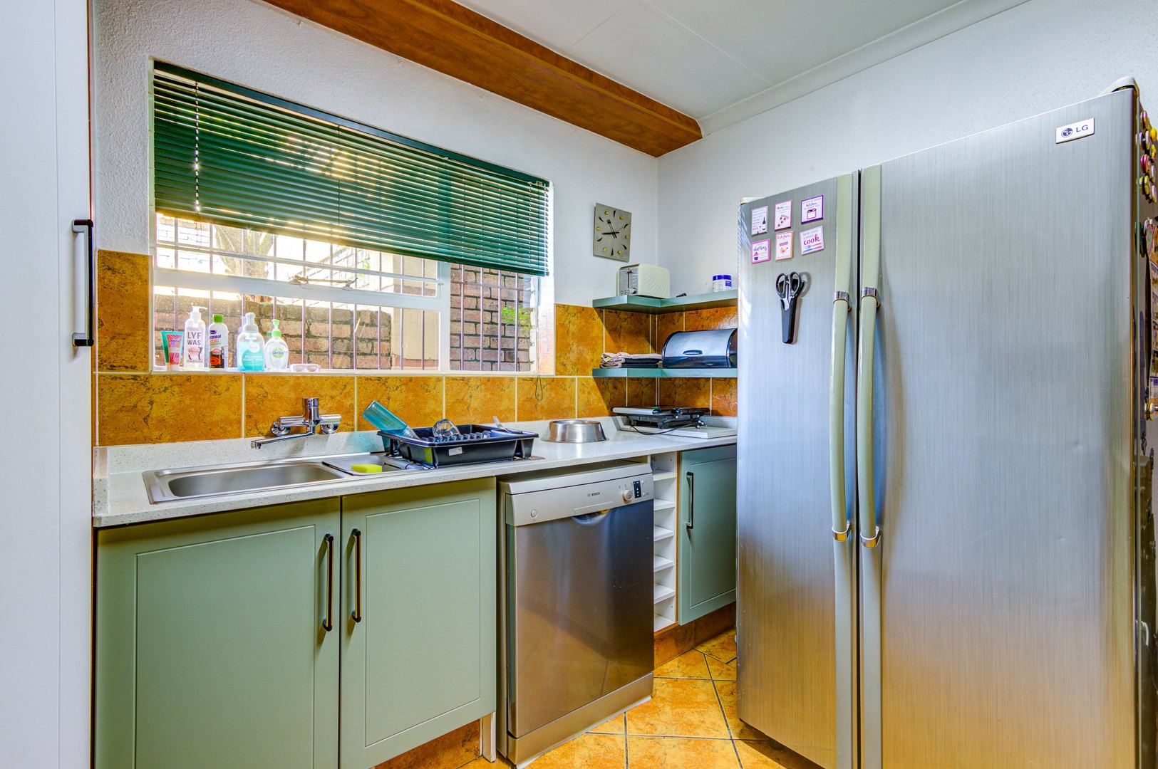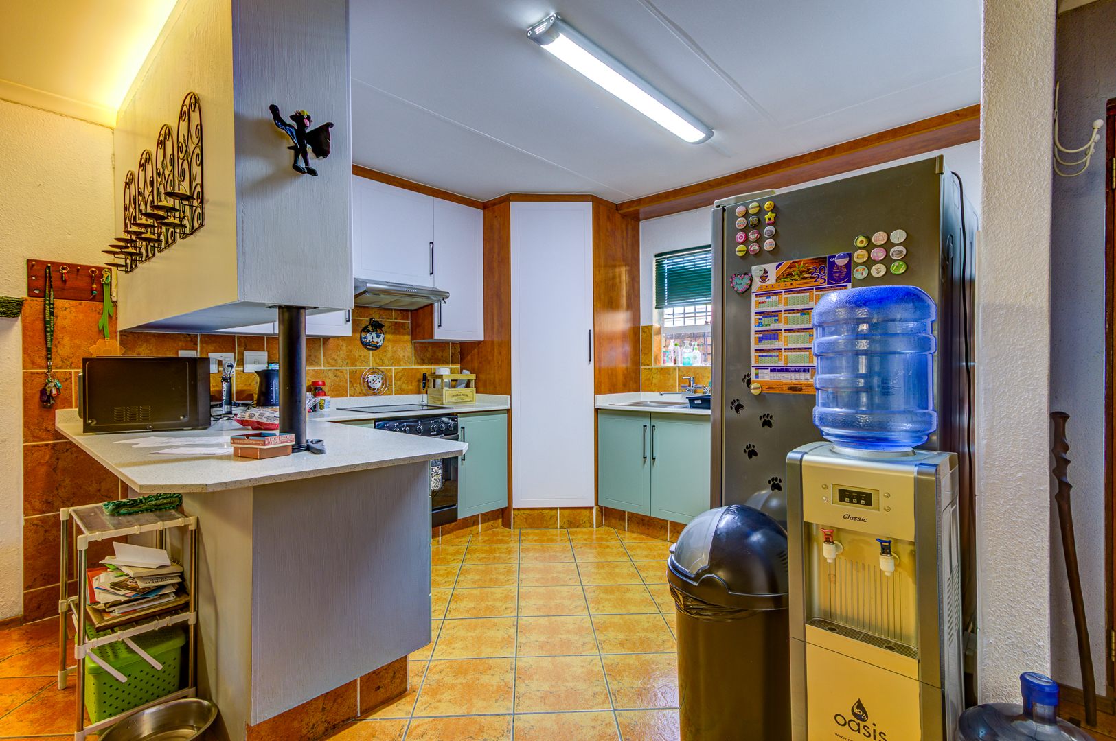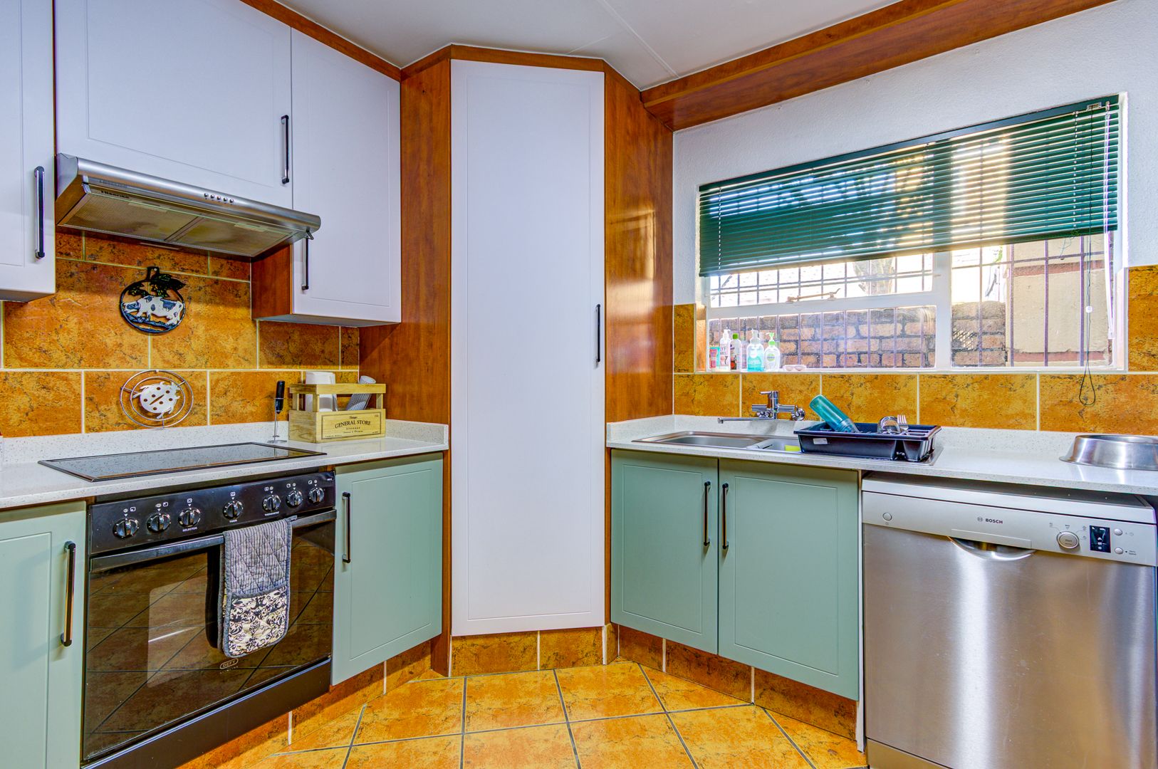 The double automated garage is tiled and fitted with built-in cupboards, providing not only secure parking but also excellent additional storage and a polished finish.
