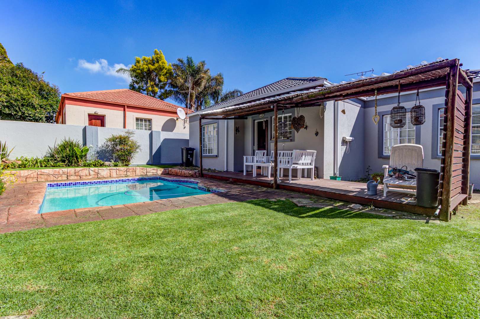 - A sparkling pool and cozy patio make this the ultimate relaxation and entertainment space.