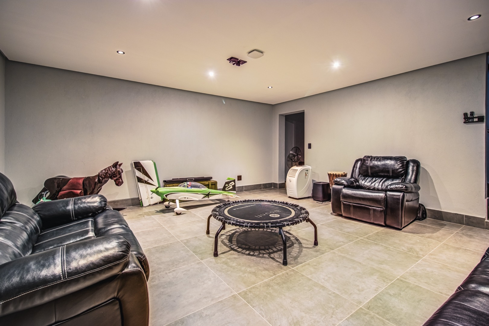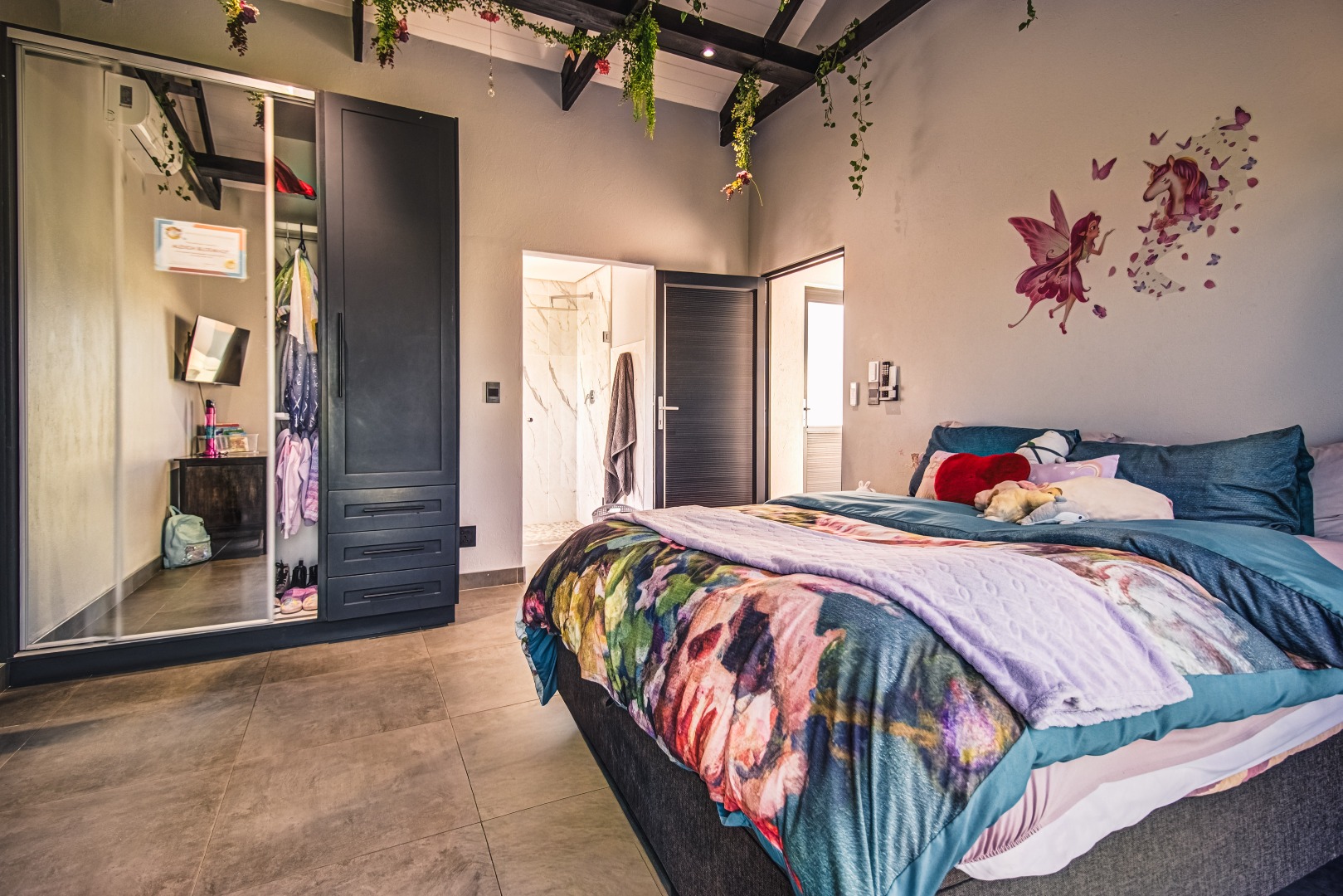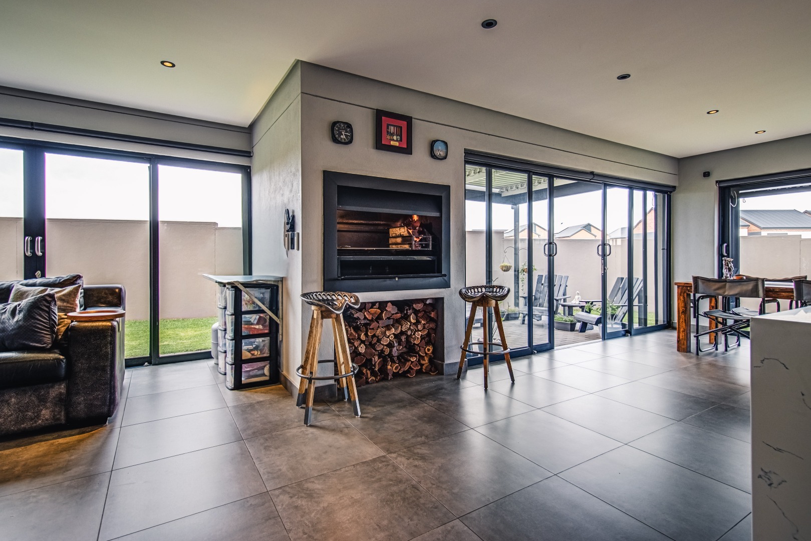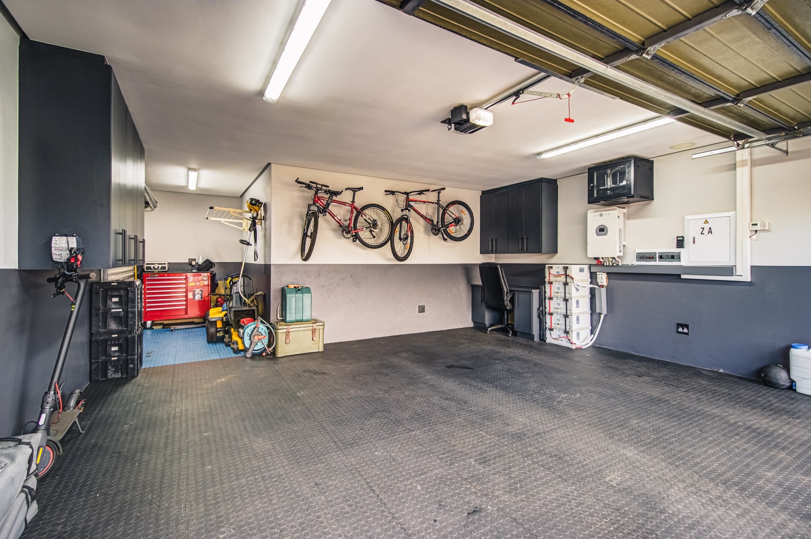 Outdoor living is equally inviting, with large sliding glass doors leading to a private patio area complete with a built-in braai, perfect for entertaining. The property includes a well-maintained garden and staff quarters. Parking is ample with two garages and additional space for a trailer and motorbike with direct access to your home. For enhanced comfort, the home is equipped with air conditioning and automated blinds.