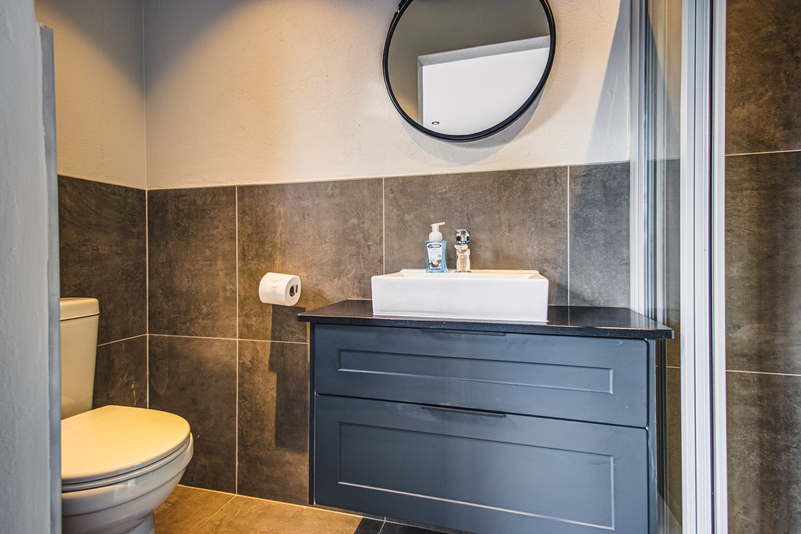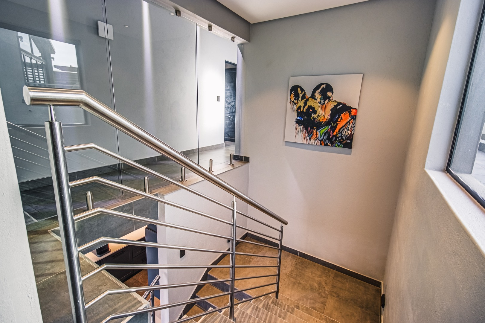 This impressive residence offers three spacious bedrooms, each designed for privacy and relaxation. With five bathrooms, including three luxurious en-suites and a convenient guest toilet, the home provides exceptional comfort for residents and guests alike. Modern finishes extend throughout, complemented by contemporary lighting fixtures and a stylish staircase with metal railings, adding architectural interest.