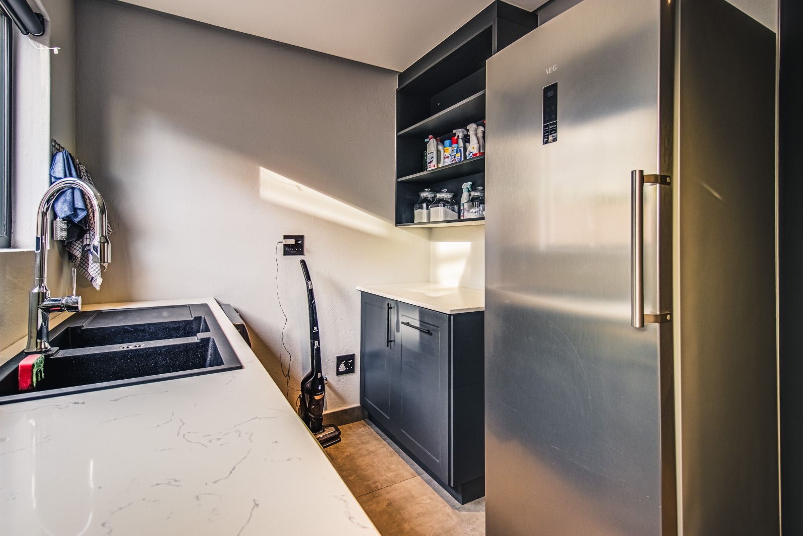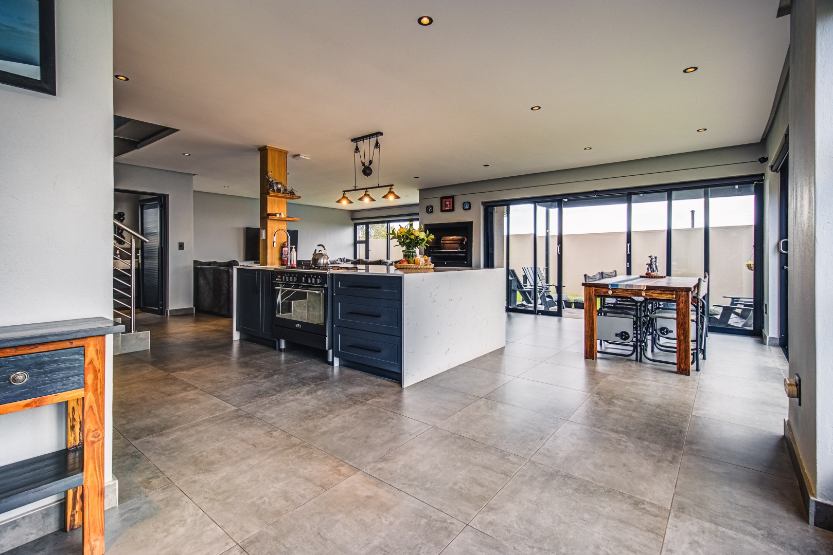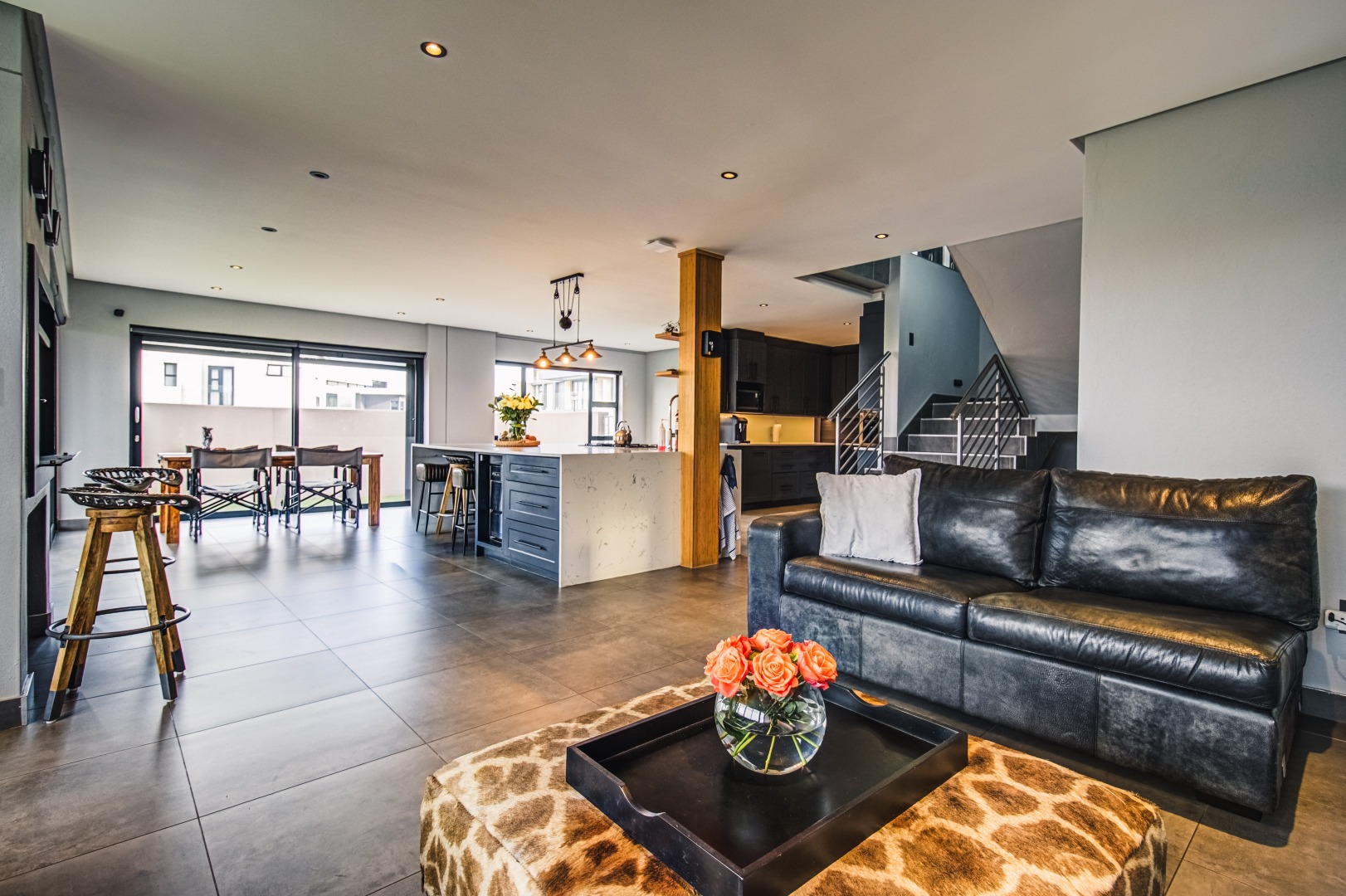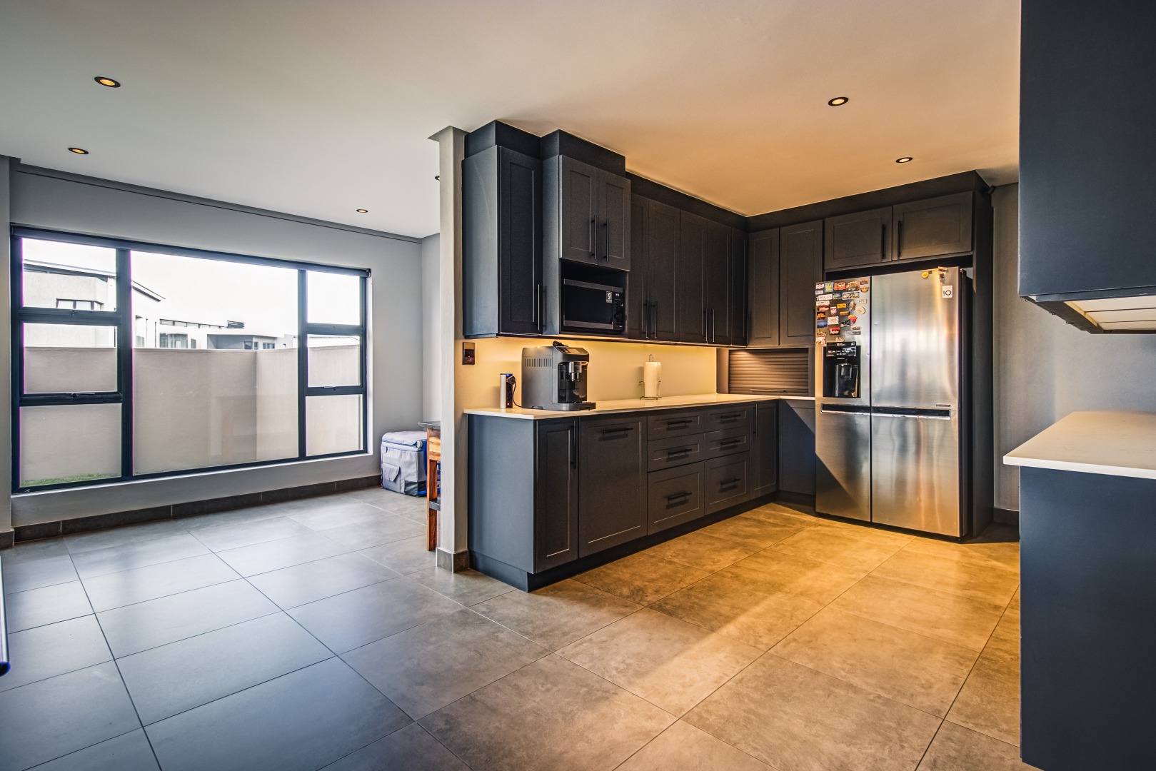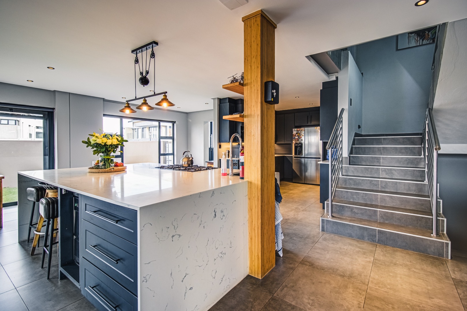 Discover modern living in this sophisticated residential sale property located within a secure estate in Glen Marais, Kempton Park, South Africa. Spanning a generous 328 sqm floor size and 3 levels on a 409 sqm erf, this home is designed for contemporary comfort and style. The interior boasts an expansive open-plan layout, seamlessly connecting the living, dining, and kitchen areas. The state-of-the-art kitchen features sleek dark cabinetry, pristine white marble-patterned countertops, a large central island with an integrated gas hob and seating, and high-end stainless steel appliances including a range cooker and integrated ice machine. Ample storage, under-cabinet lighting, and durable grey tile flooring enhance both functionality and aesthetic appeal.