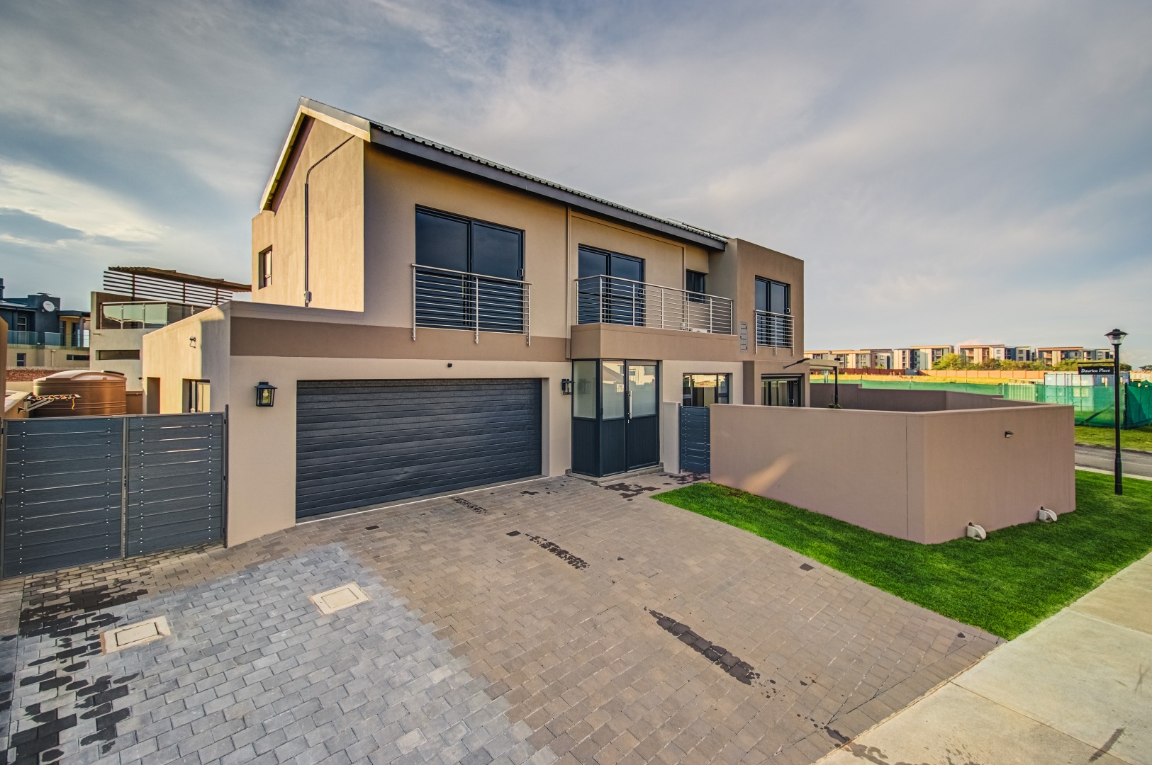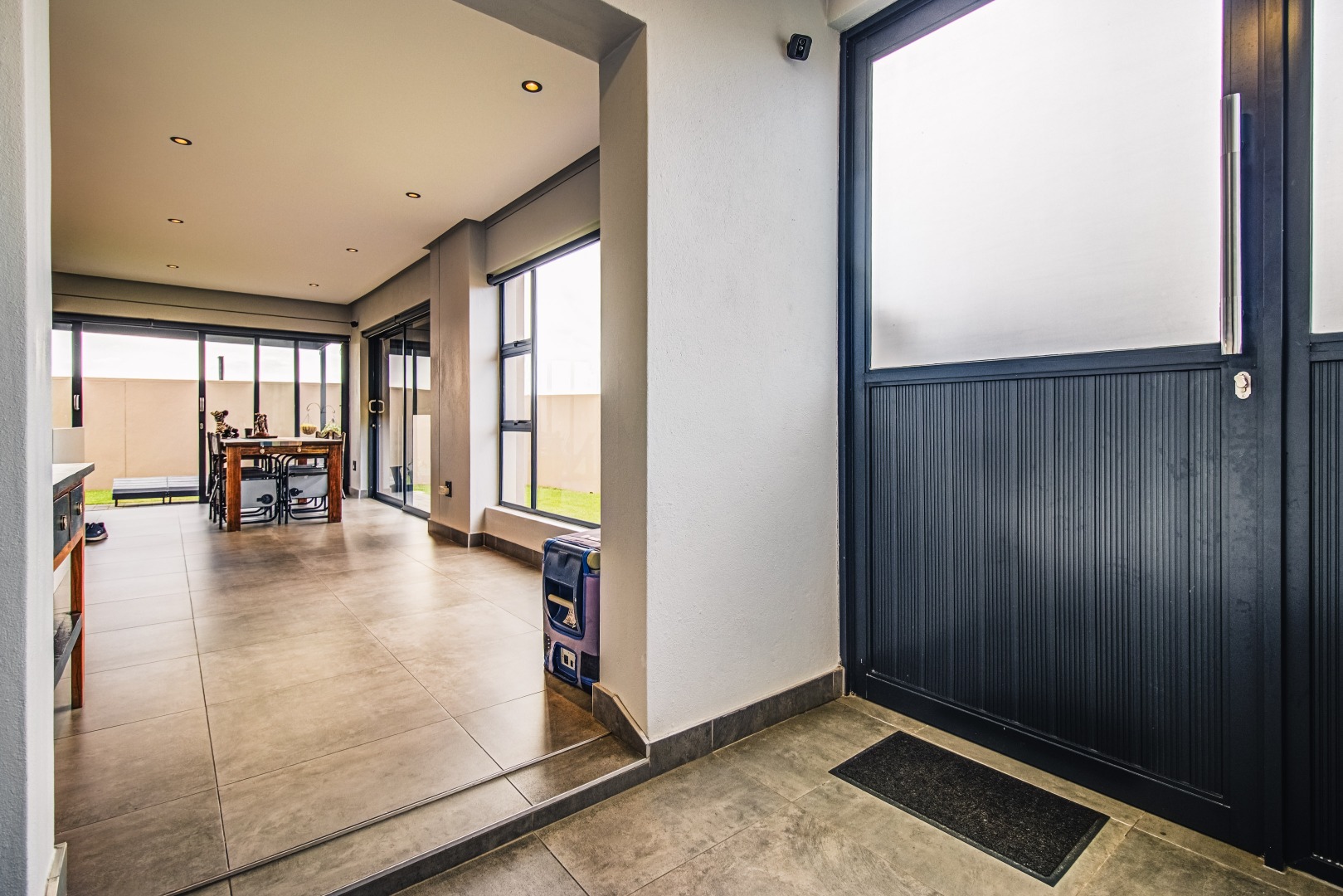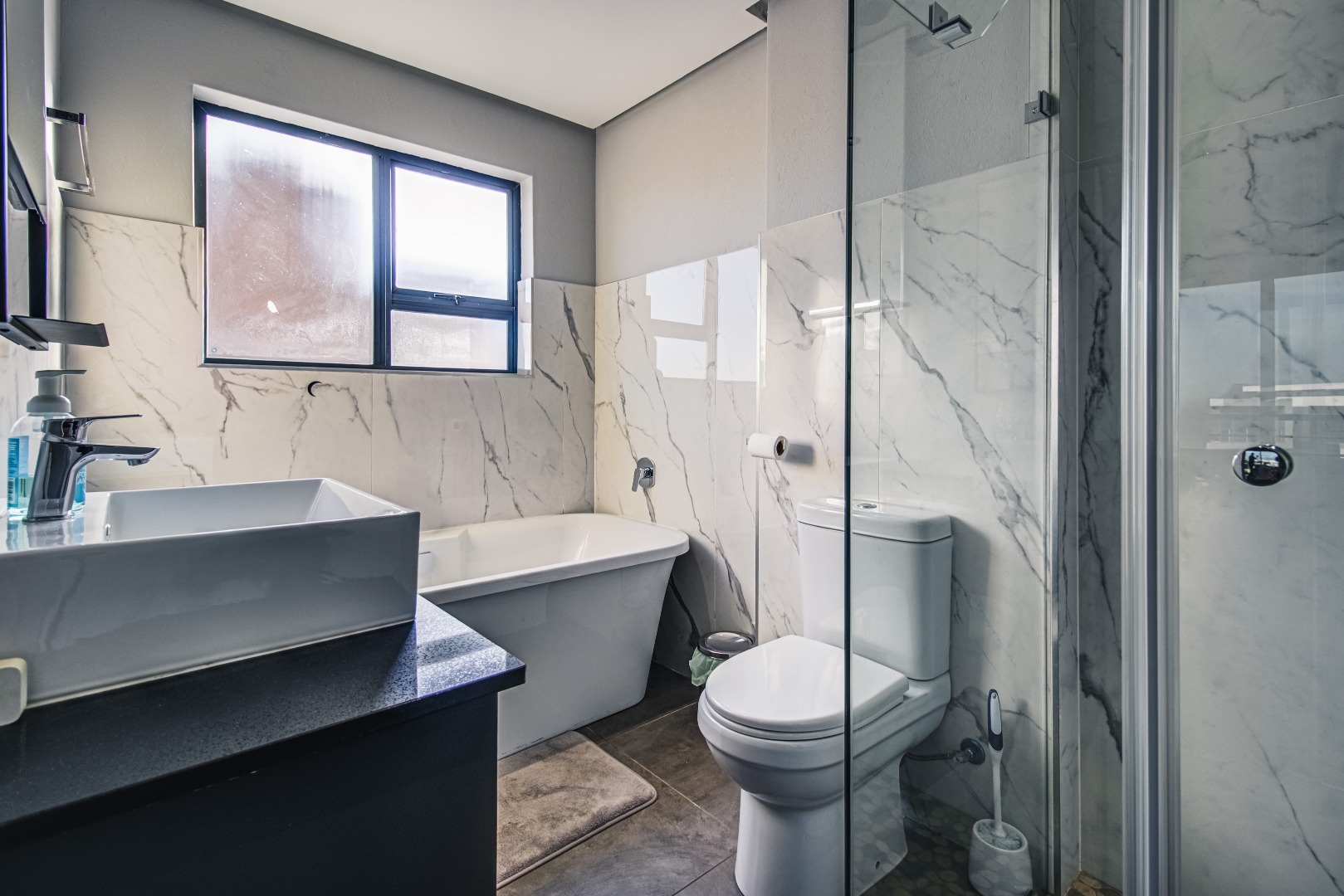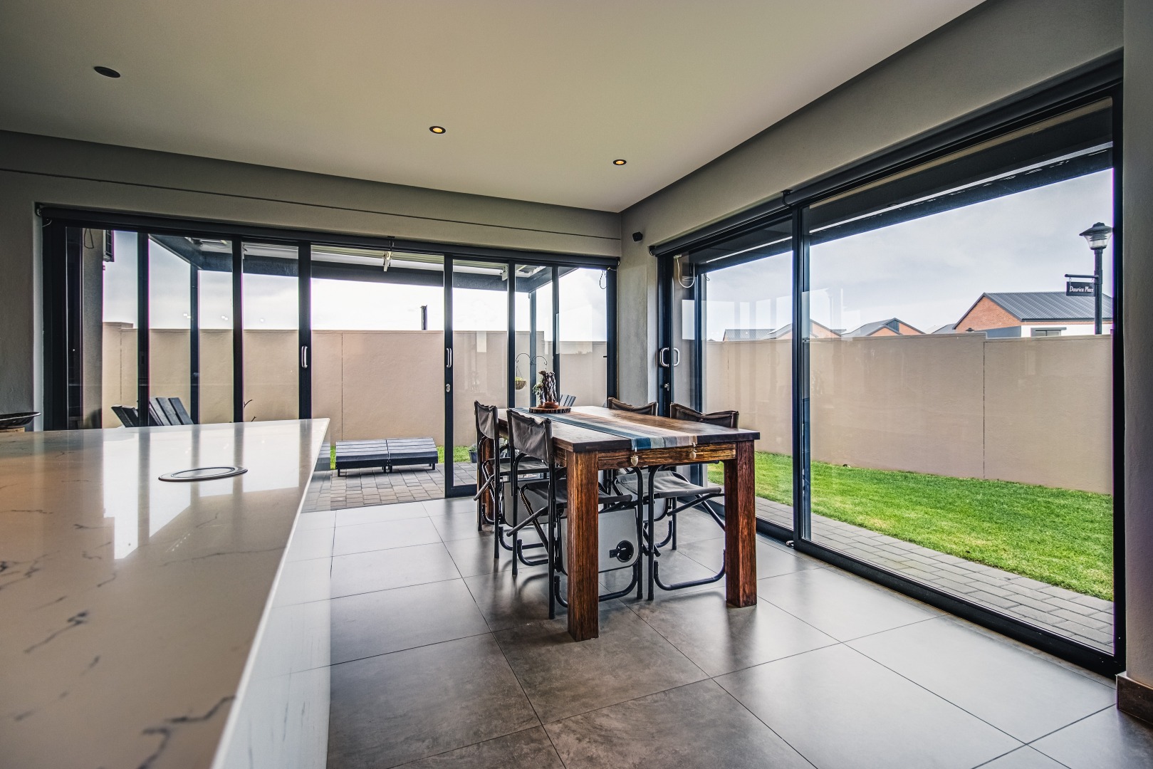 Discover modern living in this sophisticated residential sale property located within a secure estate in Glen Marais, Kempton Park, South Africa. Spanning a generous 328 sqm floor size and 3 levels on a 409 sqm erf, this home is designed for contemporary comfort and style. The interior boasts an expansive open-plan layout, seamlessly connecting the living, dining, and kitchen areas. The state-of-the-art kitchen features sleek dark cabinetry, pristine white marble-patterned countertops, a large central island with an integrated gas hob and seating, and high-end stainless steel appliances including a range cooker and integrated ice machine. Ample storage, under-cabinet lighting, and durable grey tile flooring enhance both functionality and aesthetic appeal.