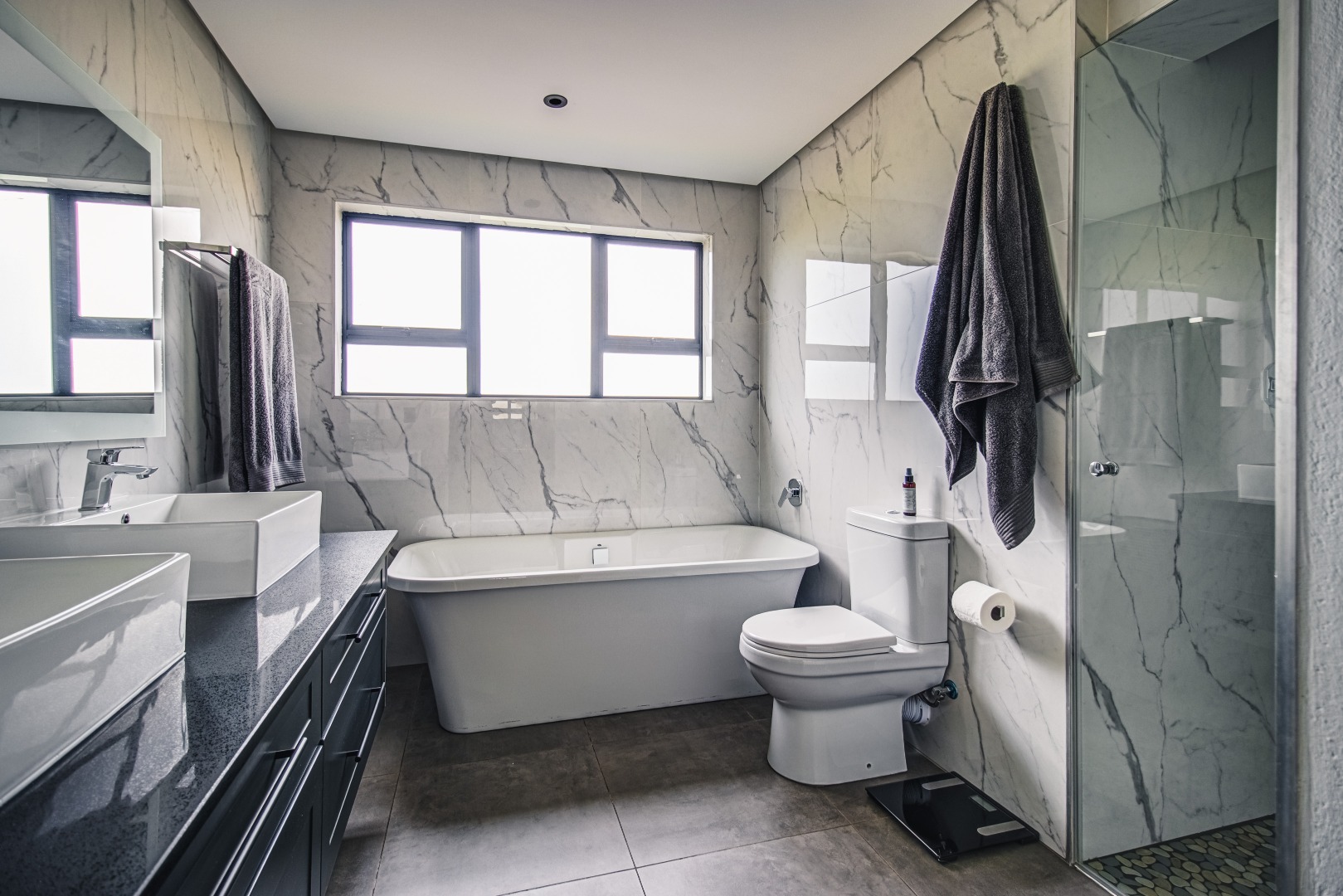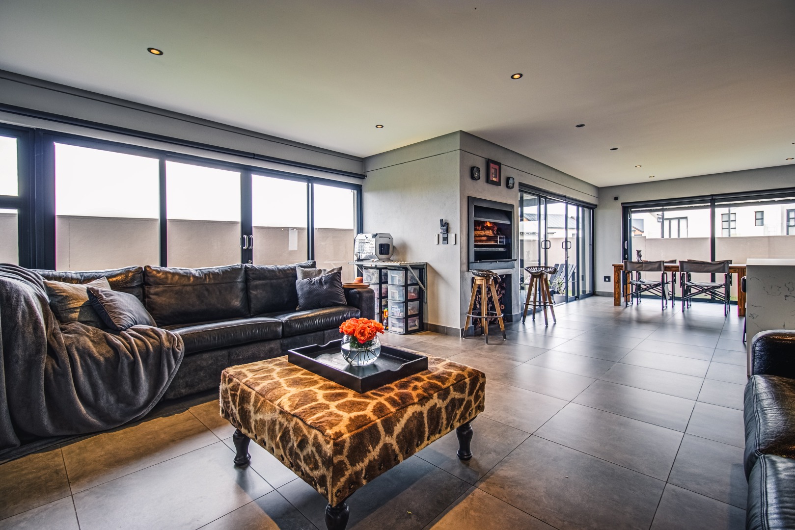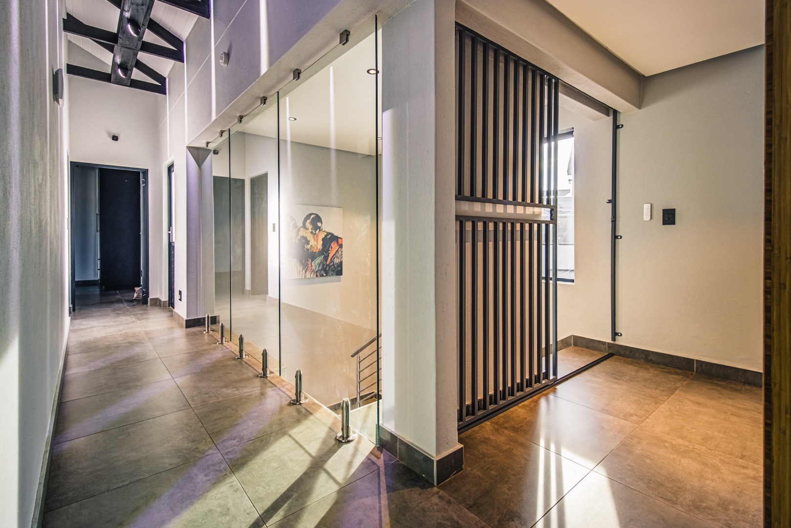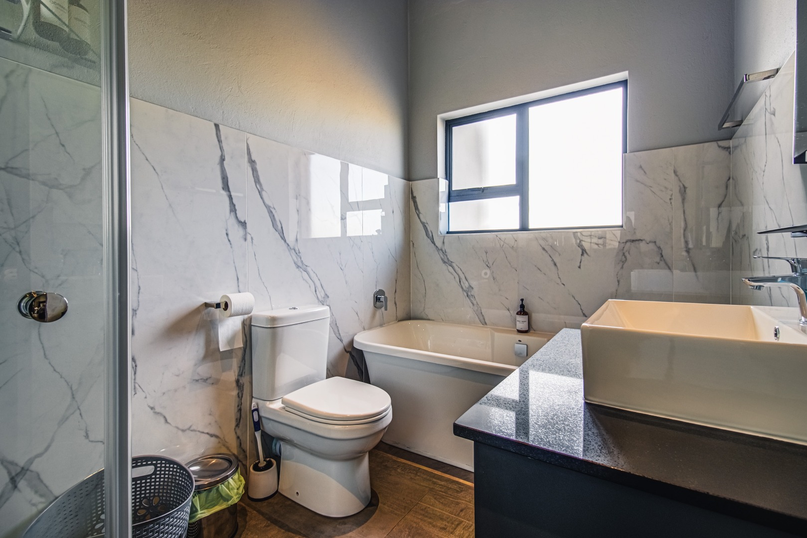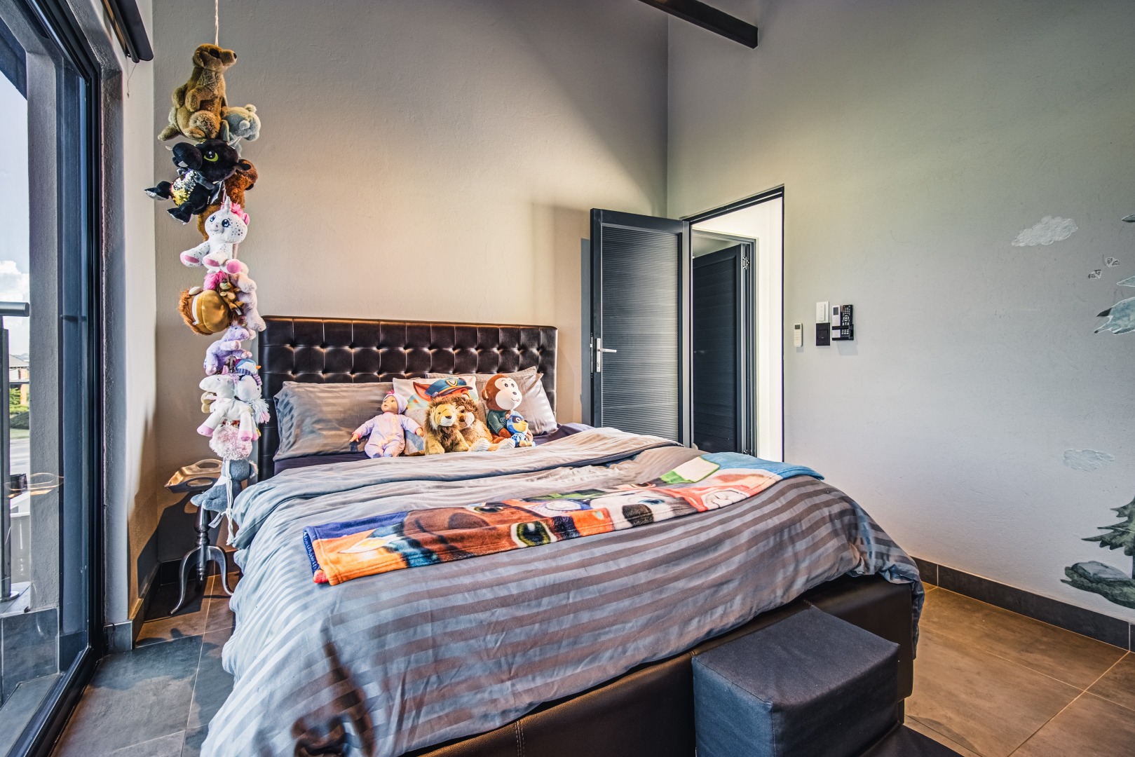 Discover modern living in this sophisticated residential sale property located within a secure estate in Glen Marais, Kempton Park, South Africa. Spanning a generous 328 sqm floor size and 3 levels on a 409 sqm erf, this home is designed for contemporary comfort and style. The interior boasts an expansive open-plan layout, seamlessly connecting the living, dining, and kitchen areas. The state-of-the-art kitchen features sleek dark cabinetry, pristine white marble-patterned countertops, a large central island with an integrated gas hob and seating, and high-end stainless steel appliances including a range cooker and integrated ice machine. Ample storage, under-cabinet lighting, and durable grey tile flooring enhance both functionality and aesthetic appeal.