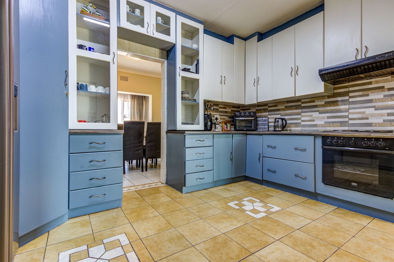 Step inside to find a thoughtfully designed interior featuring practical tiled flooring throughout the main living areas. The home offers a comfortable lounge and a dedicated dining room, perfect for family gatherings. The kitchen, equipped with a mix of blue and white cabinetry and a modern feel, provides ample storage and functionality, including a built-in oven and hob. An integrated laundry area adds to the home's convenience, alongside a built-in bar for entertaining.