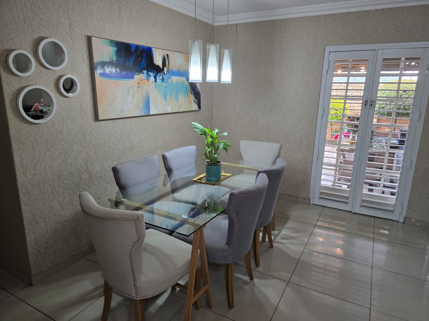 This meticulously maintained townhouse, situated within a secure complex in Glen Marais, Kempton Park, South Africa, presents an exceptional residential opportunity. The property immediately conveys a sense of security and order, featuring a robust gated entrance, durable brick construction, and well-kept landscaping. An integrated ADT security system and a double garage further enhance its appeal and functionality, providing ample parking for up to four vehicles. Spanning 142 square meters, the interior is thoughtfully designed for contemporary living. The lounge area boasts sleek tiled flooring, an accent wallpaper feature, and recessed lighting, creating an inviting ambiance. A prominent fireplace offers a focal point and potential heating. The functional galley-style kitchen is equipped with light-colored cabinetry, granite-look countertops, an integrated gas hob and oven, and tiled floors, accommodating essential appliances such as a washing machine and large refrigerator. Accommodation comprises three well-proportioned bedrooms and two bathrooms, providing ample space for residents. The property extends its living experience outdoors with a private patio and a garden area, ideal for relaxation. Practical elements include a paved side path, additional security gates, and a water storage tank, contributing to both convenience and potential water conservation. Ensuring peace of mind, the residence benefits from its location within a security complex, complemented by robust perimeter security and individual unit features. Modern connectivity is assured with fibre infrastructure readily available. Glen Marais, a desirable suburb within Kempton Park, offers convenient access to local amenities and transport routes, making it an attractive location for discerning homeowners. Key Features: * Three Bedrooms, Two Bathrooms * Double Garage, Four Parking Spaces * 142 sqm Floor Size * Secure Complex Environment * Fibre Connectivity * Private Patio and Garden * Integrated Gas Hob and Oven * Water Storage Tank